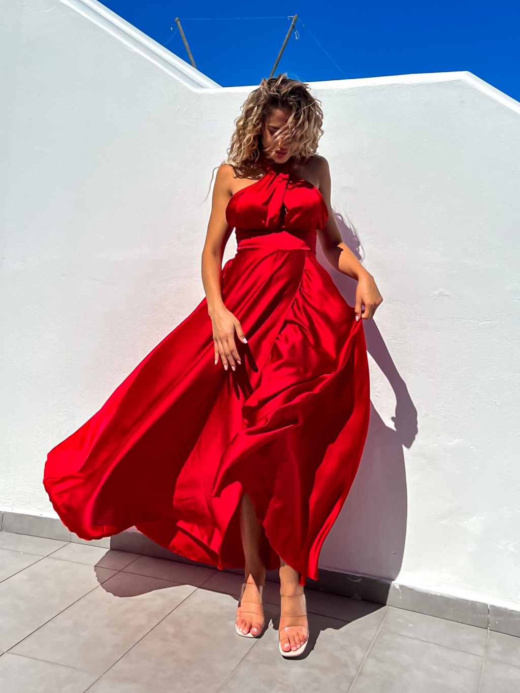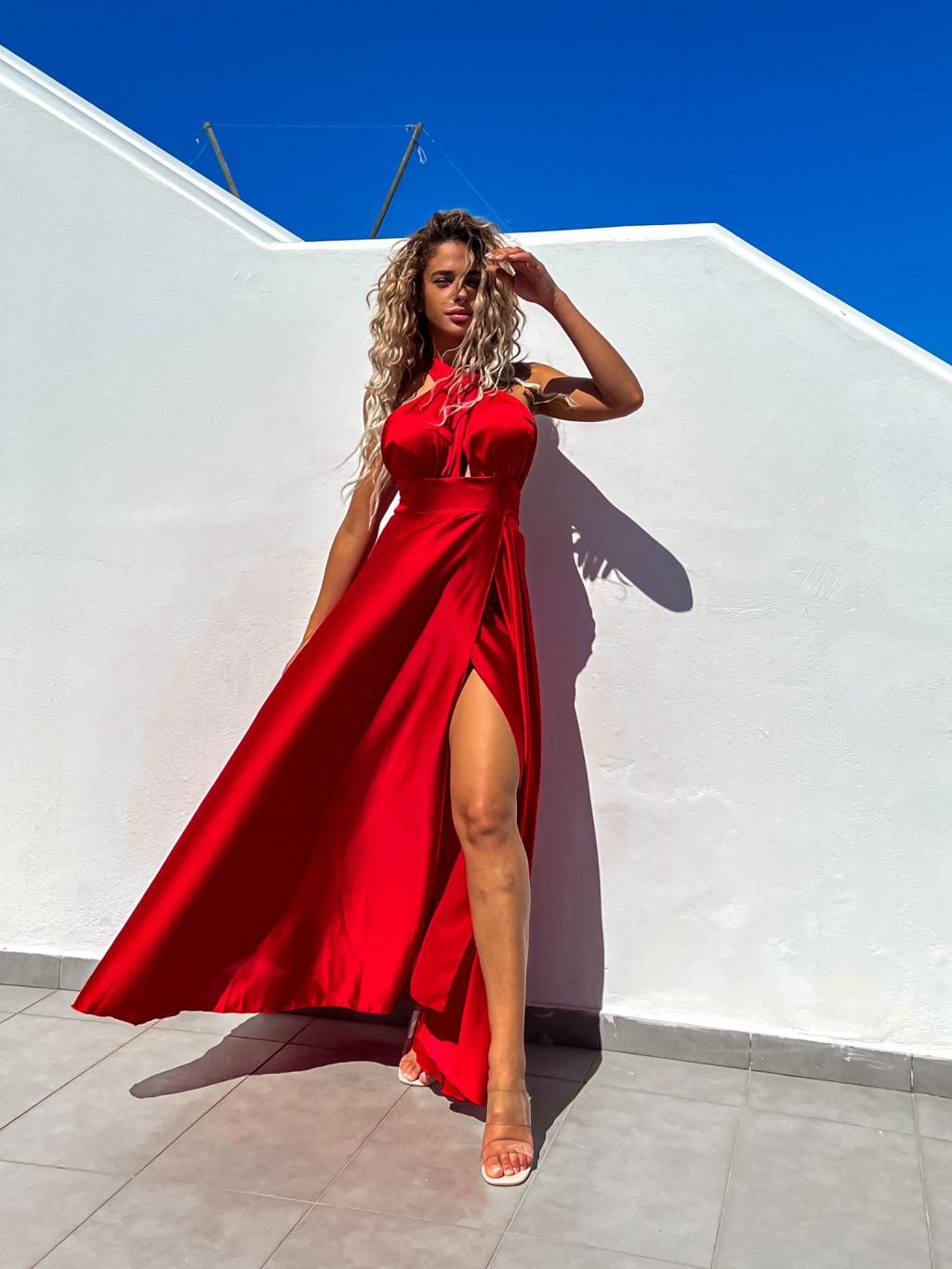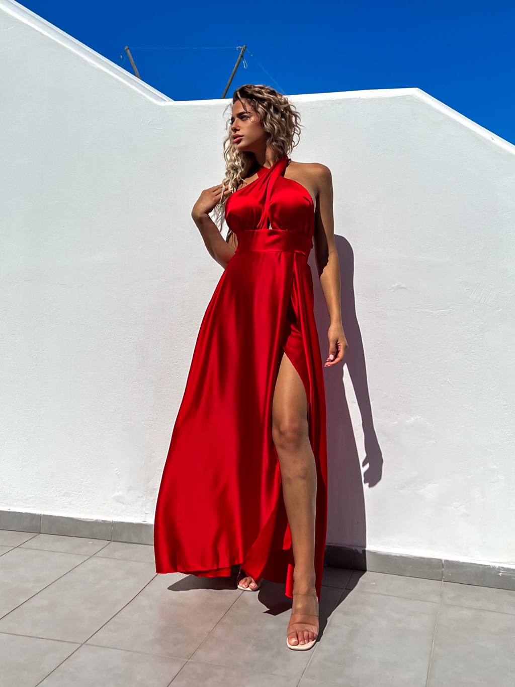 Červené dlouhé elegantní lesklé šaty TARRISA s rozparkem