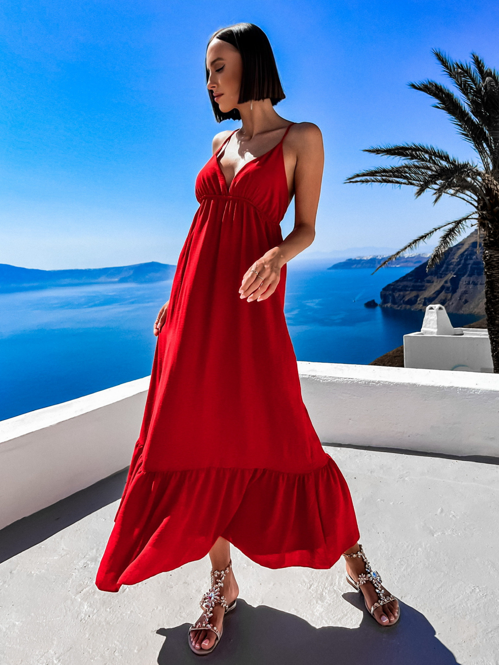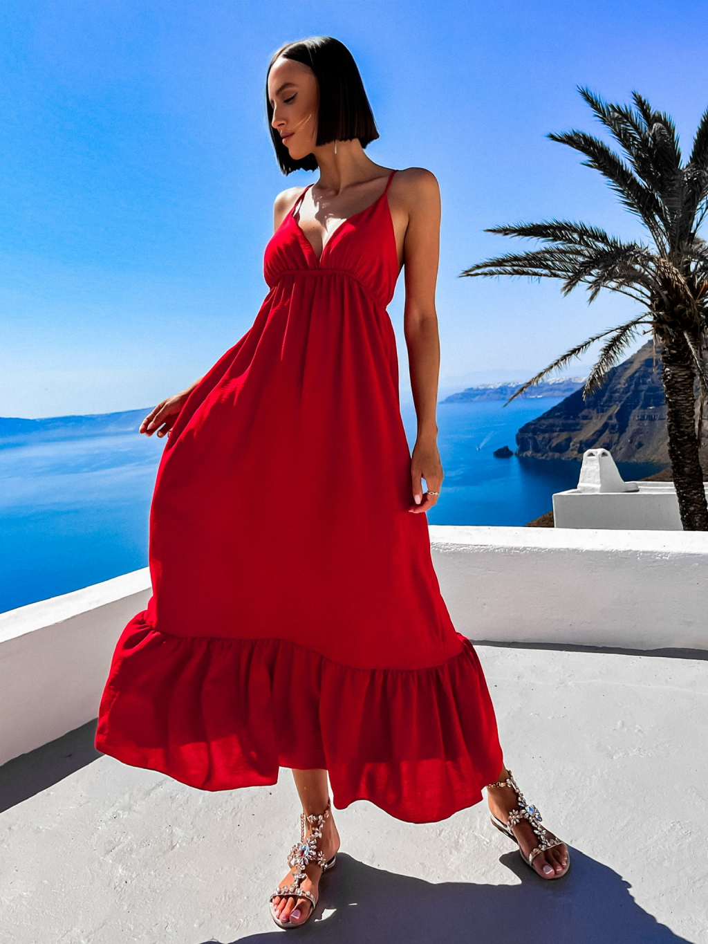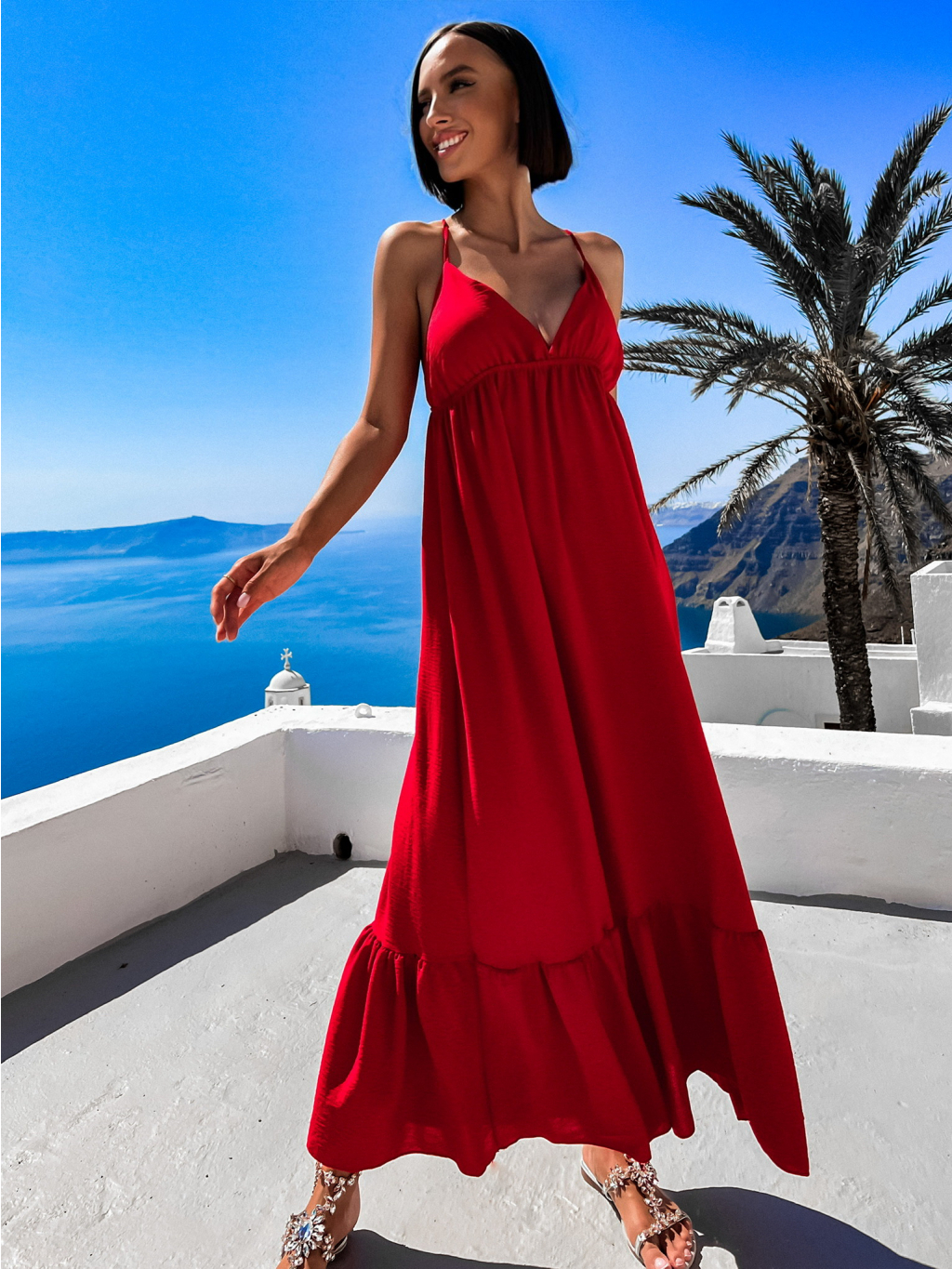 Červené dlouhé šaty LEAFI s volánem
