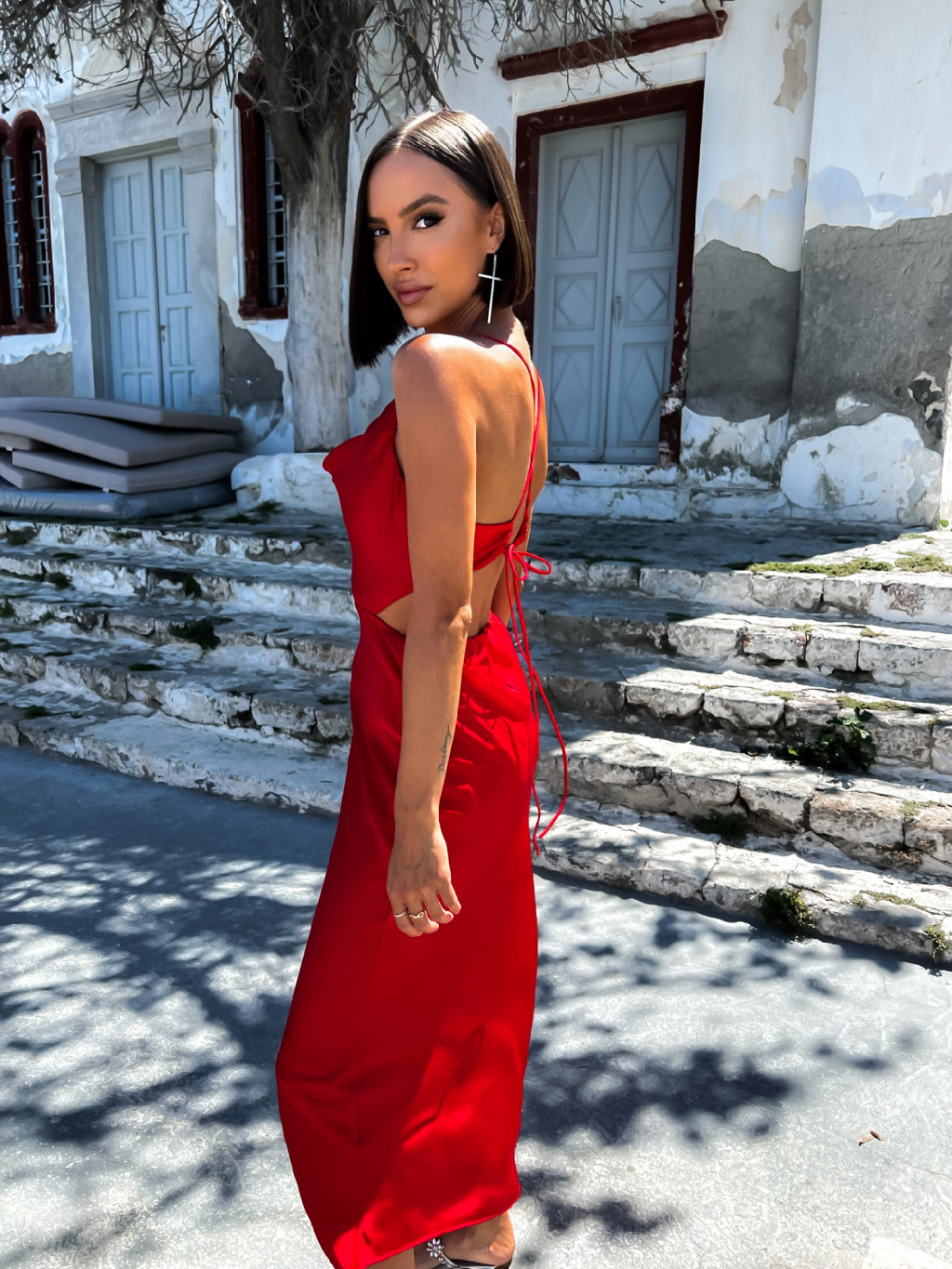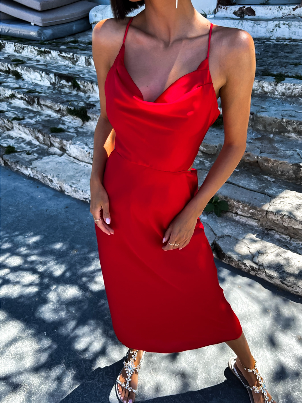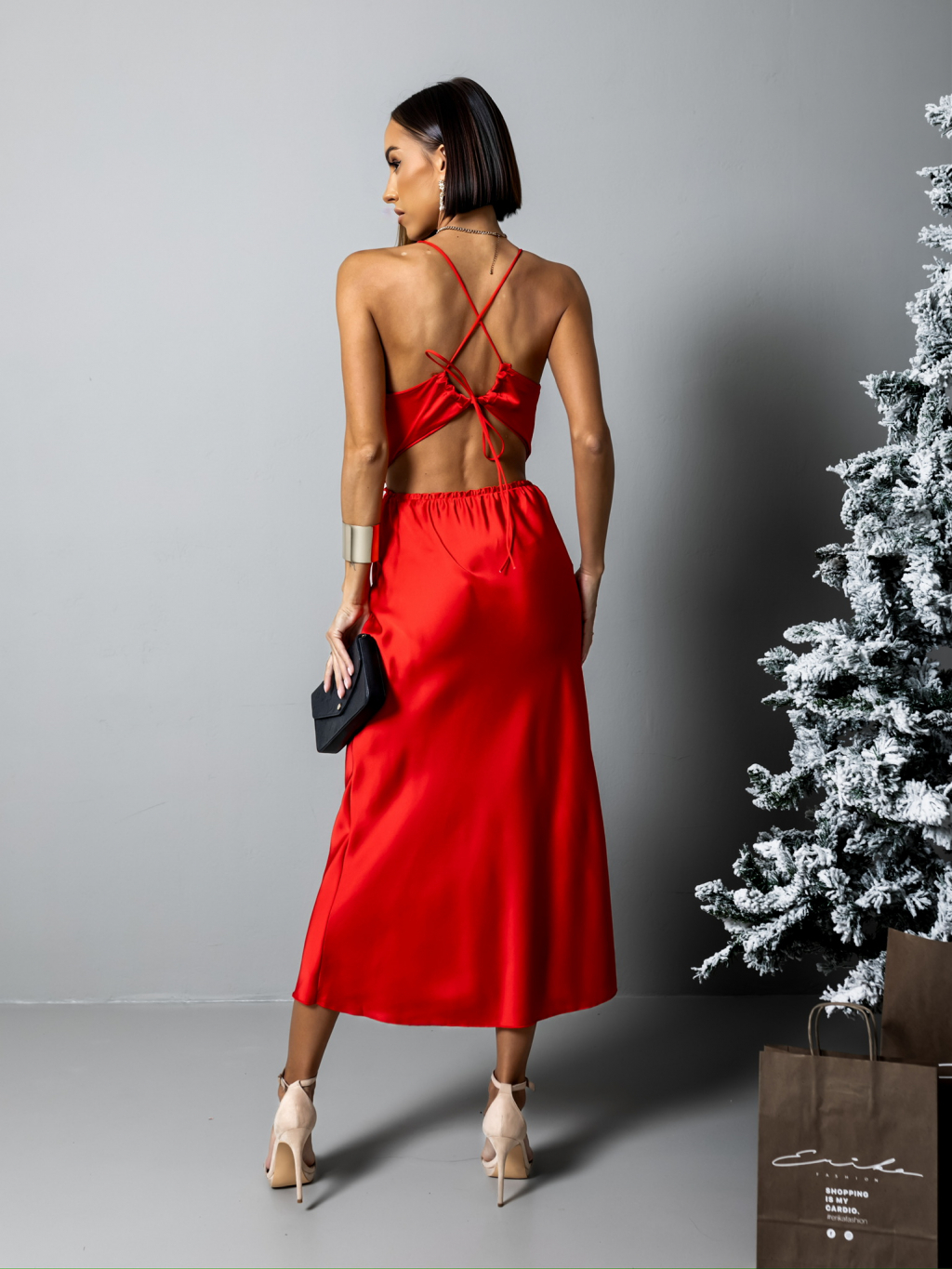 Červené lesklé elegantní šaty MADALYN s vázáním na zádech