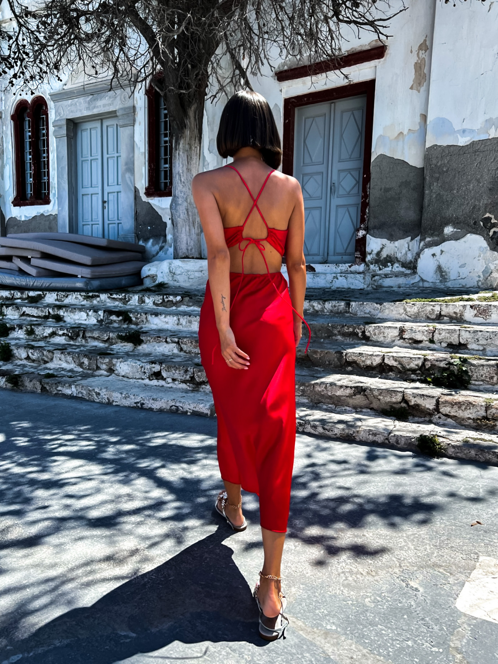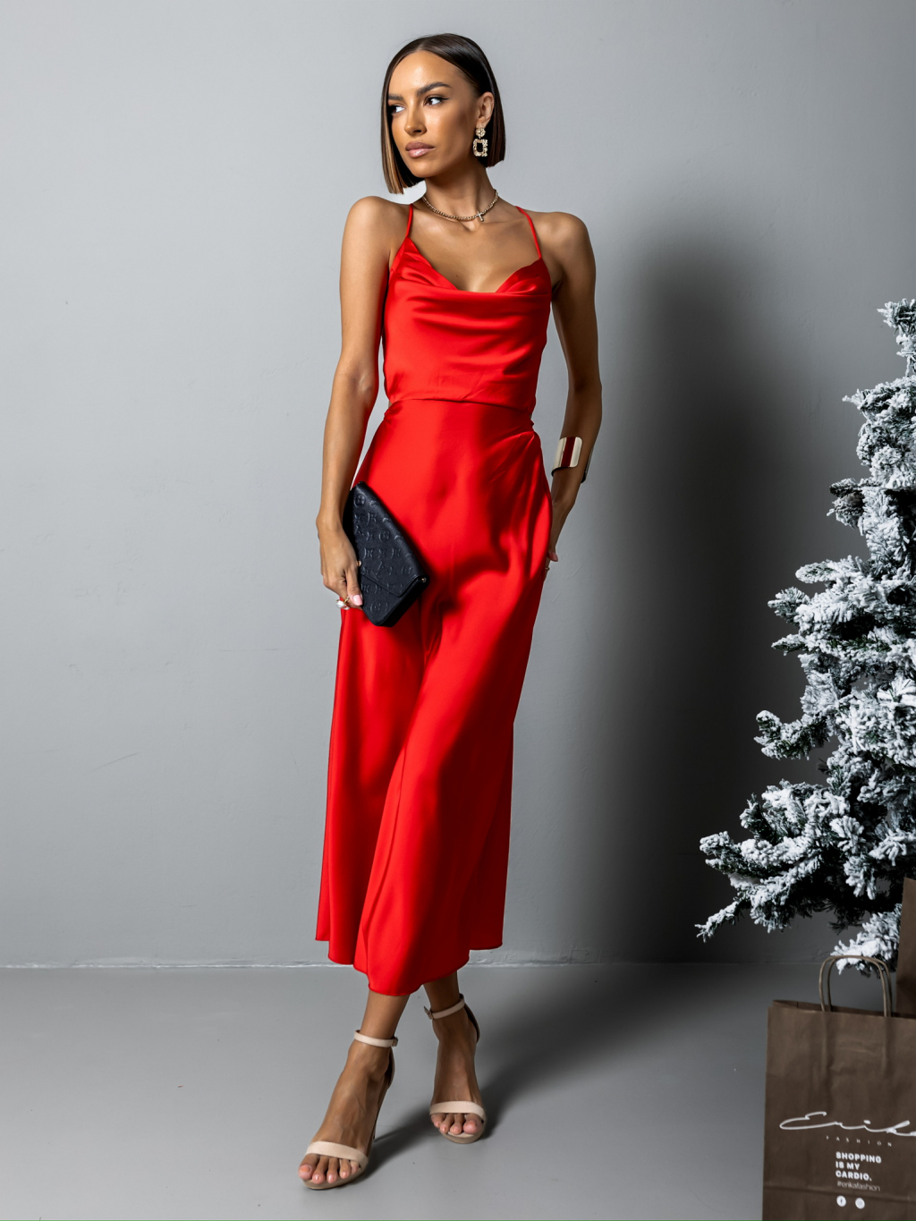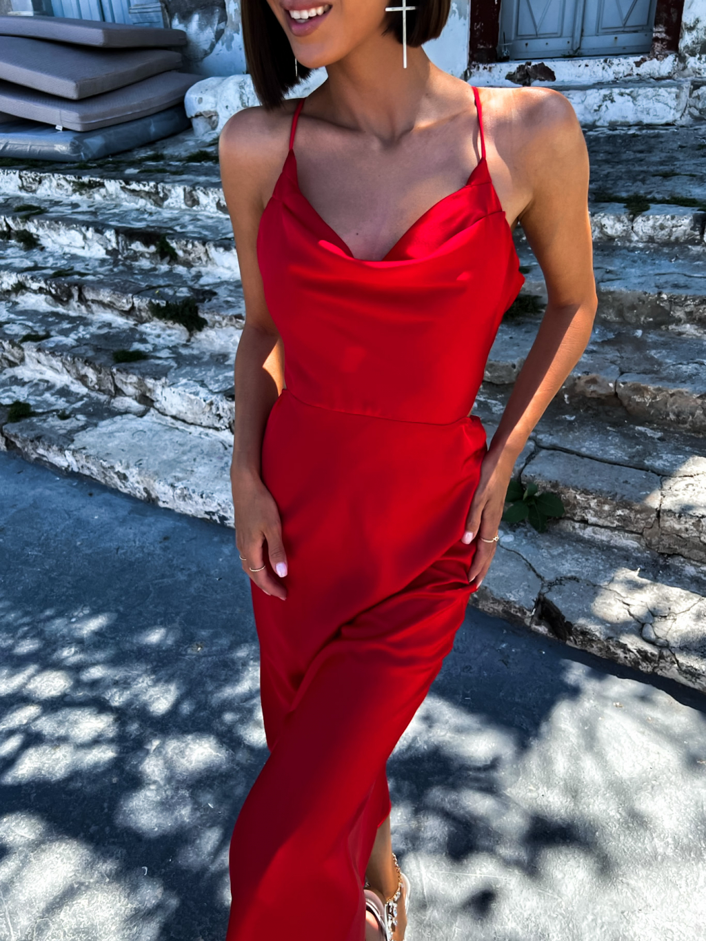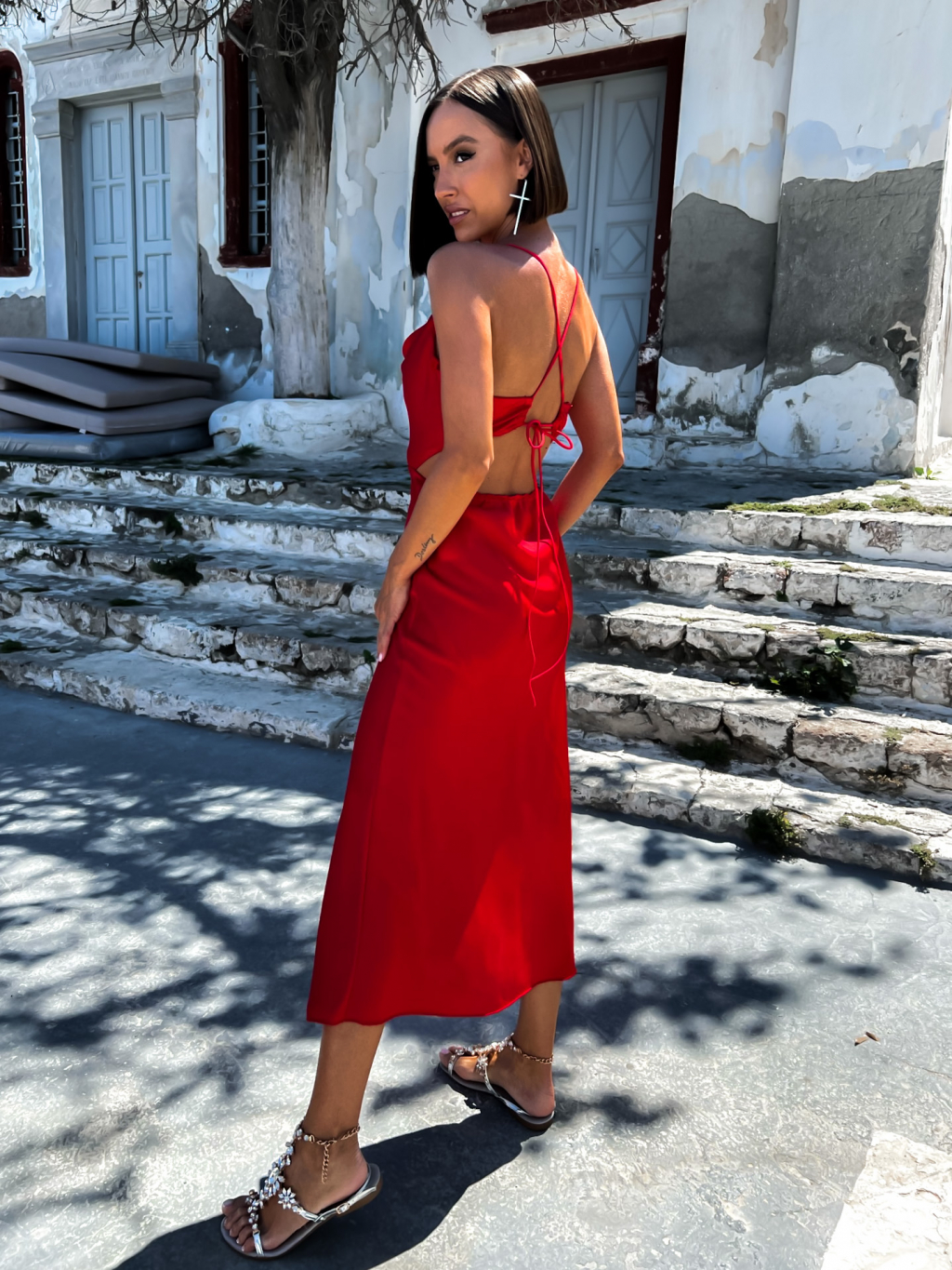 Červené lesklé elegantní šaty MADALYN s vázáním na zádech