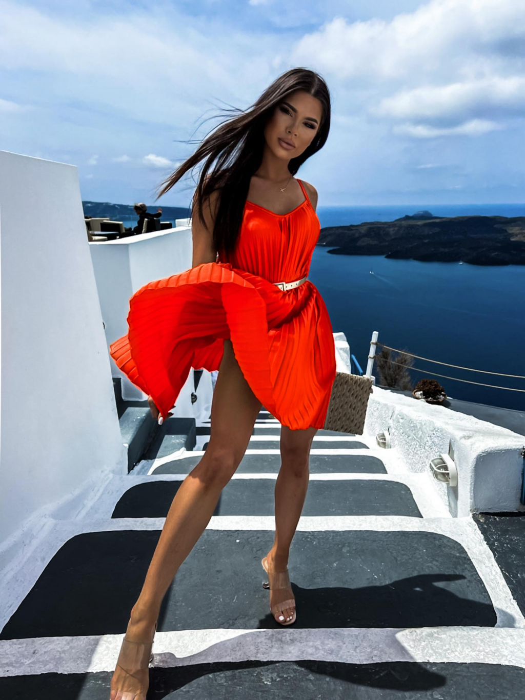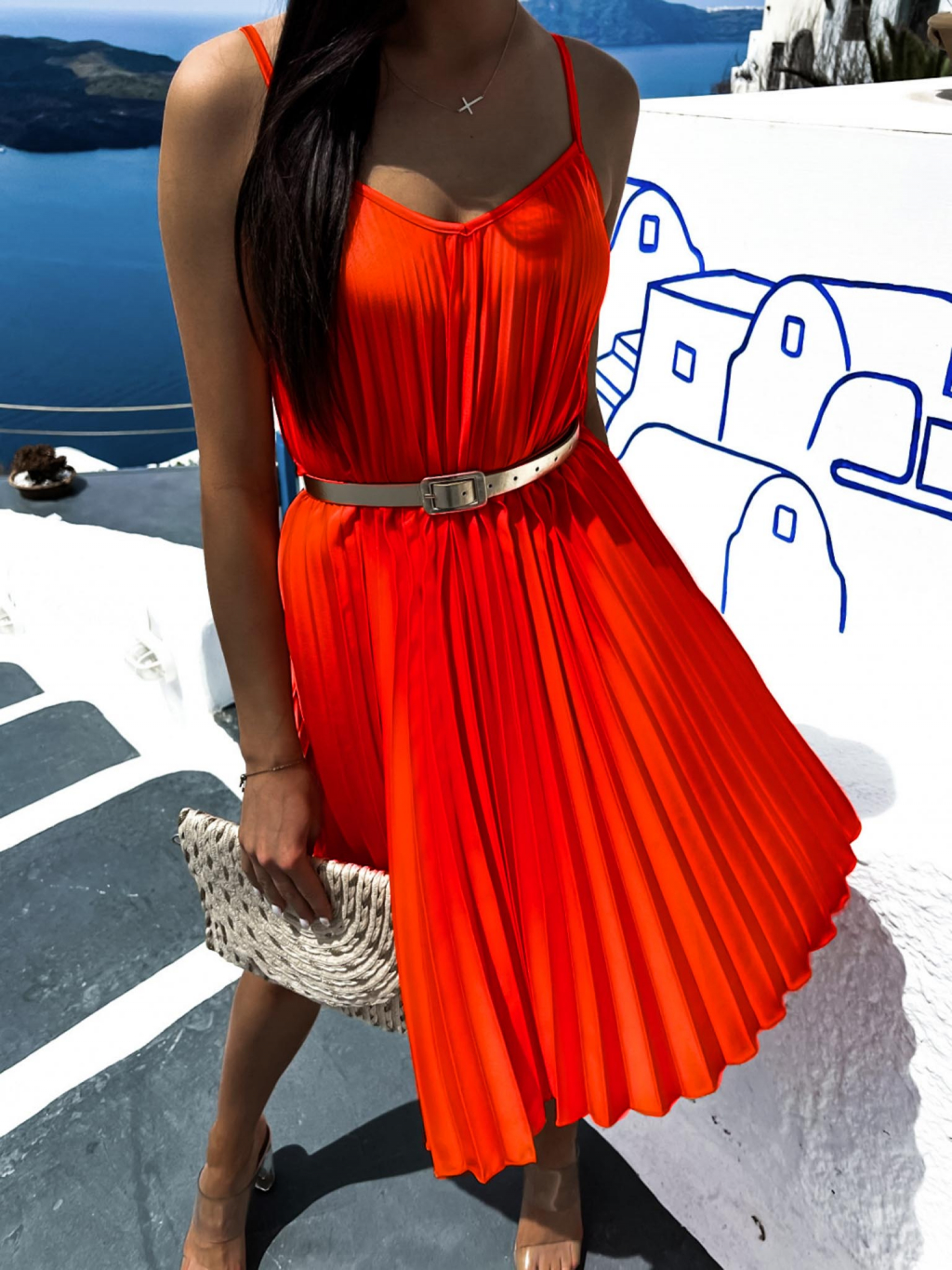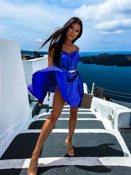 Červené lesklé plisované šaty CLAURA se zlatým páskem