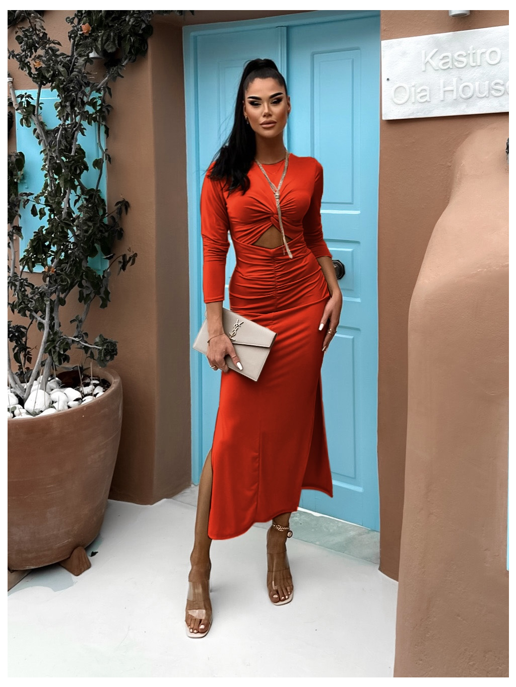Cihlové dlouhé elegantní šaty LUNNOX s průstřihy