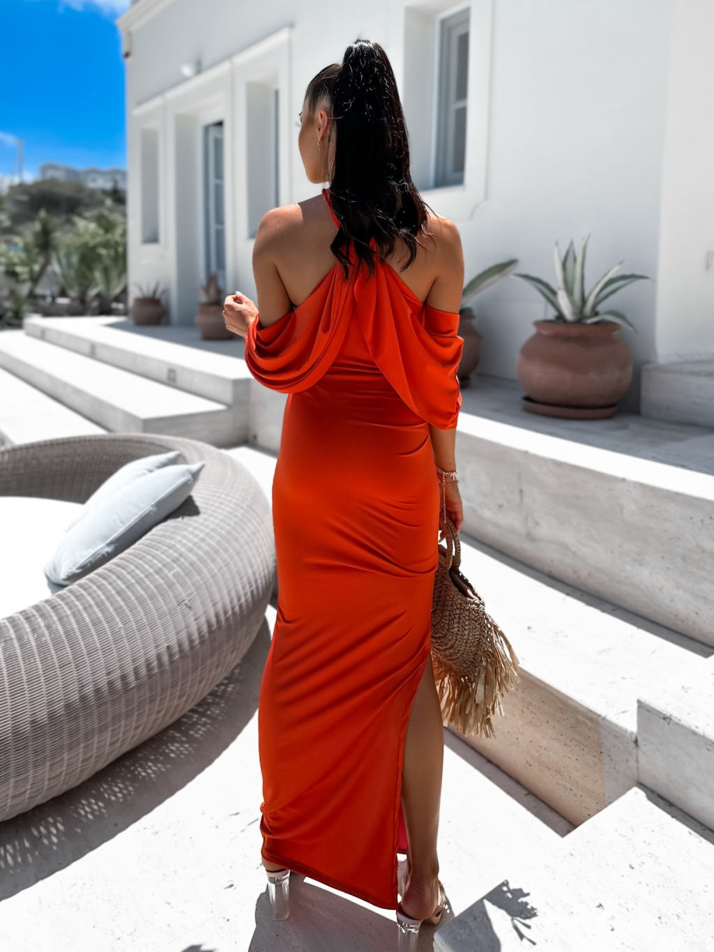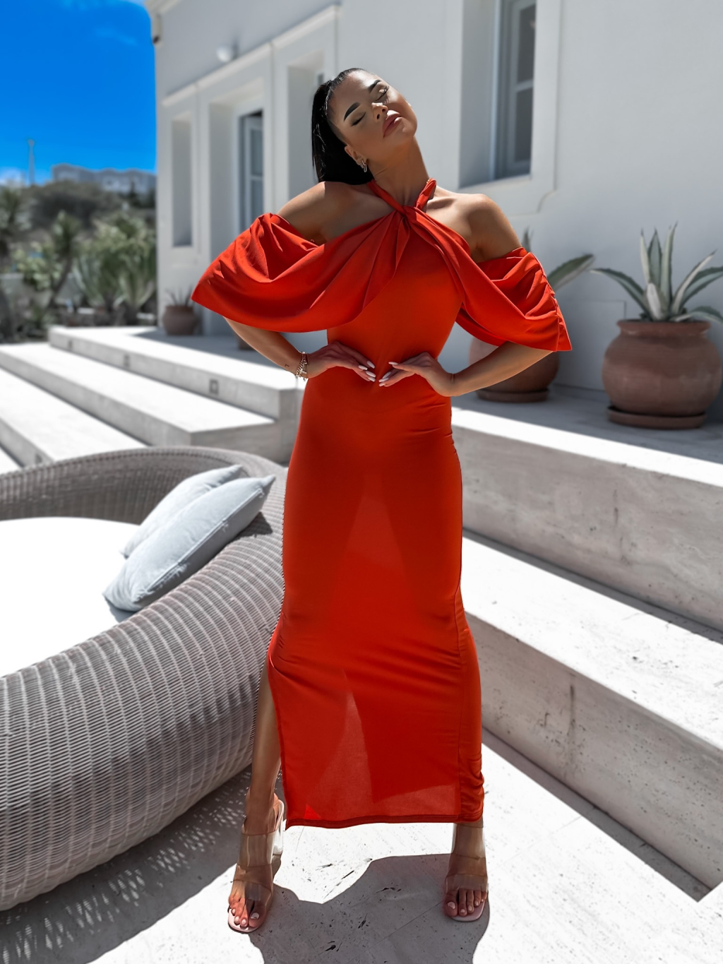 Cihlové elegantní šaty LOYLENE s rozparkem