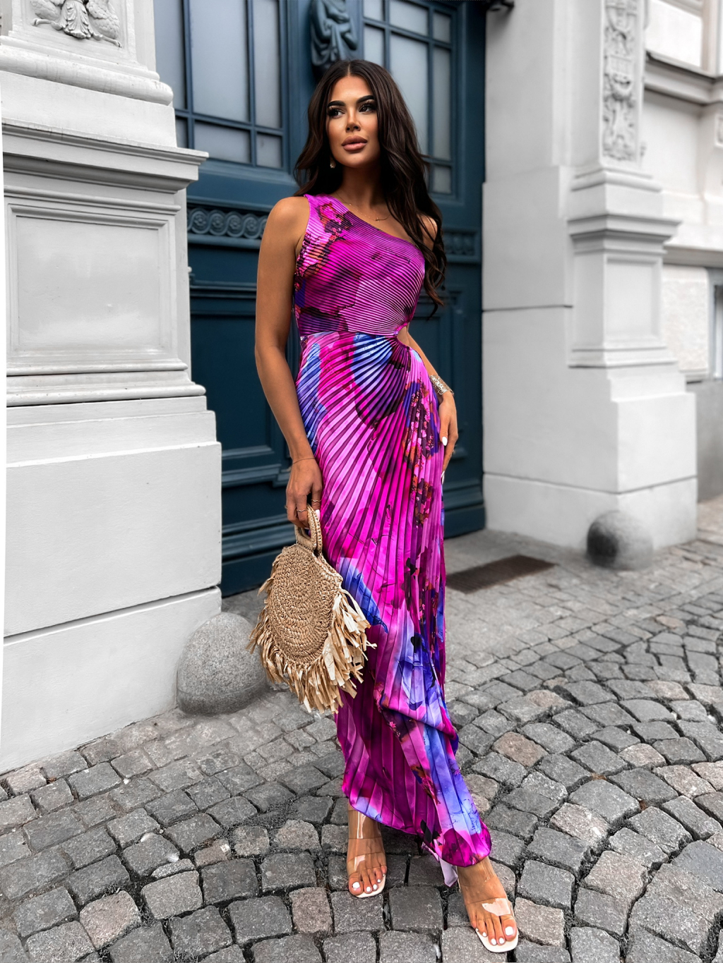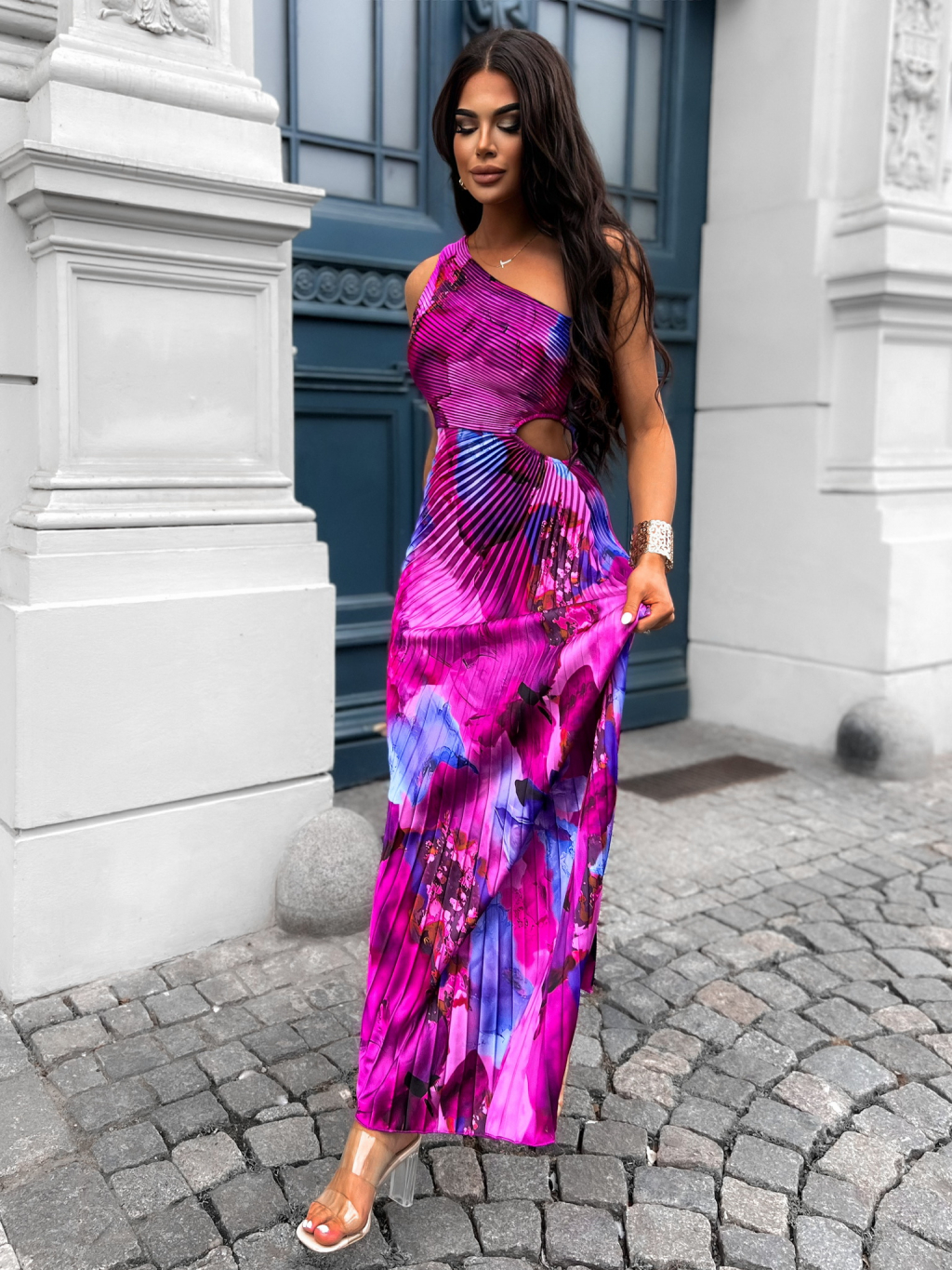 Šaty Suntils jsou dlouhé plisované šaty s lesklým povrchem, navržené pro pohodlné nošení. Elegantní střih na jedno rameno a půvabný průstřih dodávají šatům sexy vzhled. Ideální volba na ples, svatbu, nebo pro družičky, které chtějí zazářit.