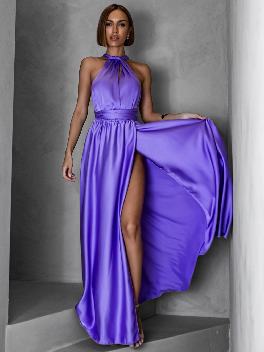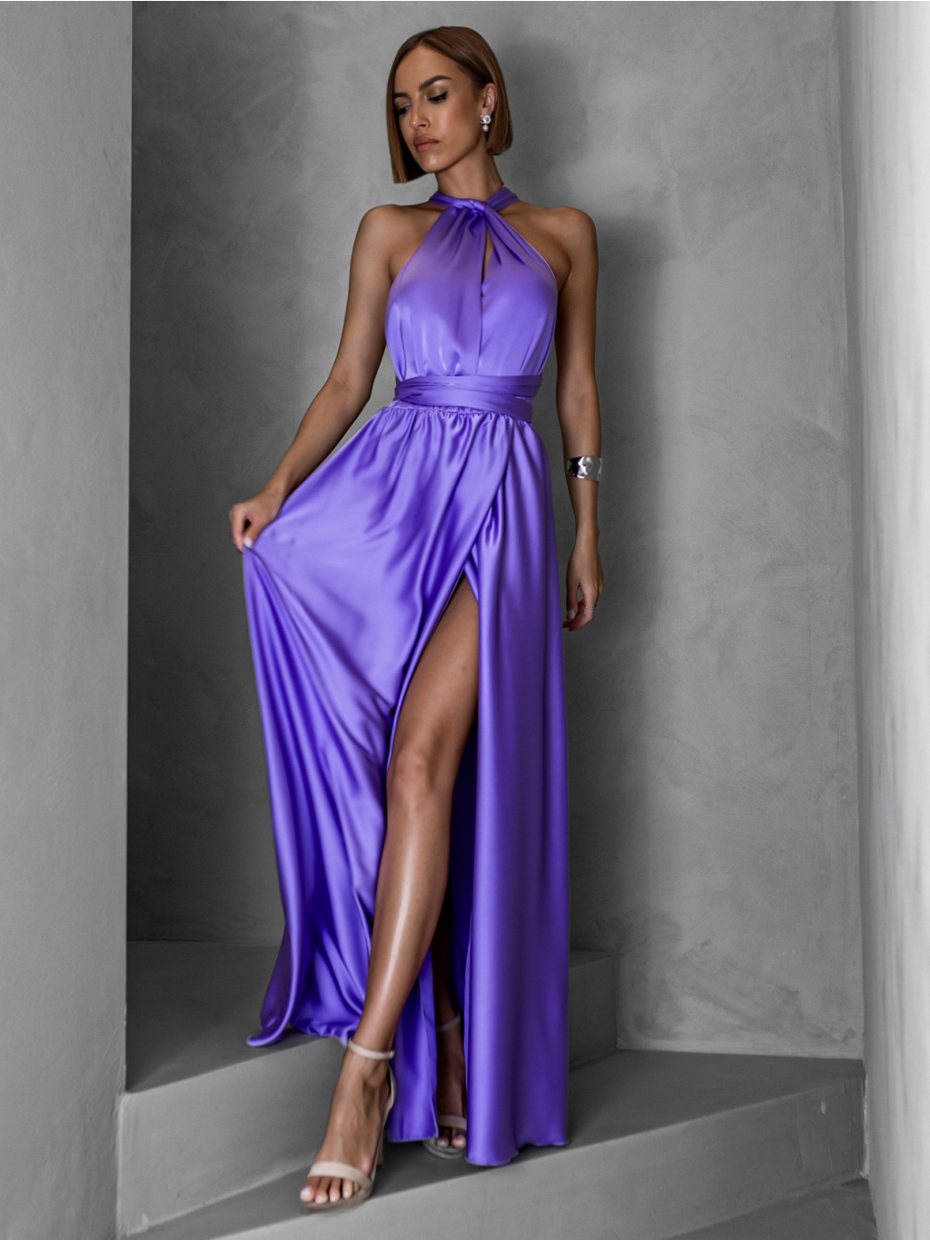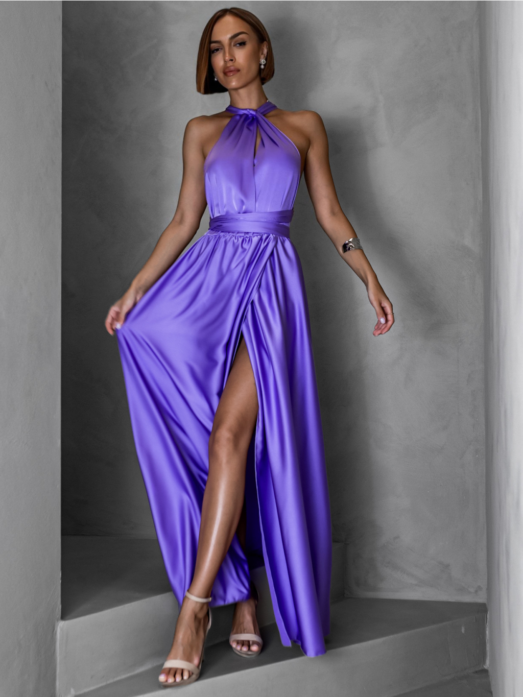Fialové lesklé šaty VALERDI s variabilním vázáním a rozparkem