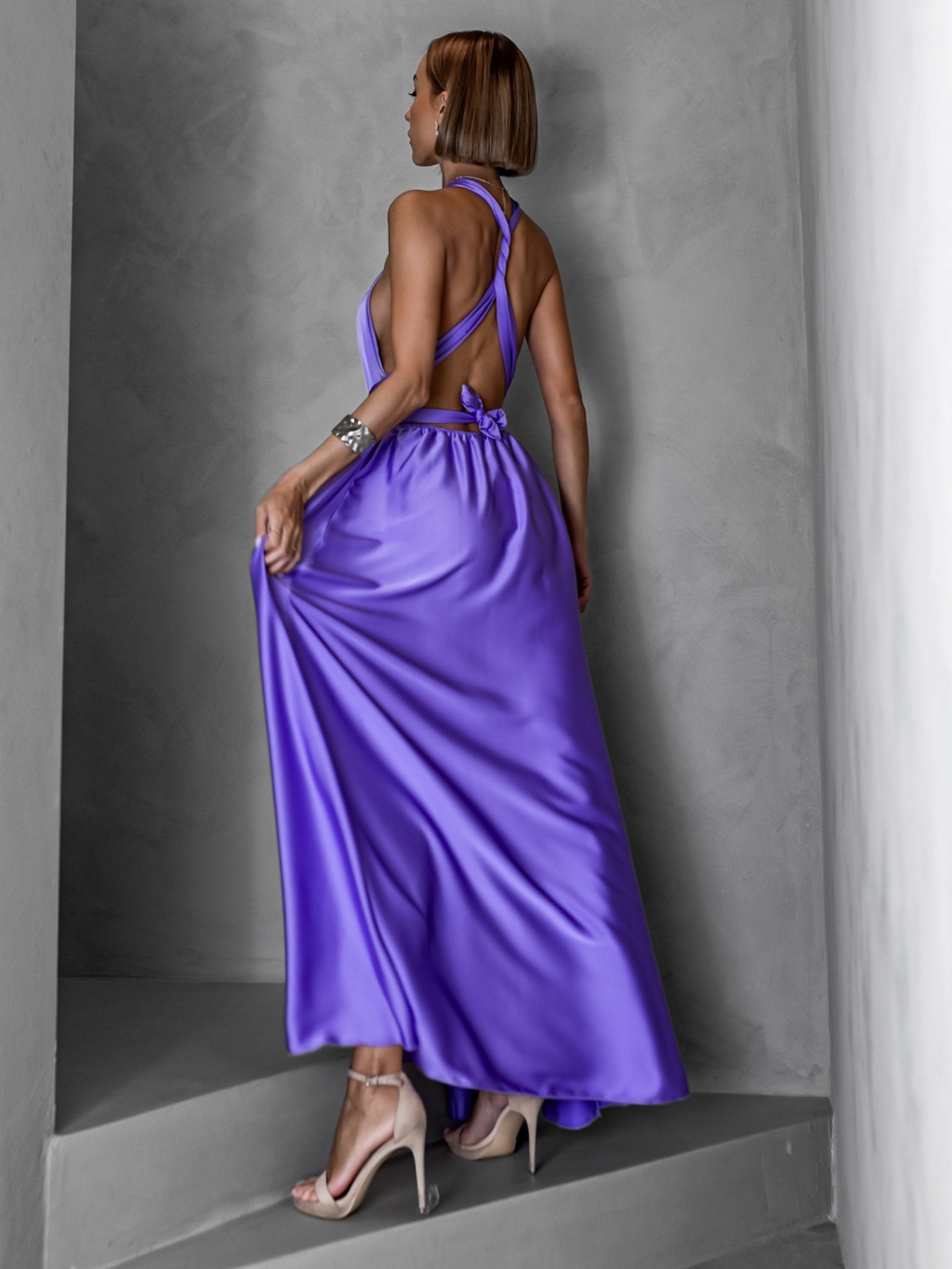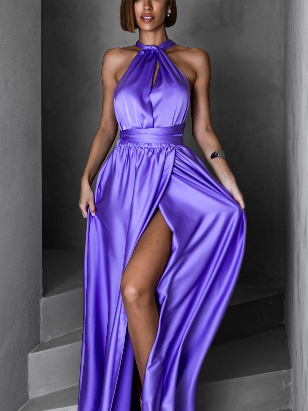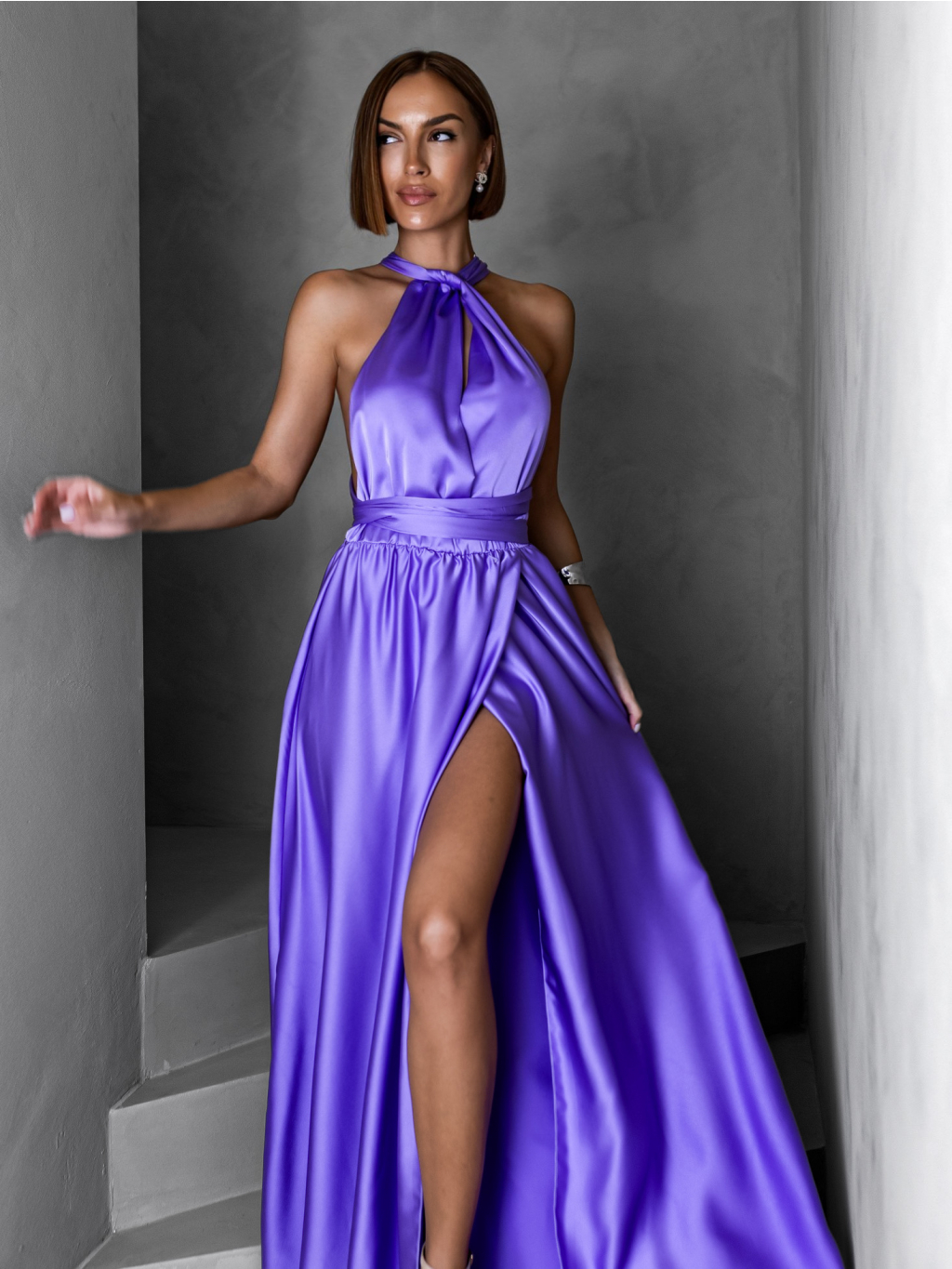 Fialové lesklé šaty VALERDI s variabilním vázáním a rozparkem