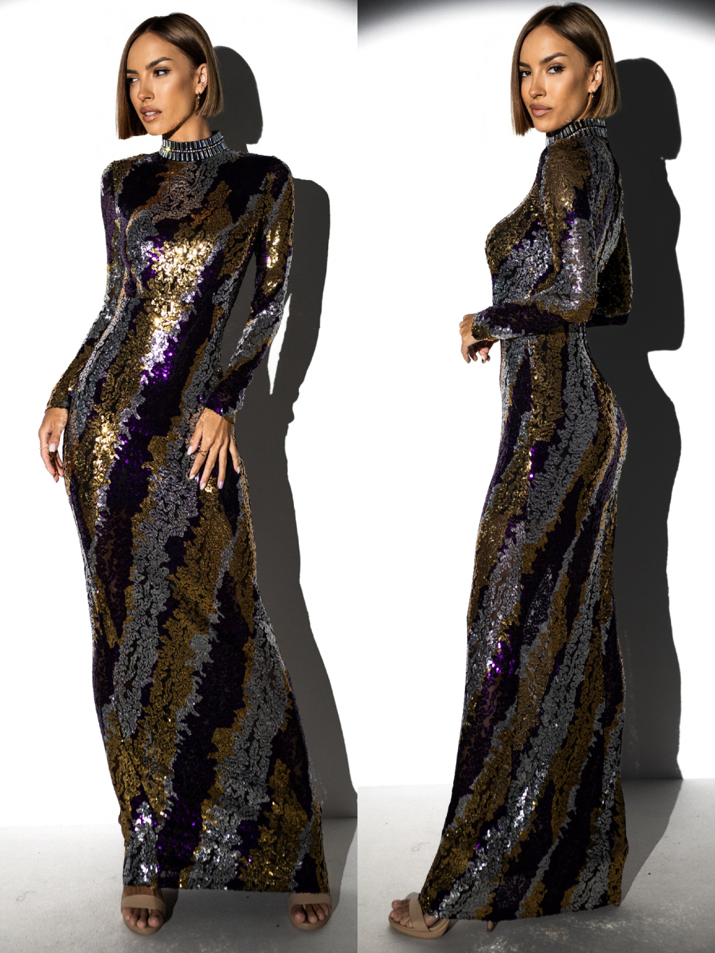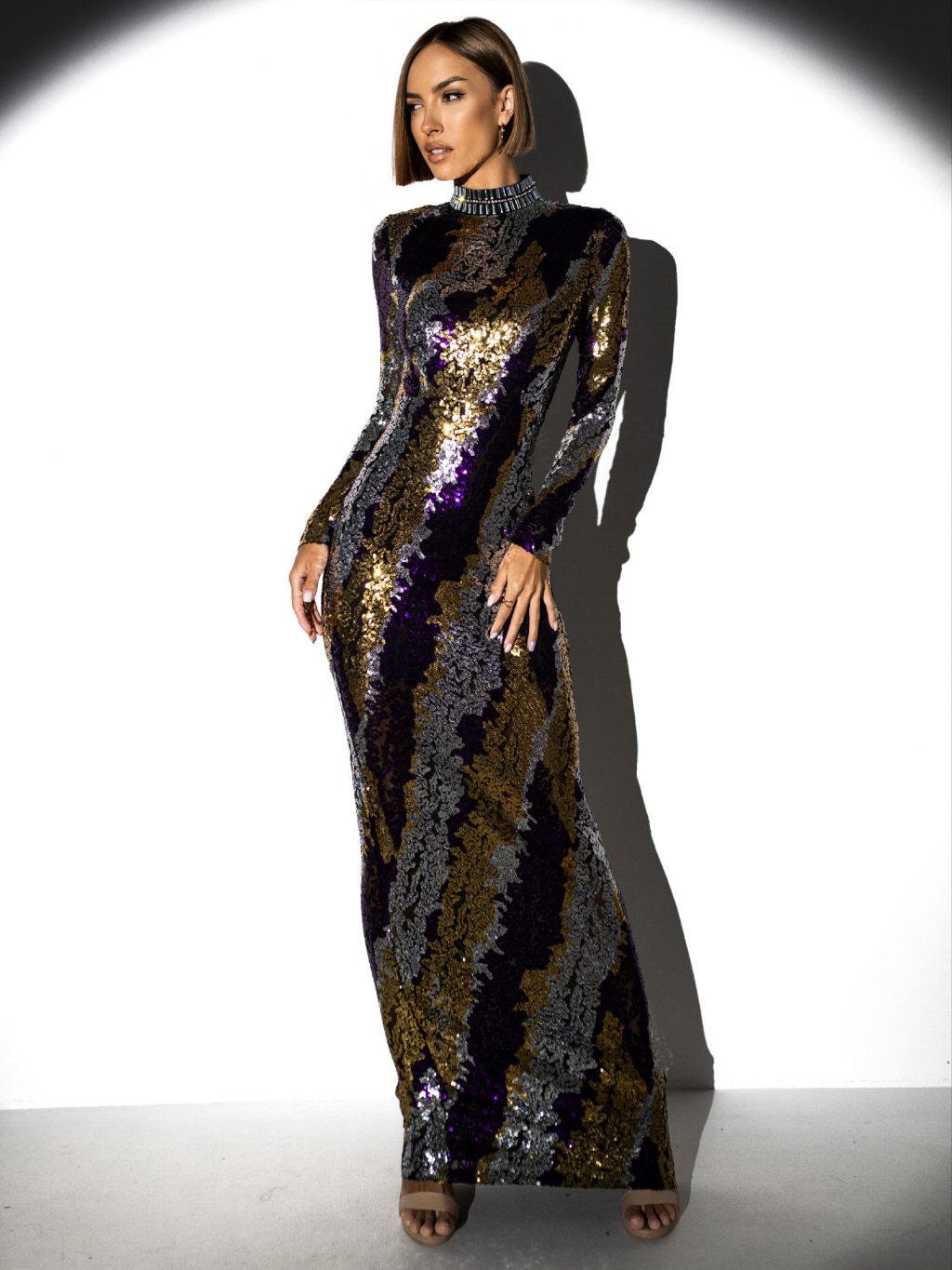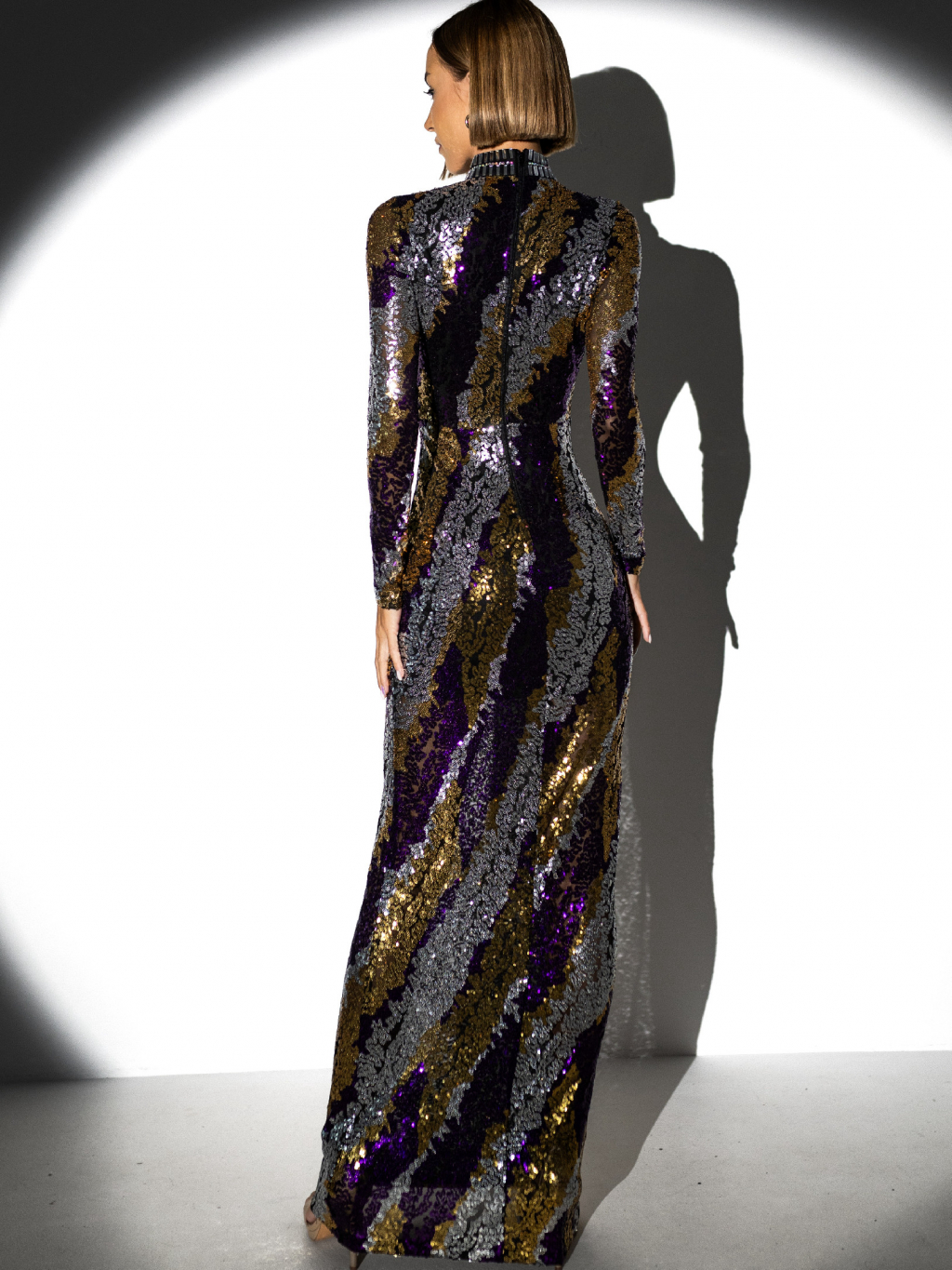 Fialovozlaté třpytivé večerní šaty KOUKI s flitry