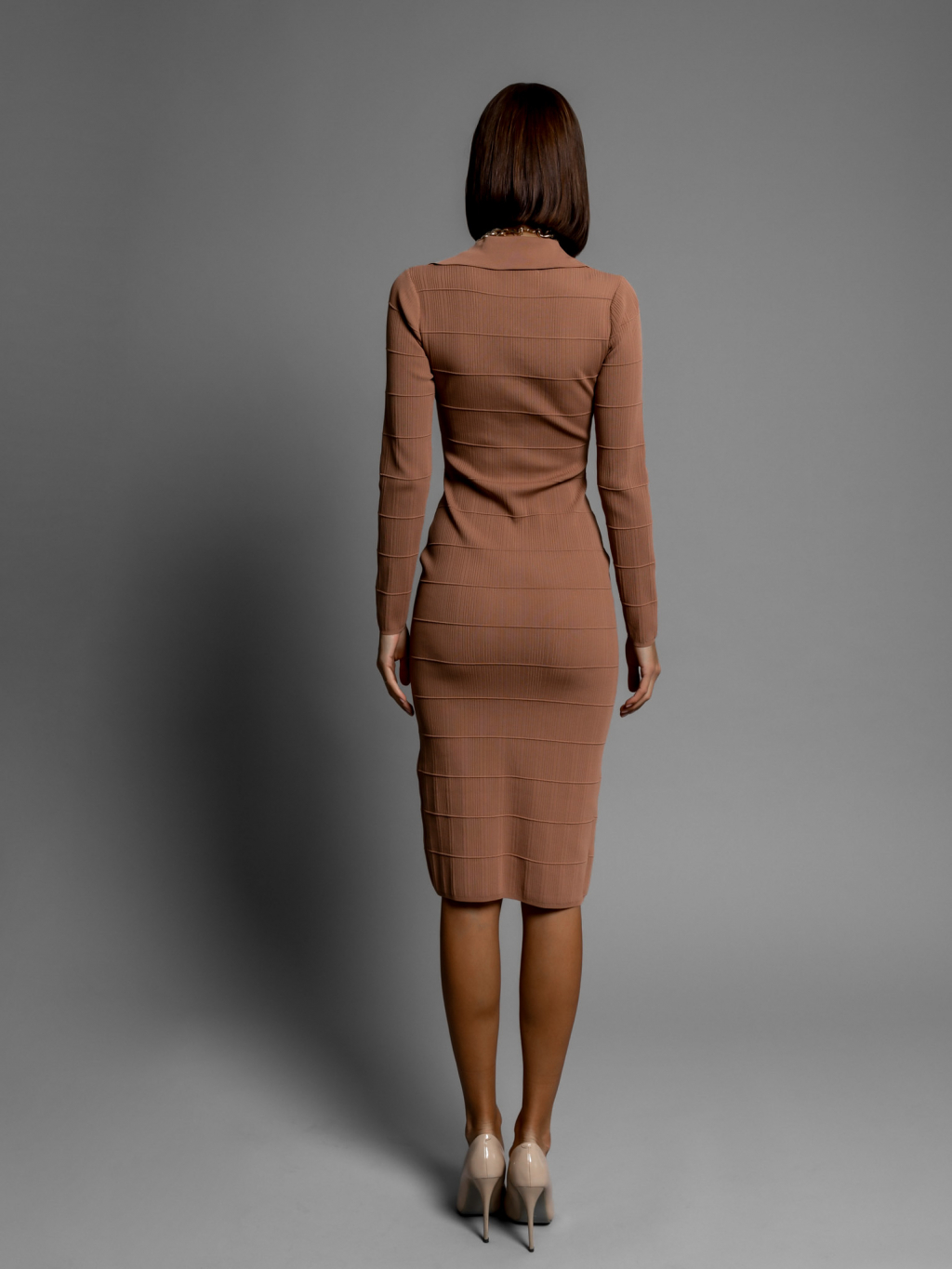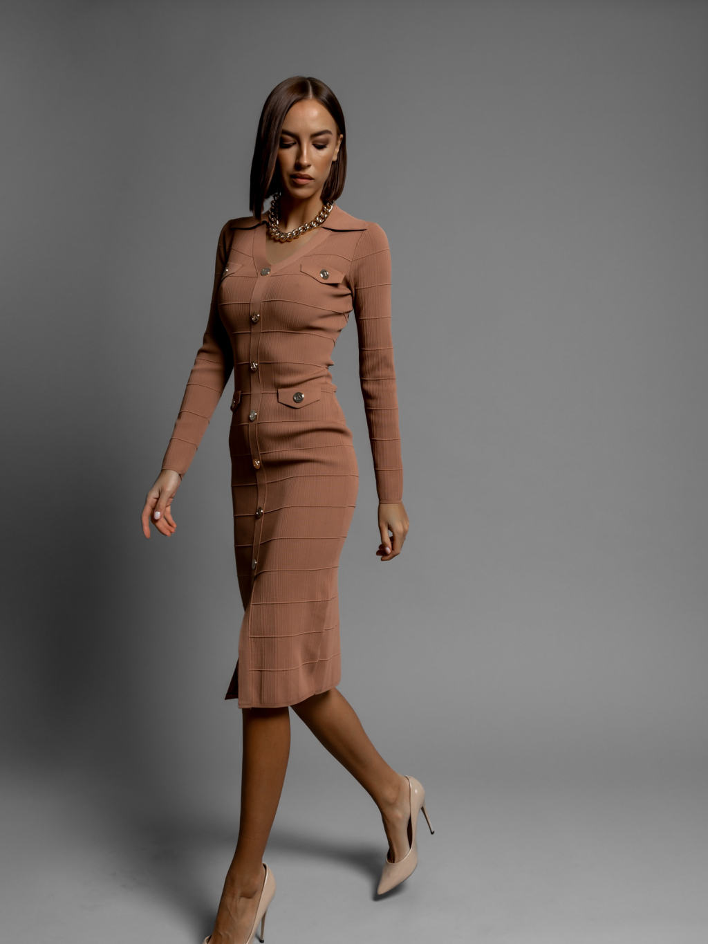 Hnědé elegantní delší šaty PROPS se zlatými knoflíky a límečkem