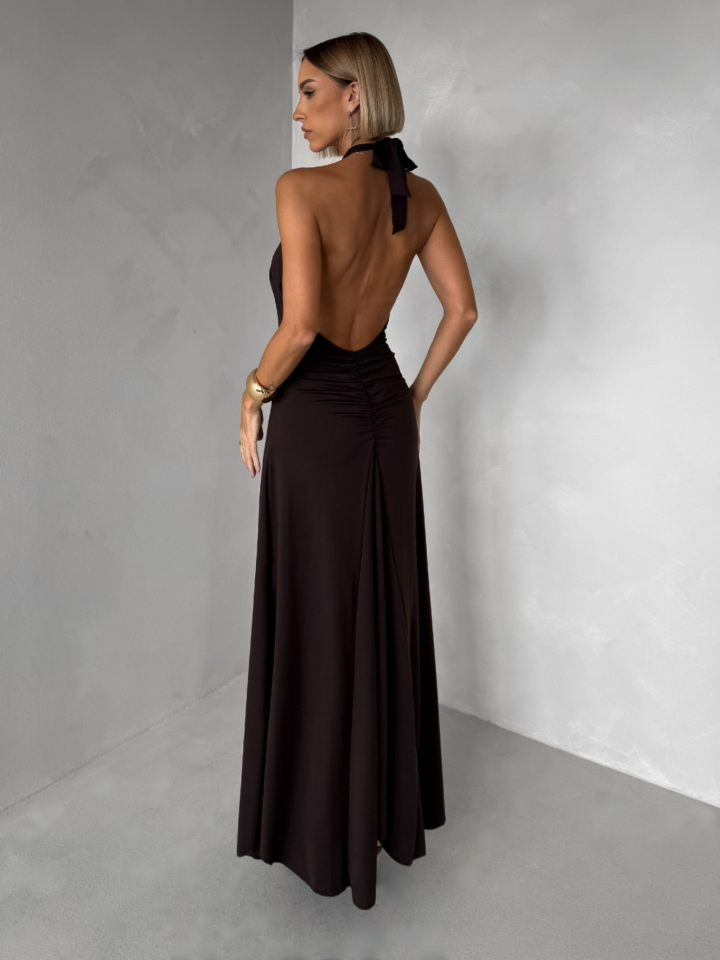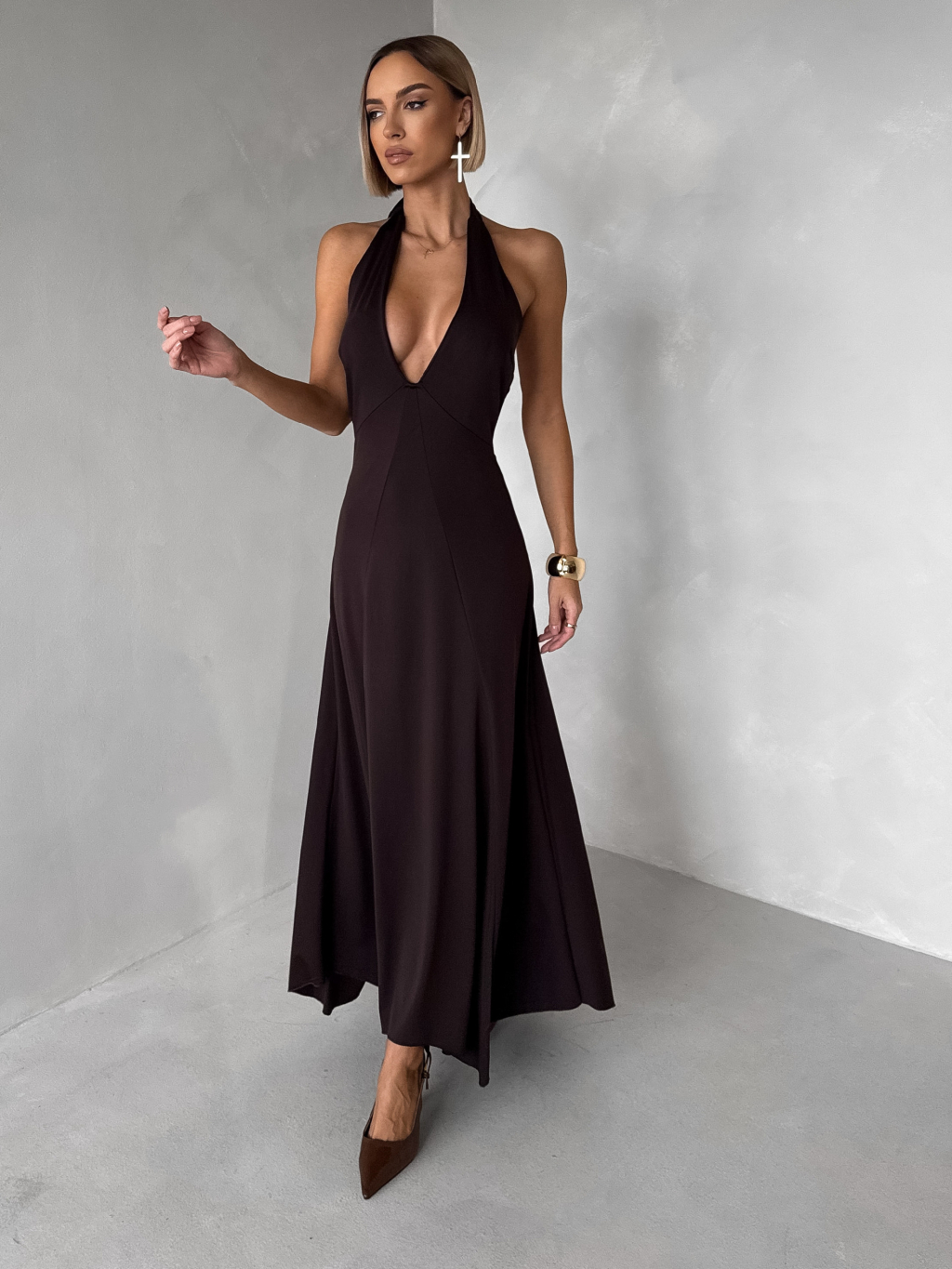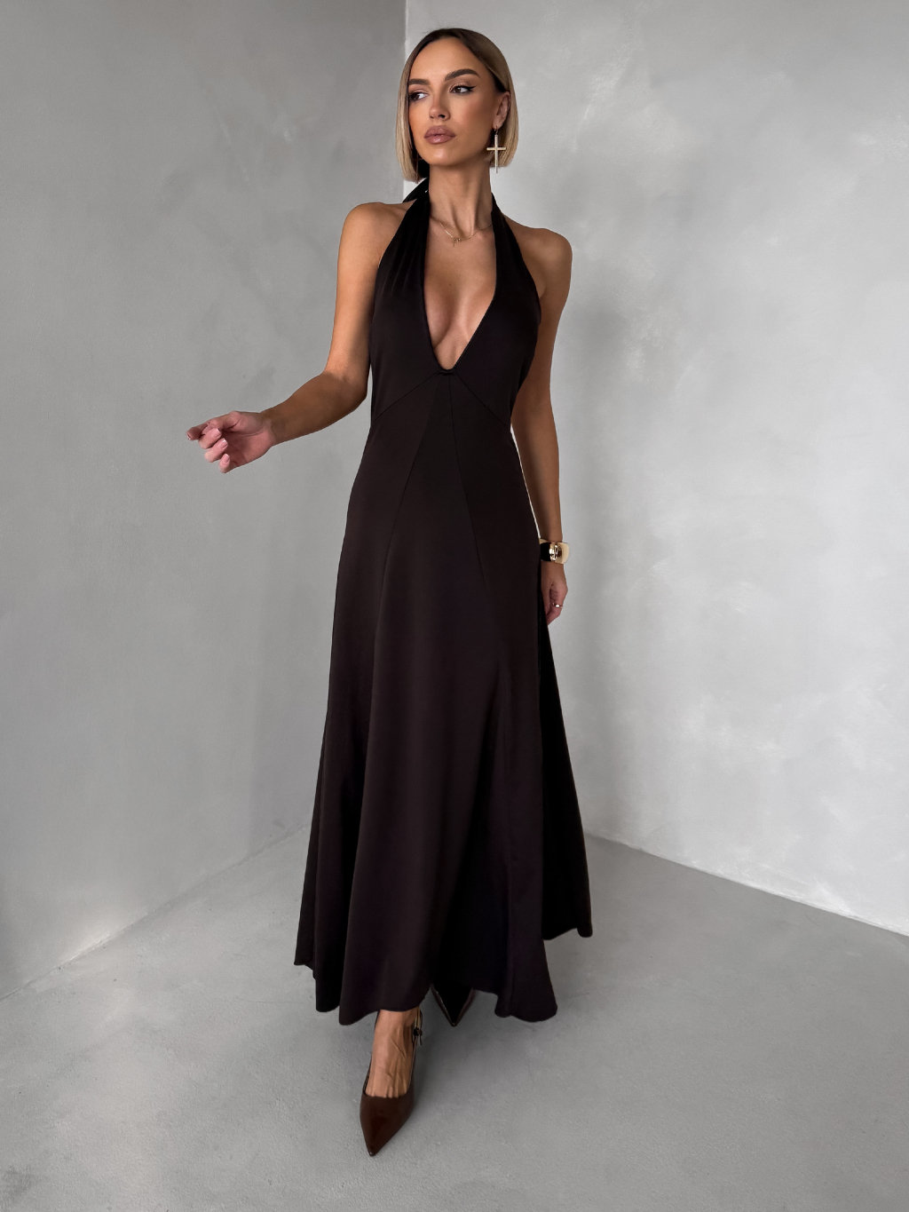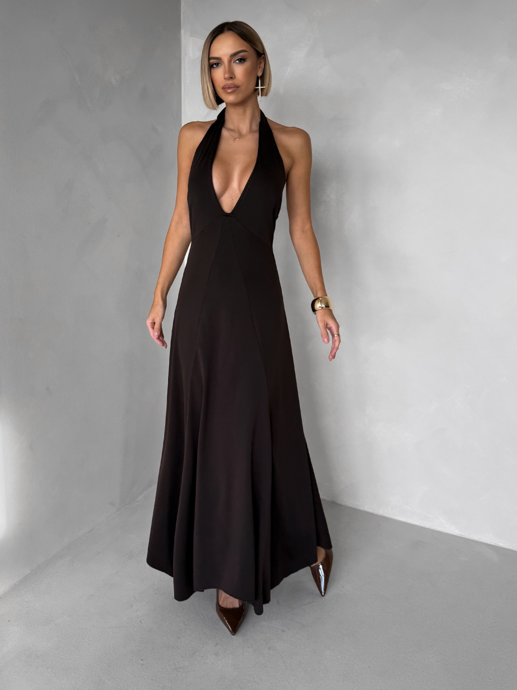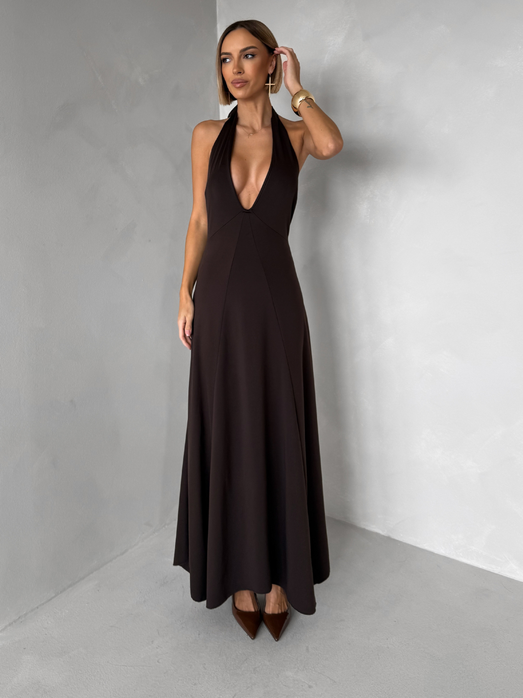 Hnědé elegantní dlouhé šaty NORELIE s výstřihem