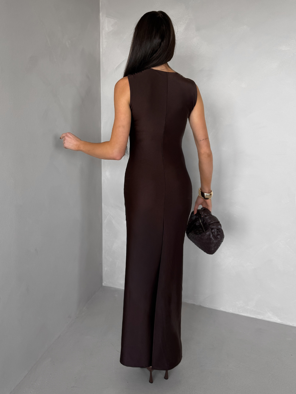 Hnědé elegantní společenské dlouhé šaty DRAVELY s řasením