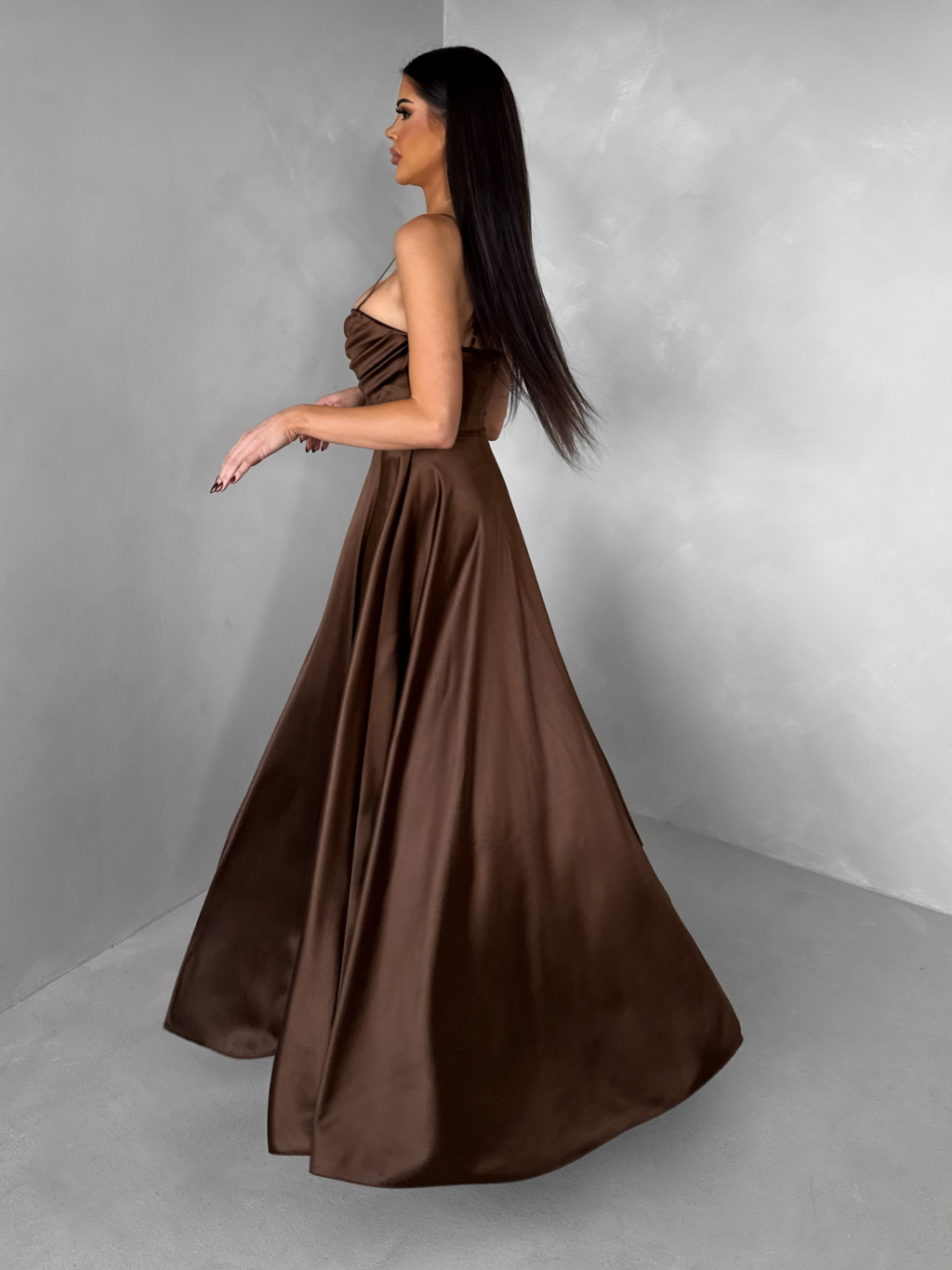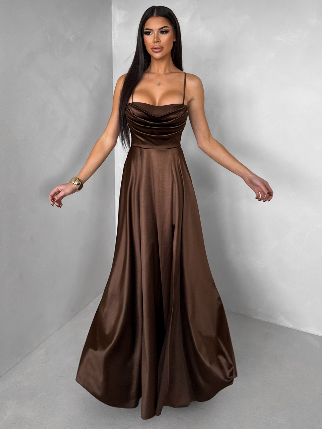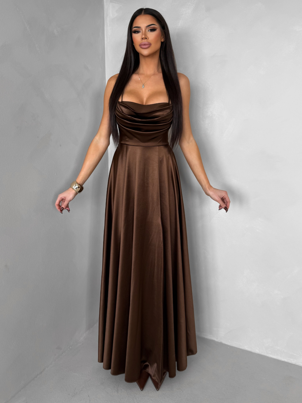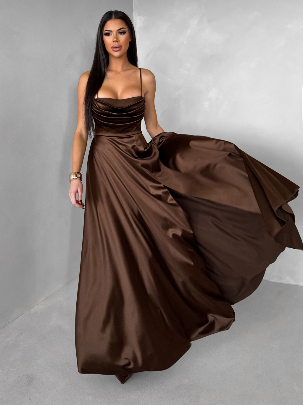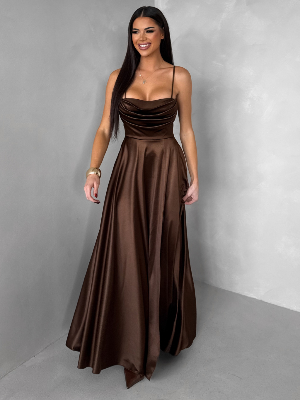 Hnědé saténové dlouhé společenské šaty LUNOREX