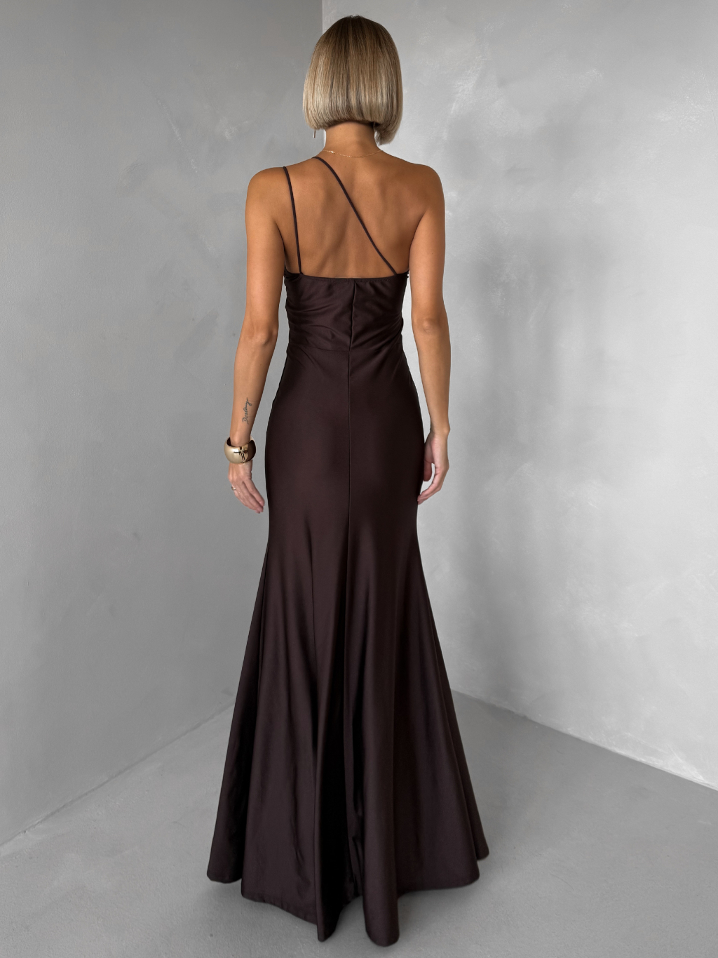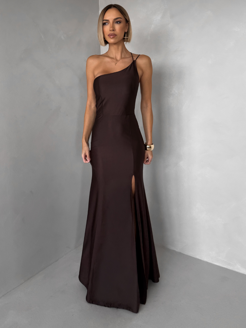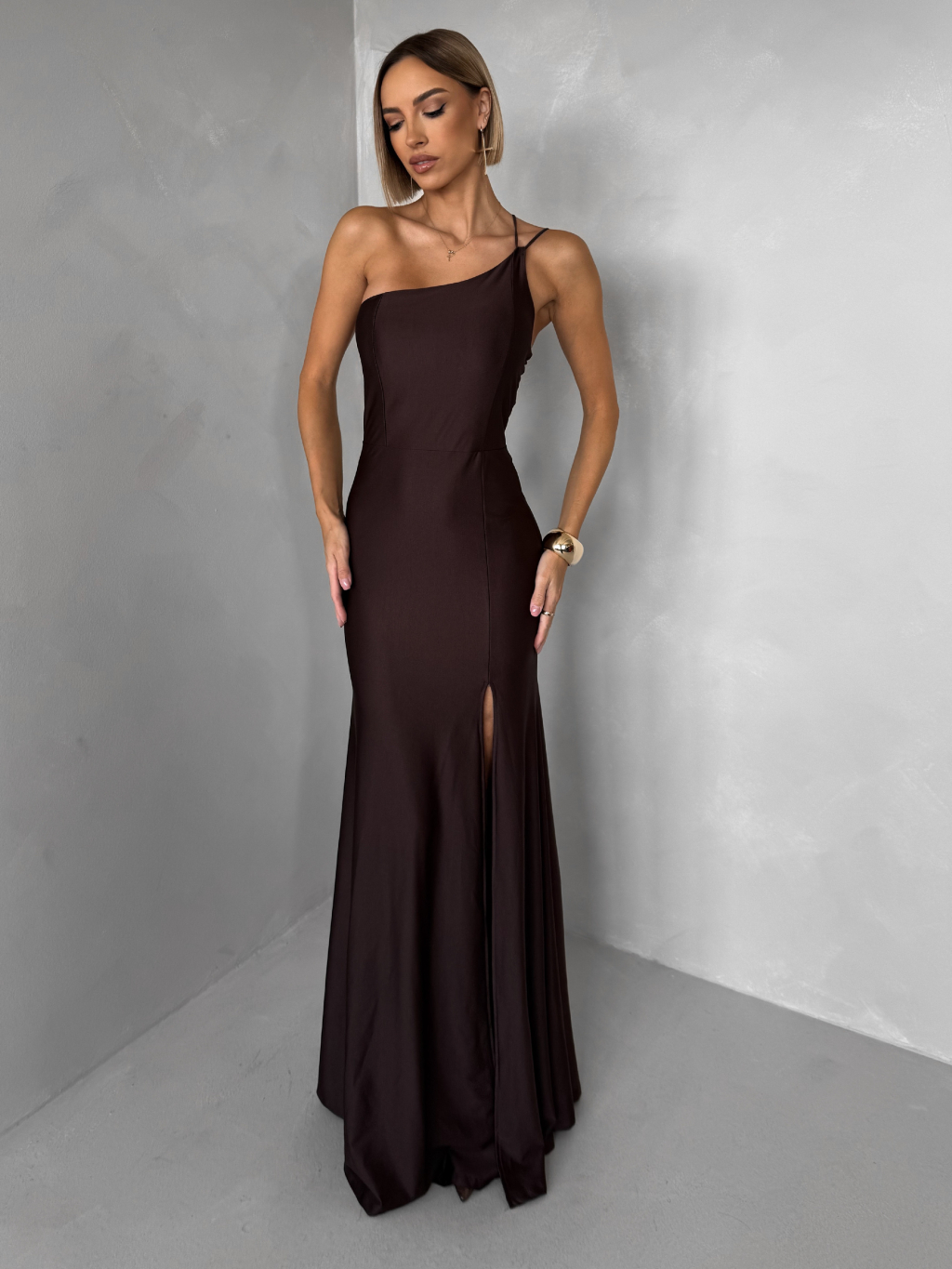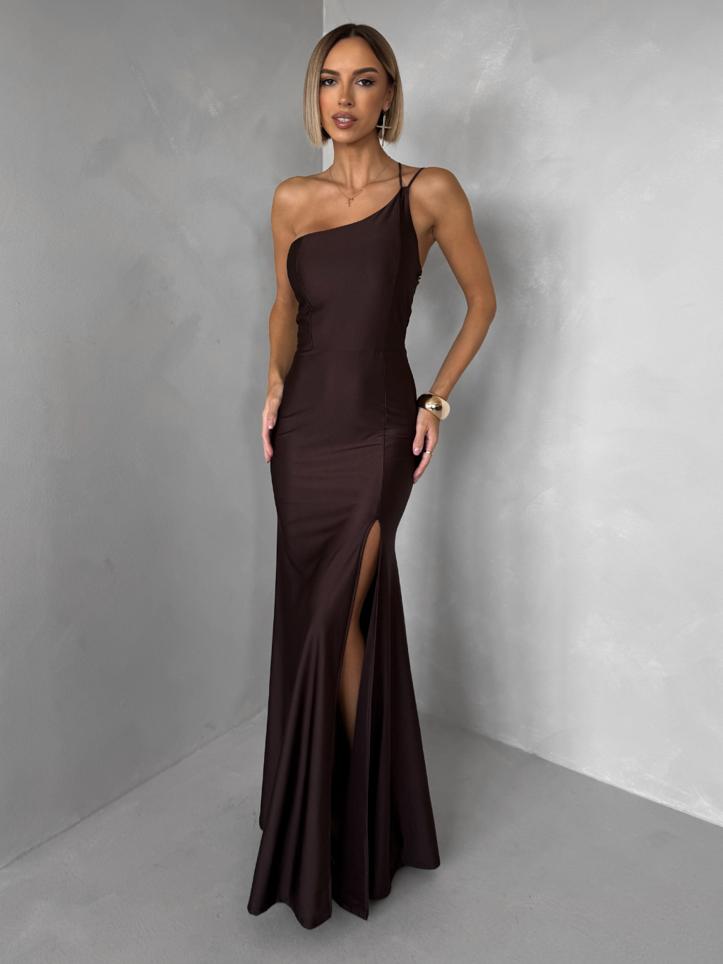 Hnědé společenské dlouhé šaty GAREVIA s rozparkem