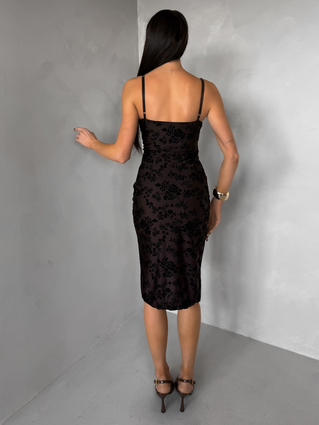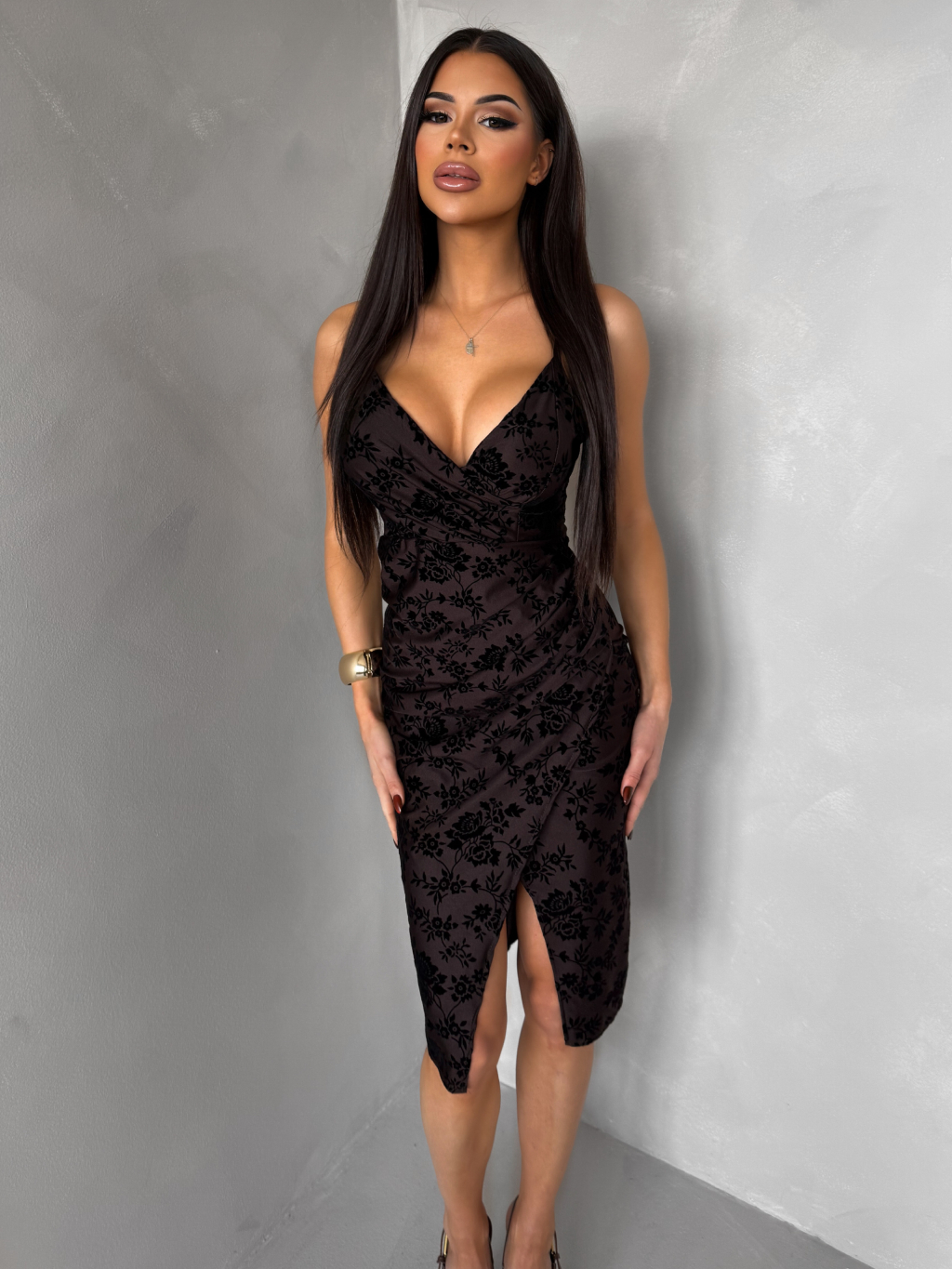 Hnědé společenské midi šaty ETNAVA s rozparkem