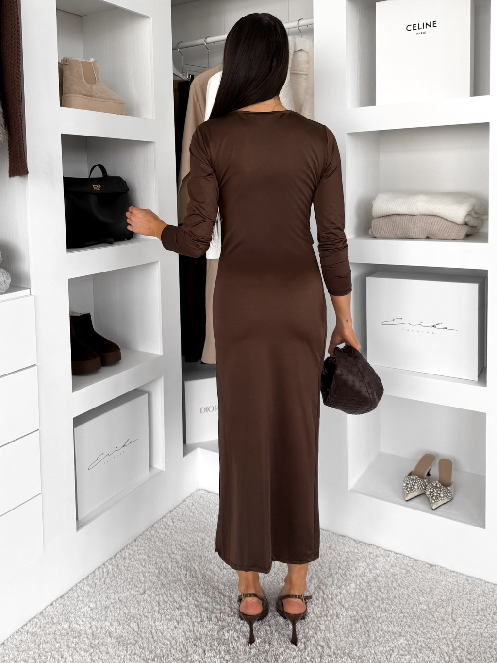 Hnědé společenské midi šaty NUREILA s rozparkem