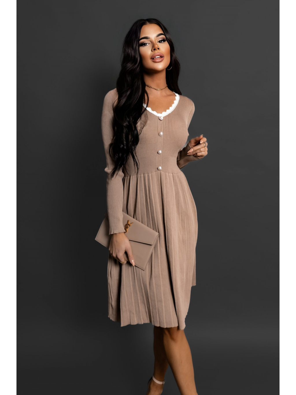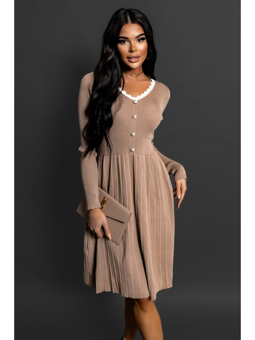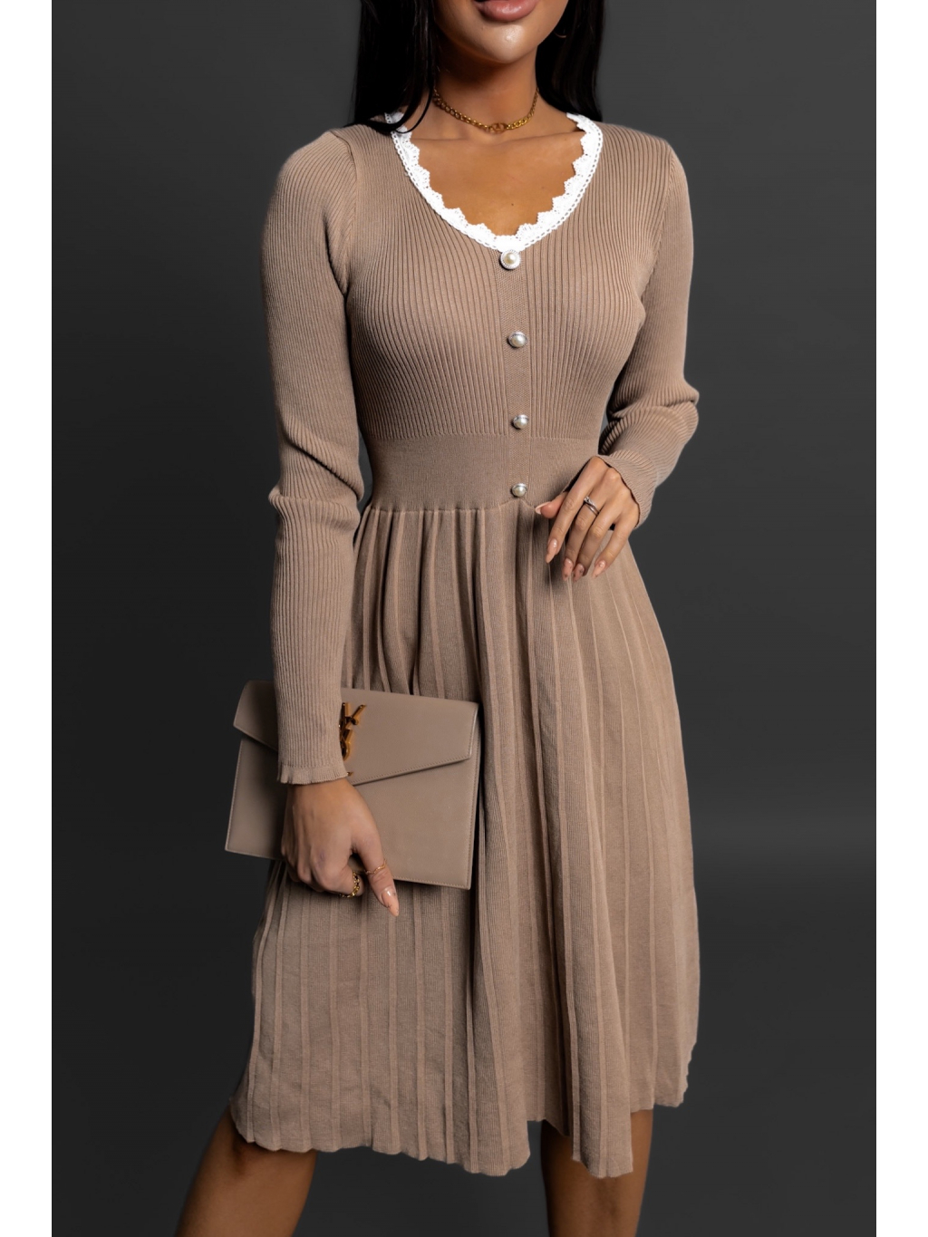 Hnědé úpletové šaty LAIA s dlouhým rukávem