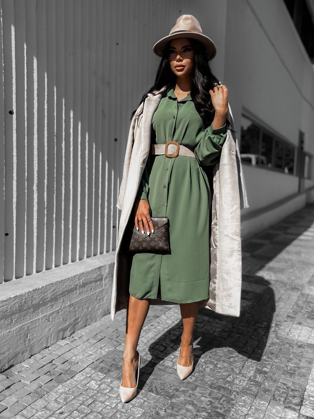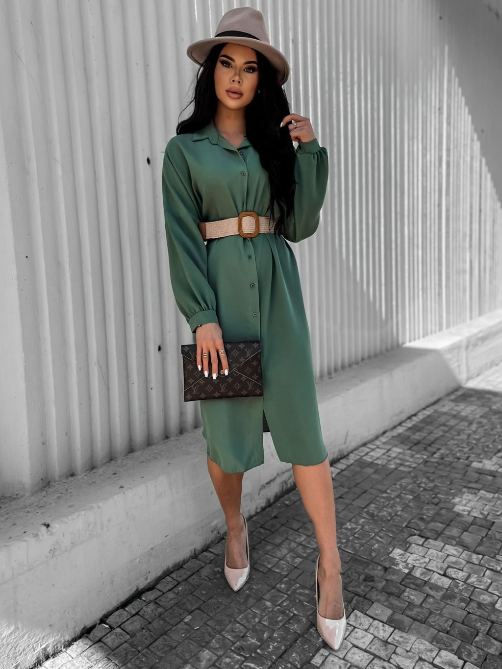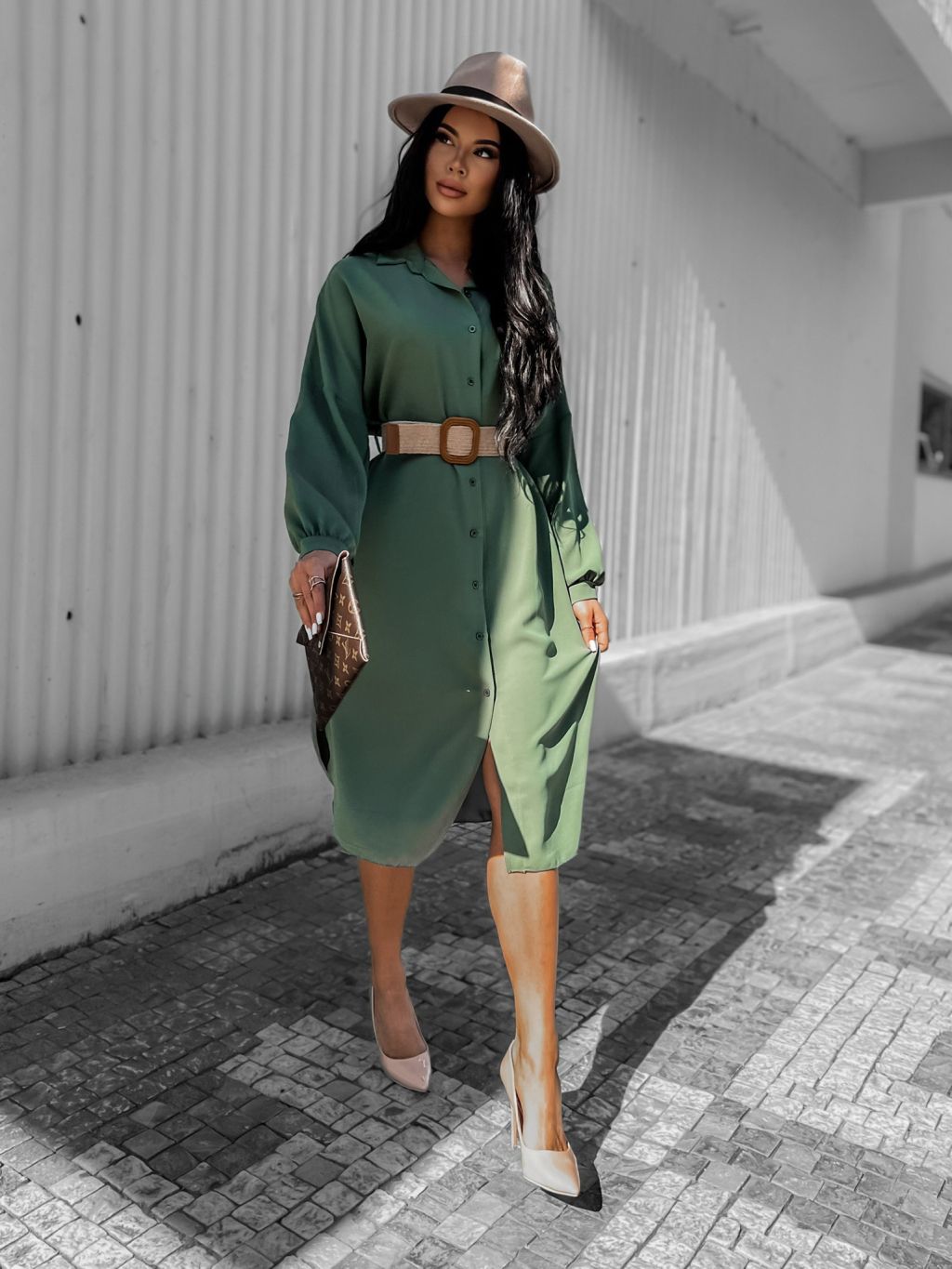 Khaki elegantní košilové šaty AMPRI s páskem