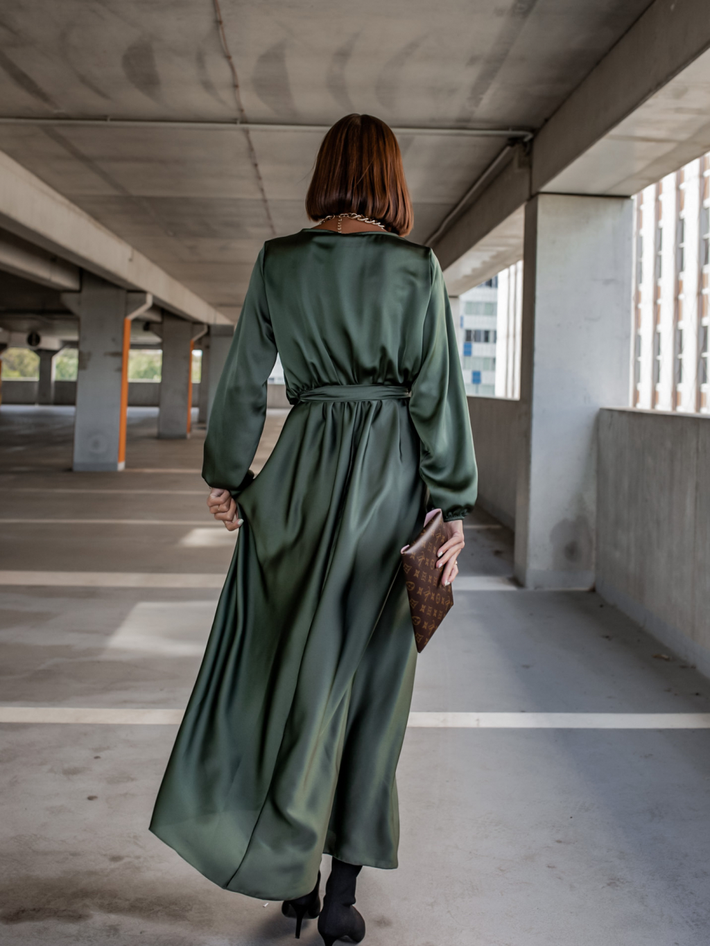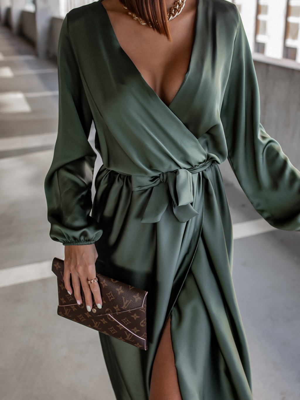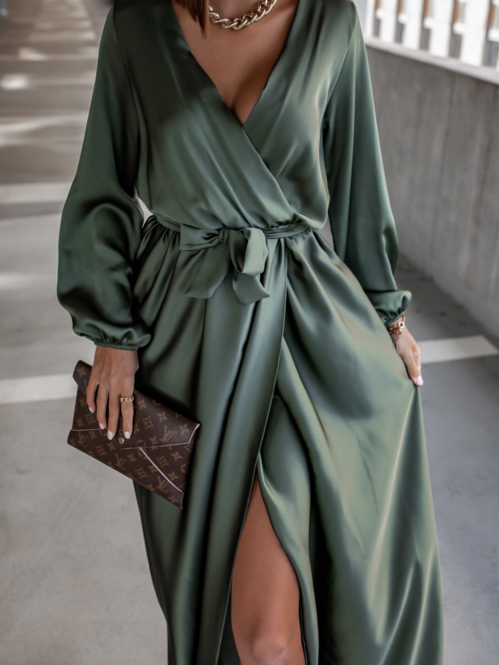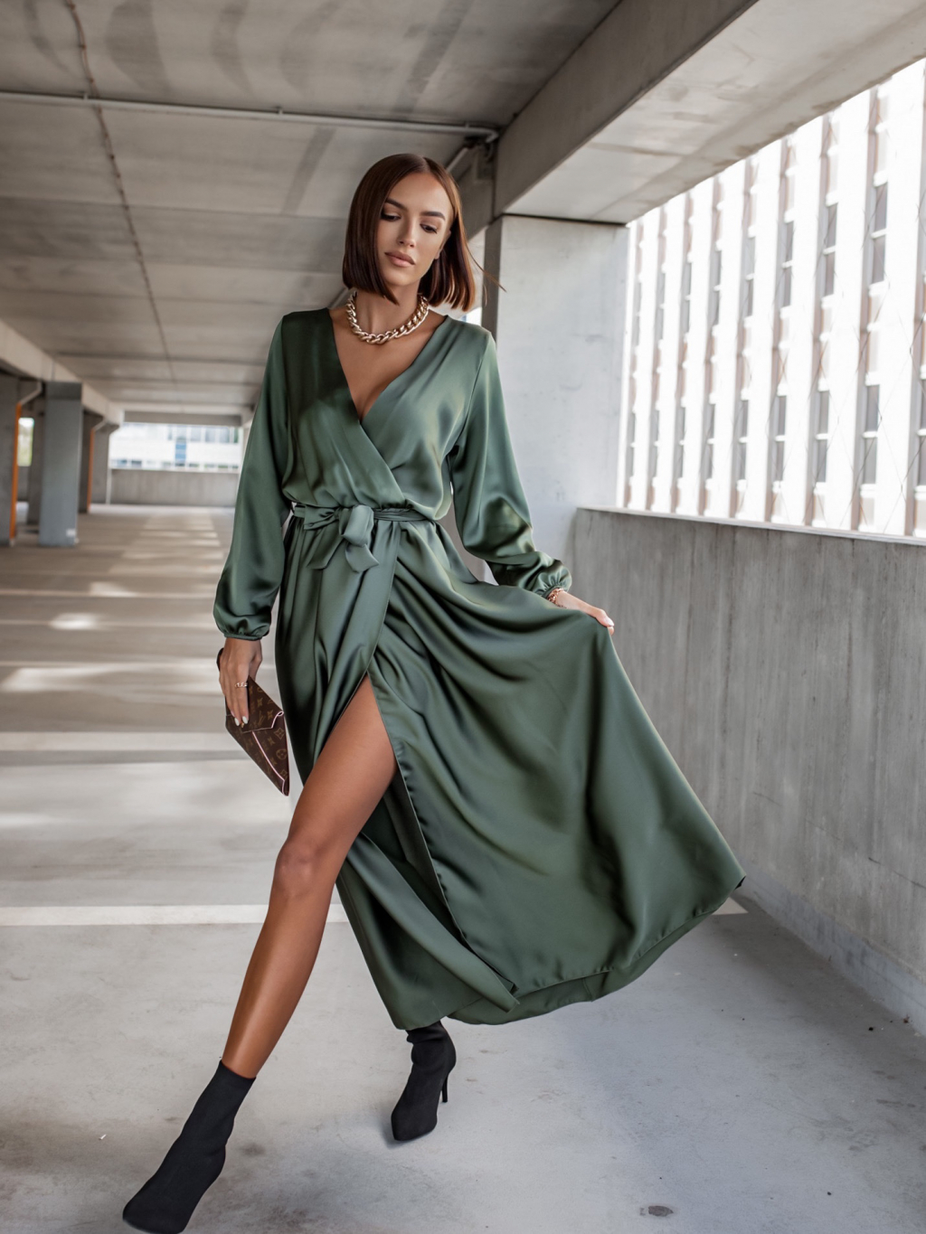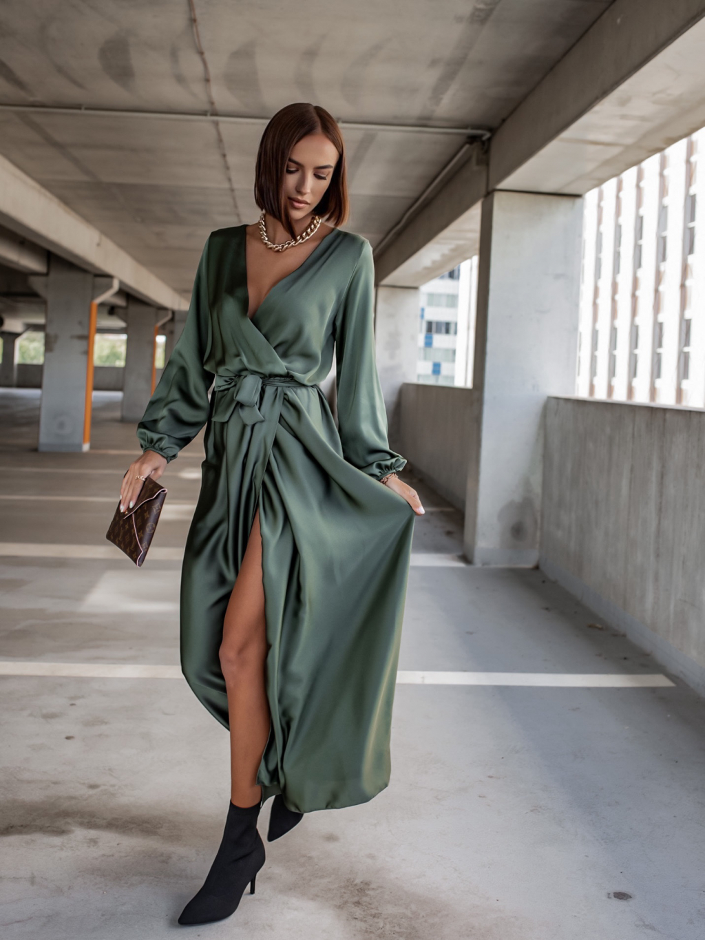 Elegantní saténové maxi šaty, které okouzlí svou lehkostí a ženskostí. Hladký lesklý materiál jemně splývá po postavě a vytváří luxusní efekt při každém kroku. Zavazování v pase krásně zvýrazní siluetu a dodá modelu sofistikovaný nádech. Výrazný rozparek na sukni působí svůdně a zároveň zajišťuje maximální pohodlí a volnost pohybu. Perfektní volba pro společenské události, večírky či slavnostní příležitosti.