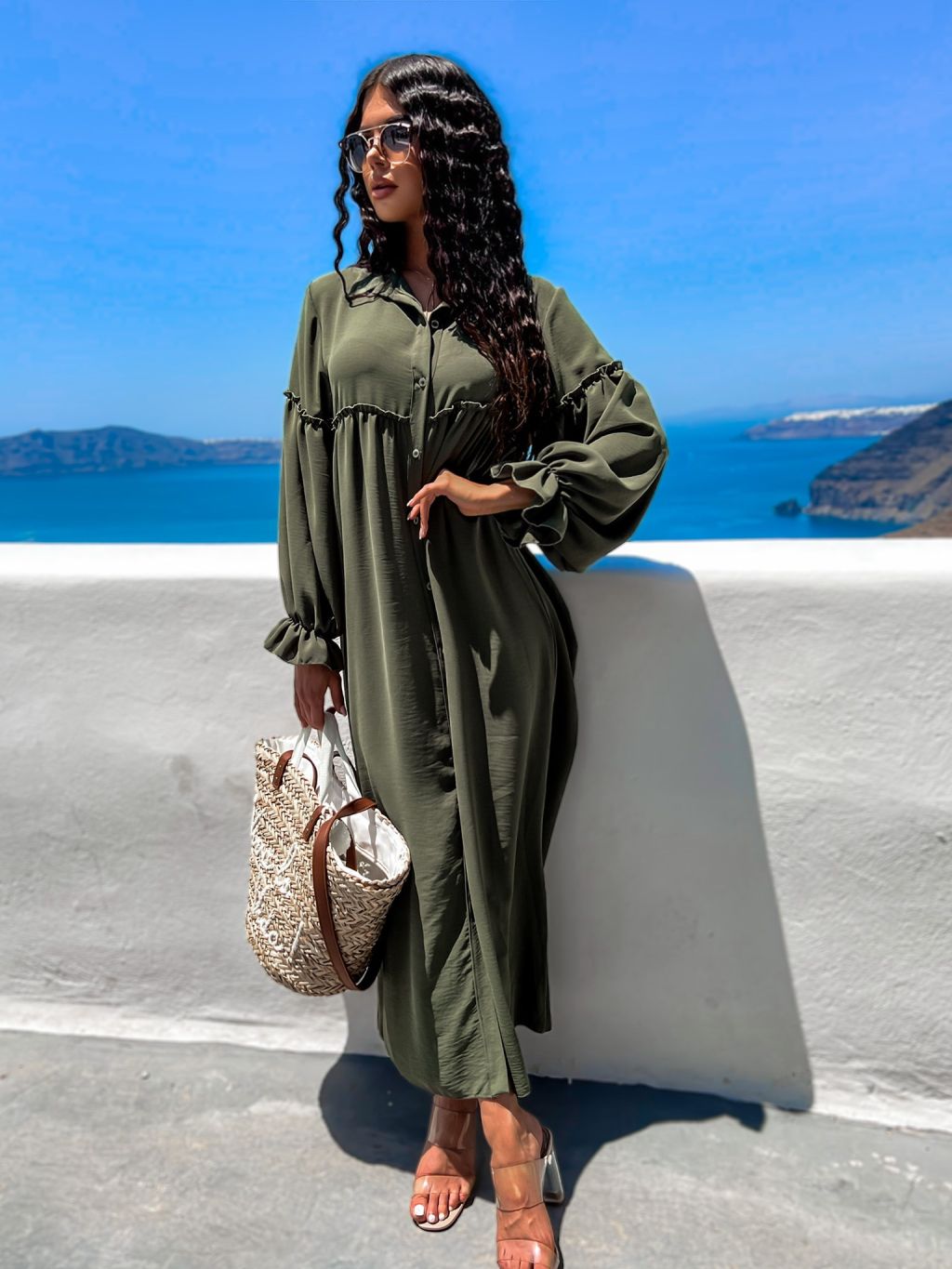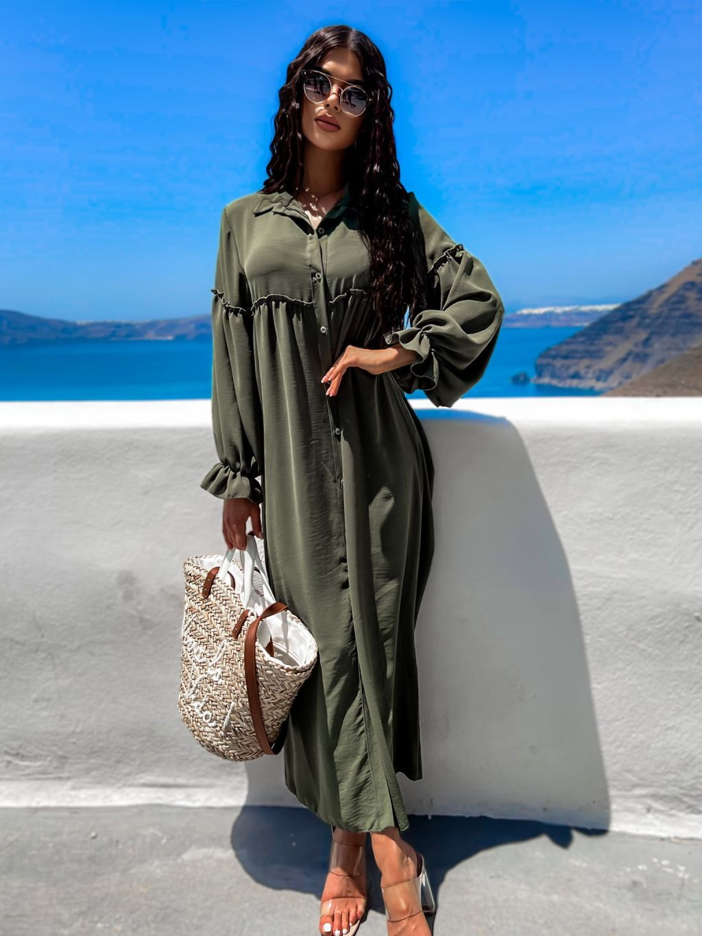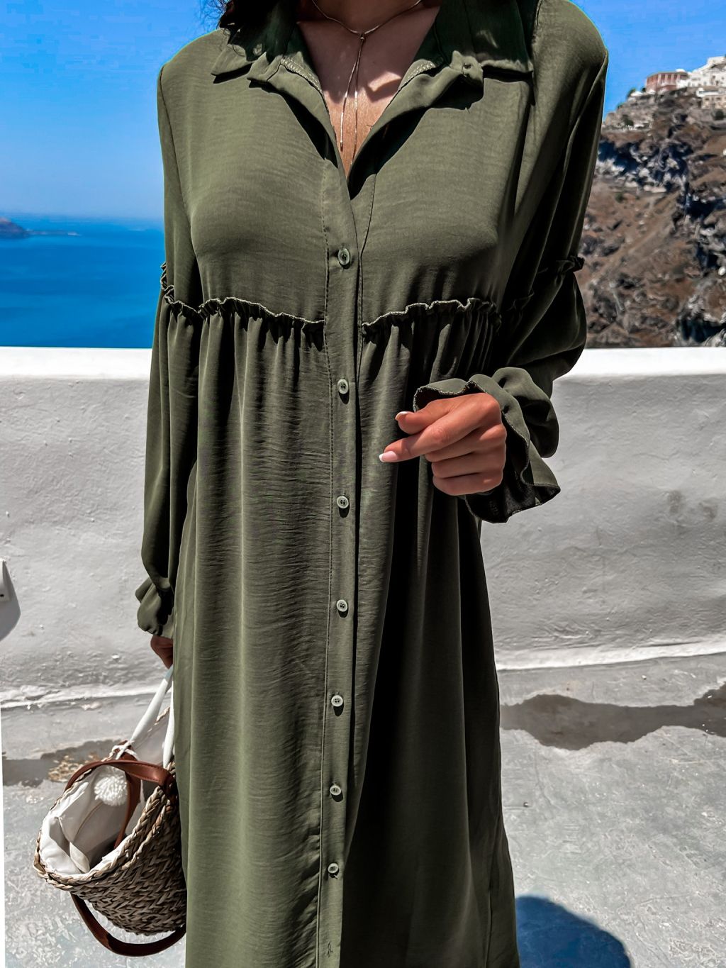 Khaki košilové šaty KALI s volánky