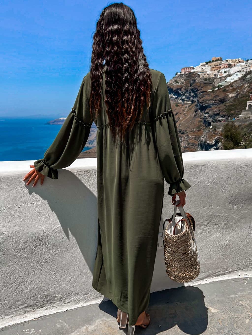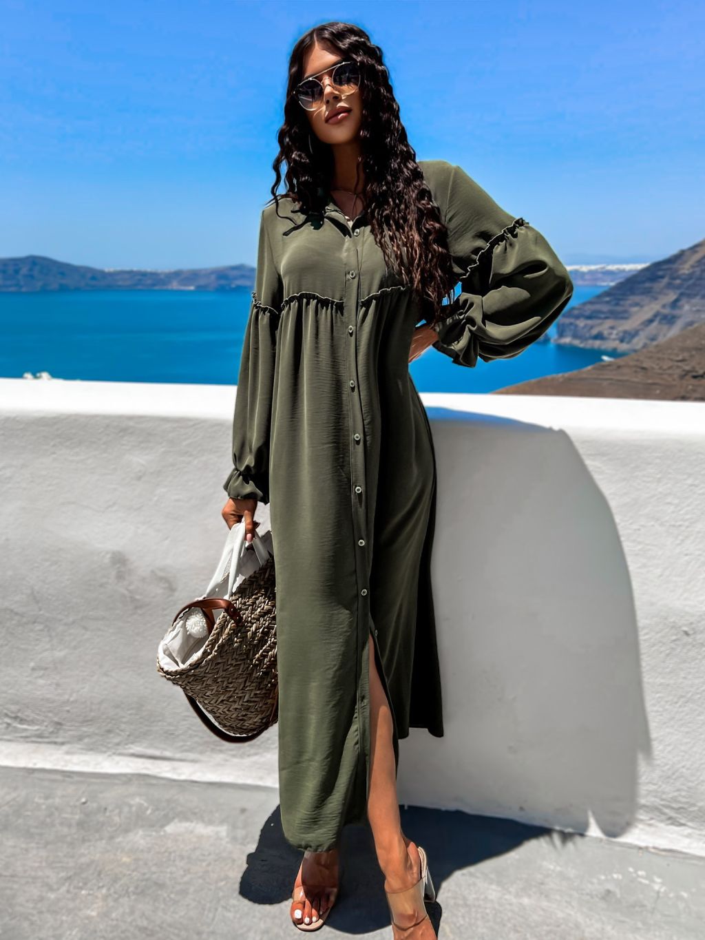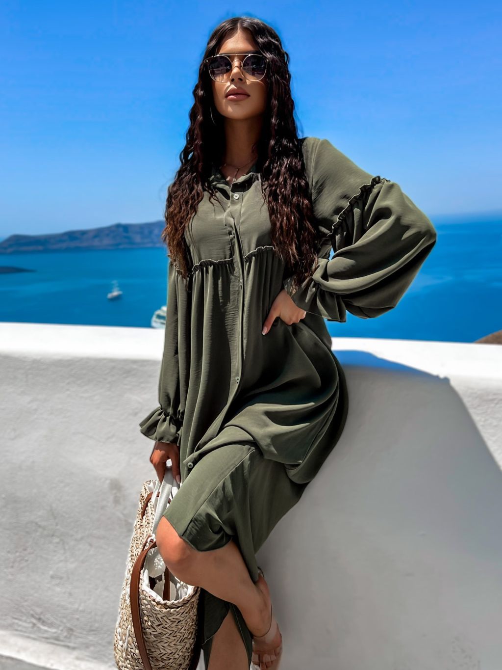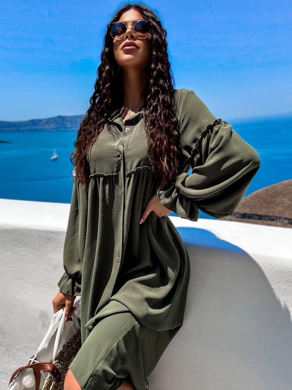 Khaki košilové šaty KALI s volánky