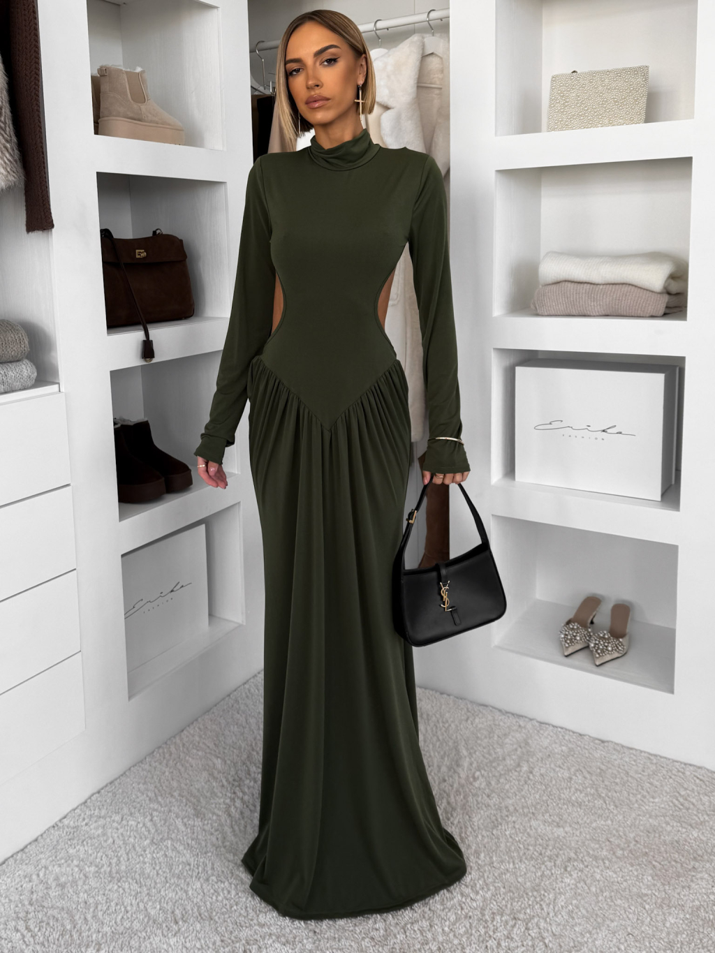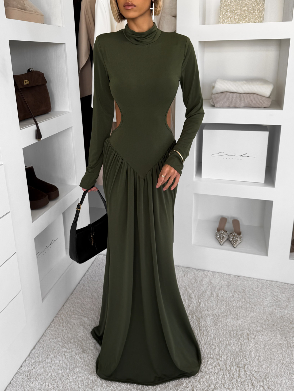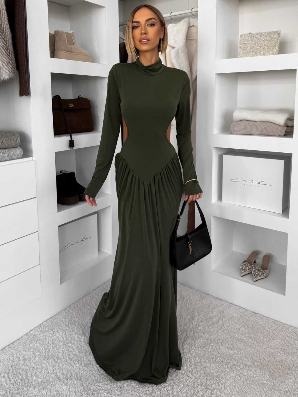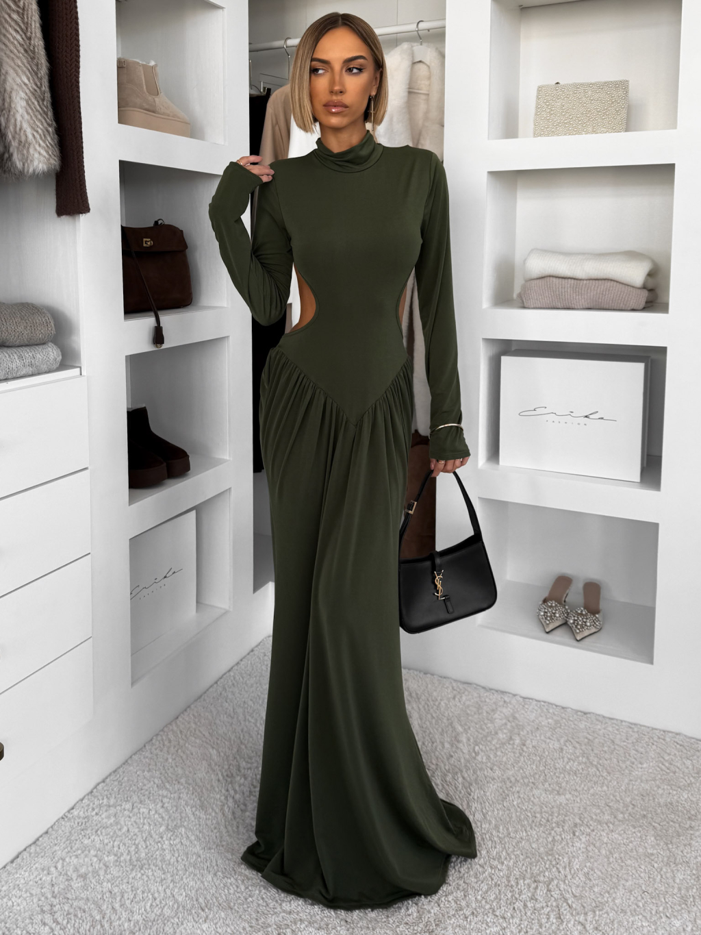 Khaki společenské dlouhé šaty EVANIE s průstřihy