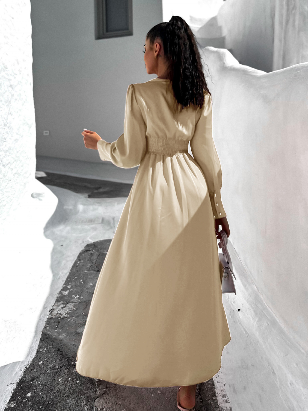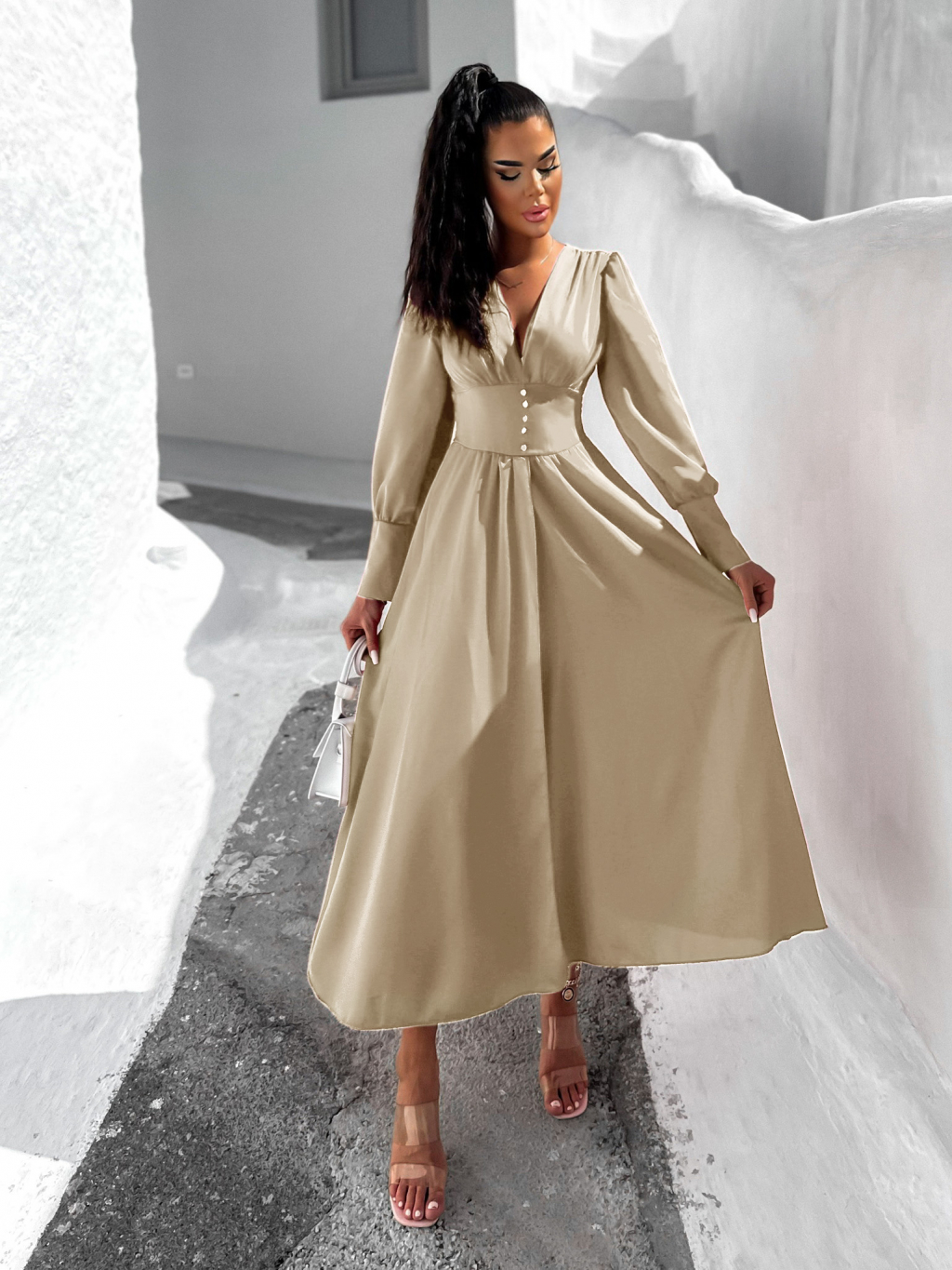 Krémové dlouhé šaty FALLENS s dlouhým rukávem