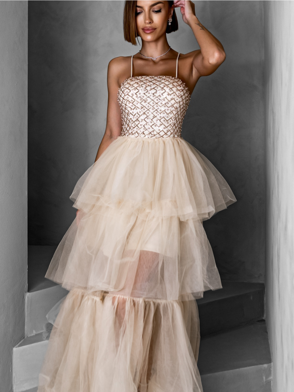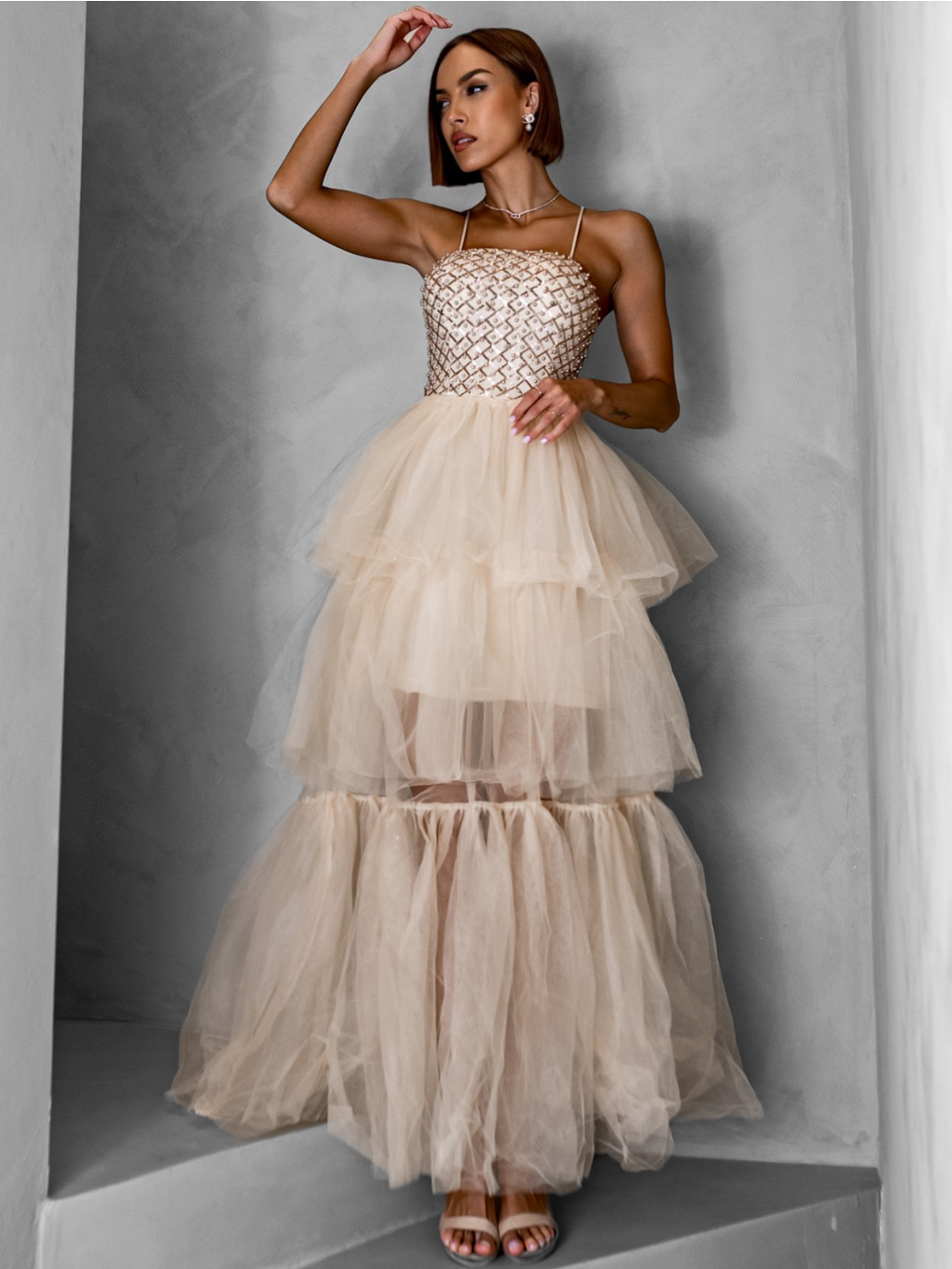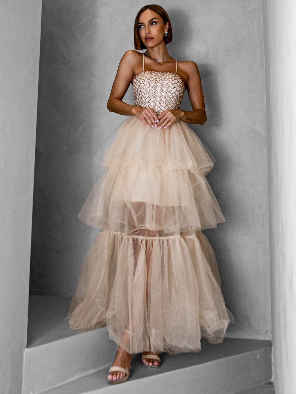 Krémové dlouhé tylové šaty FREDOX s volánem
