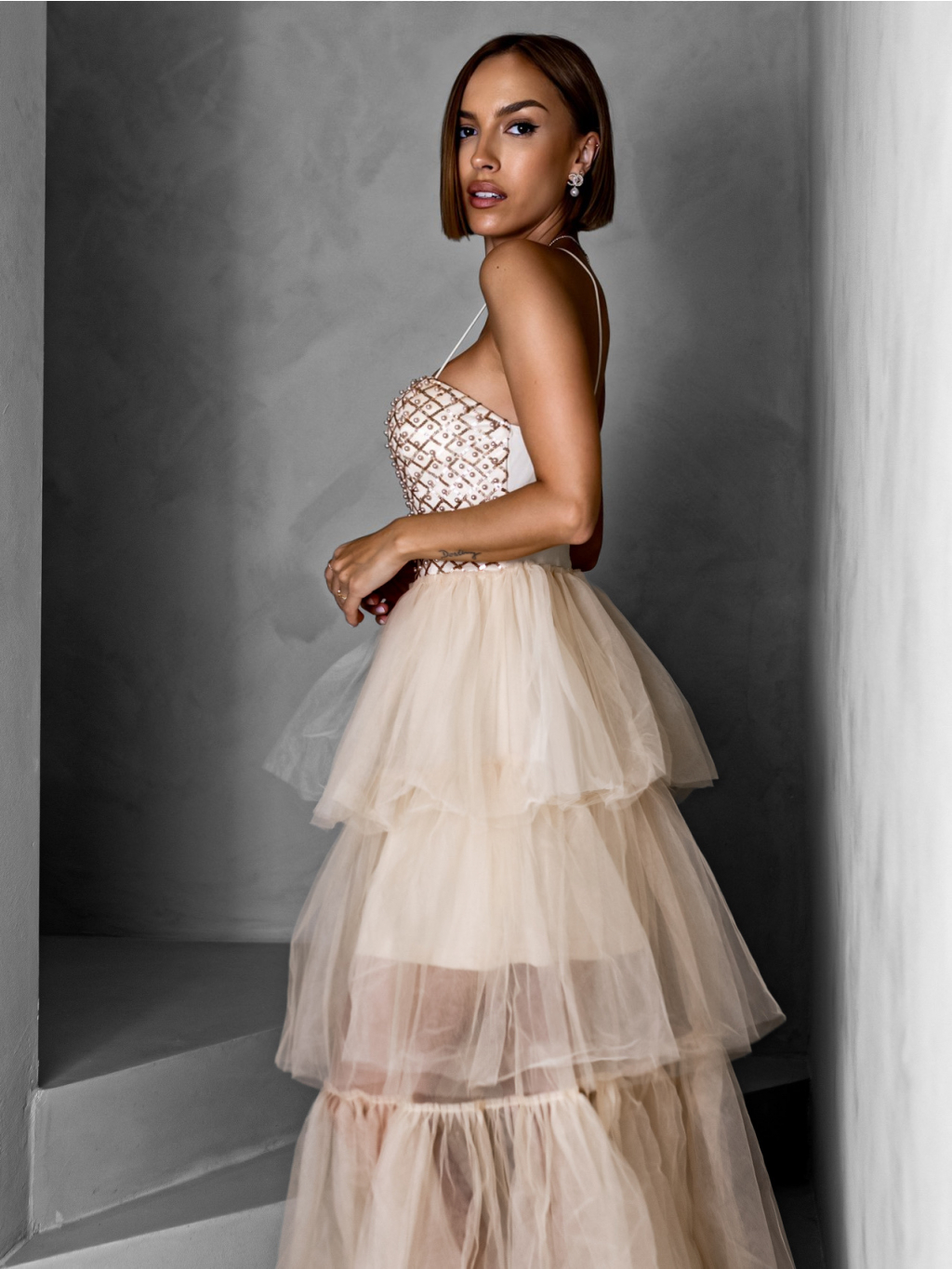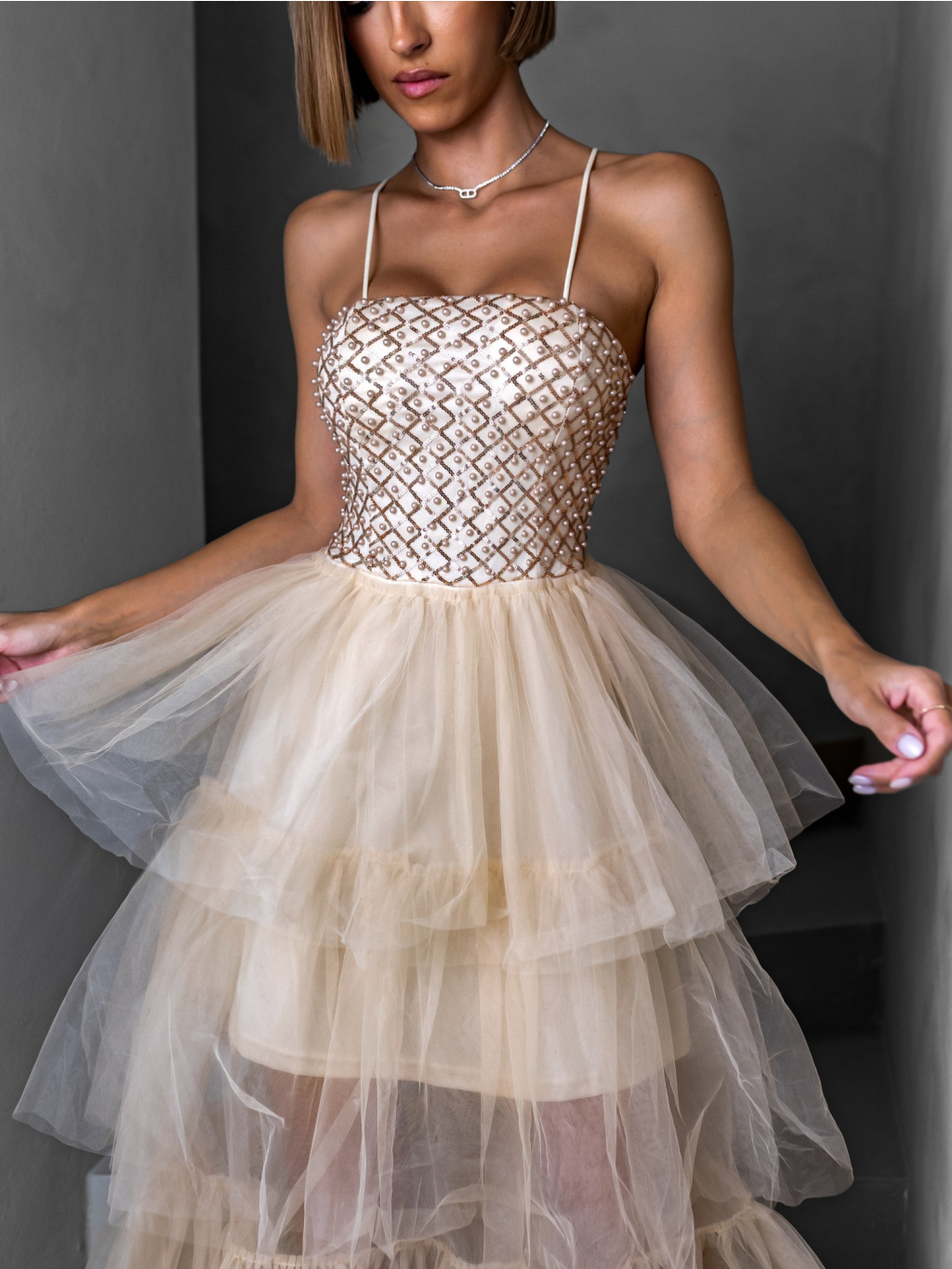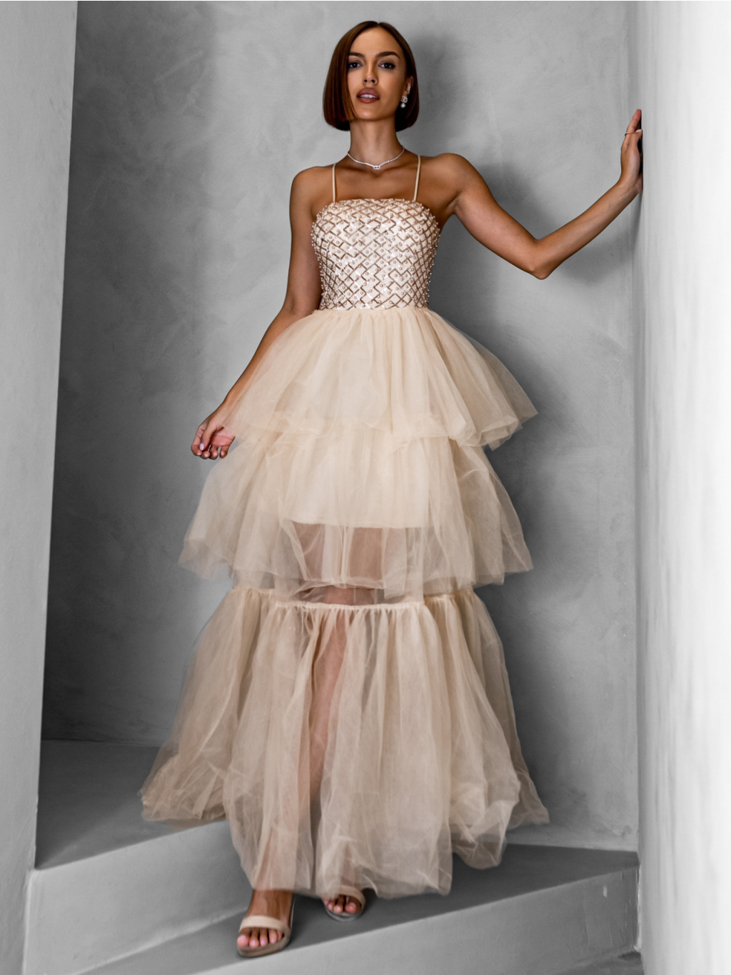 Krémové dlouhé tylové šaty FREDOX s volánem