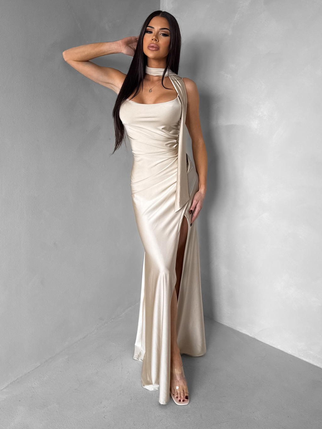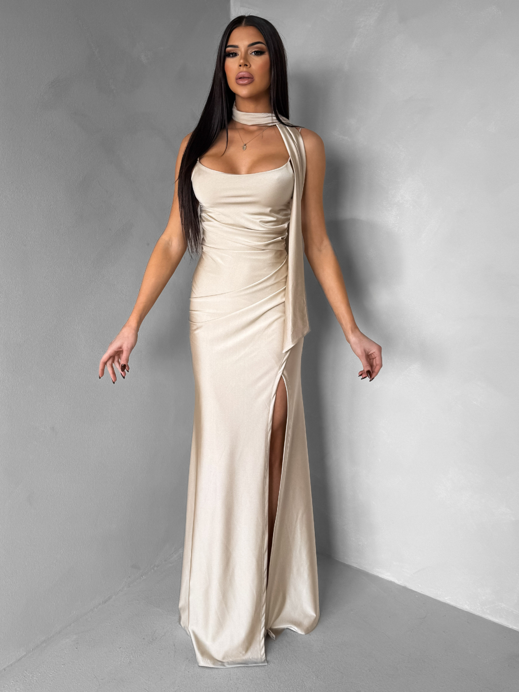 Krémové společenské dlouhé šaty BELUNA