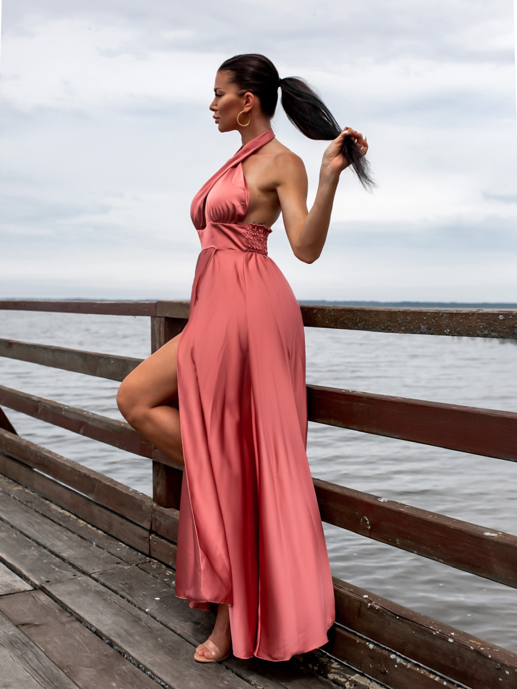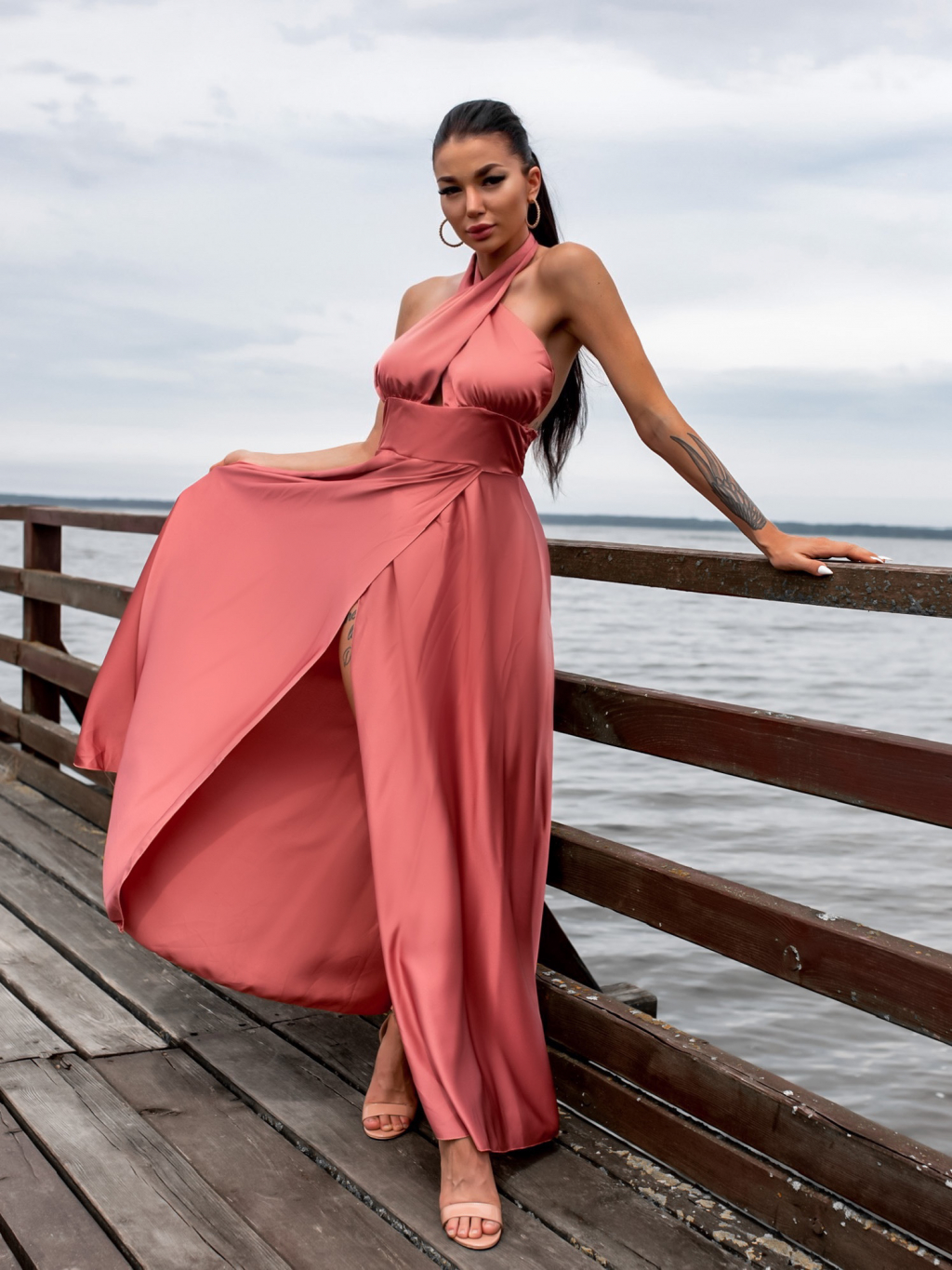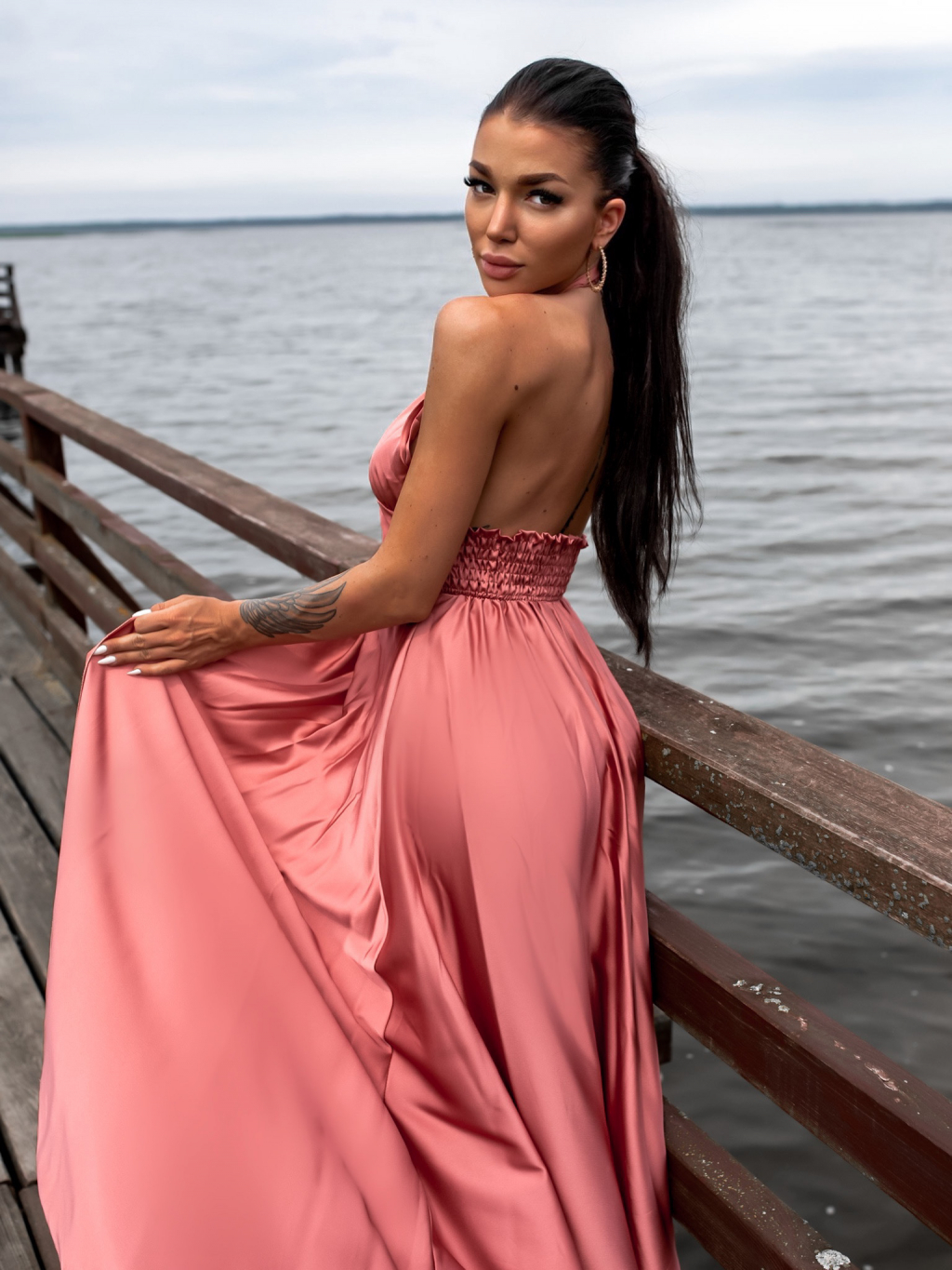 Malinové dlouhé lesklé šaty THERESA s rozparkem