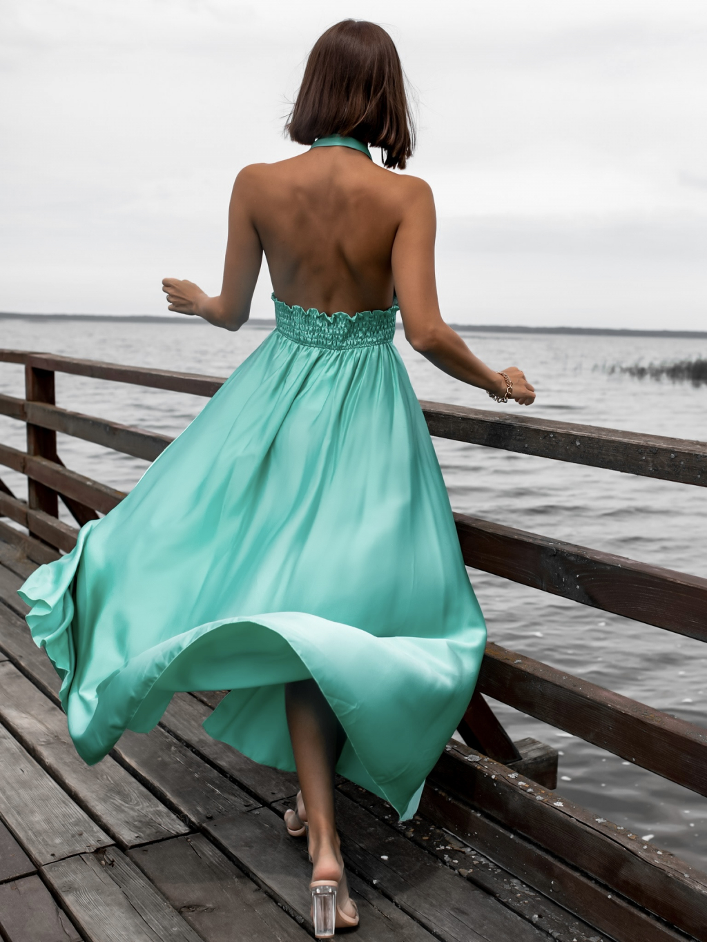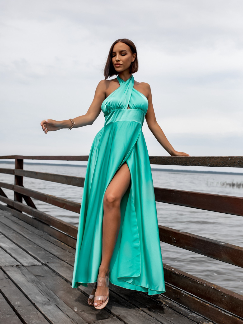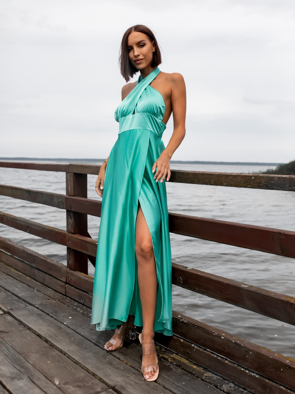Mentolové dlouhé lesklé šaty THERESA s rozparkem