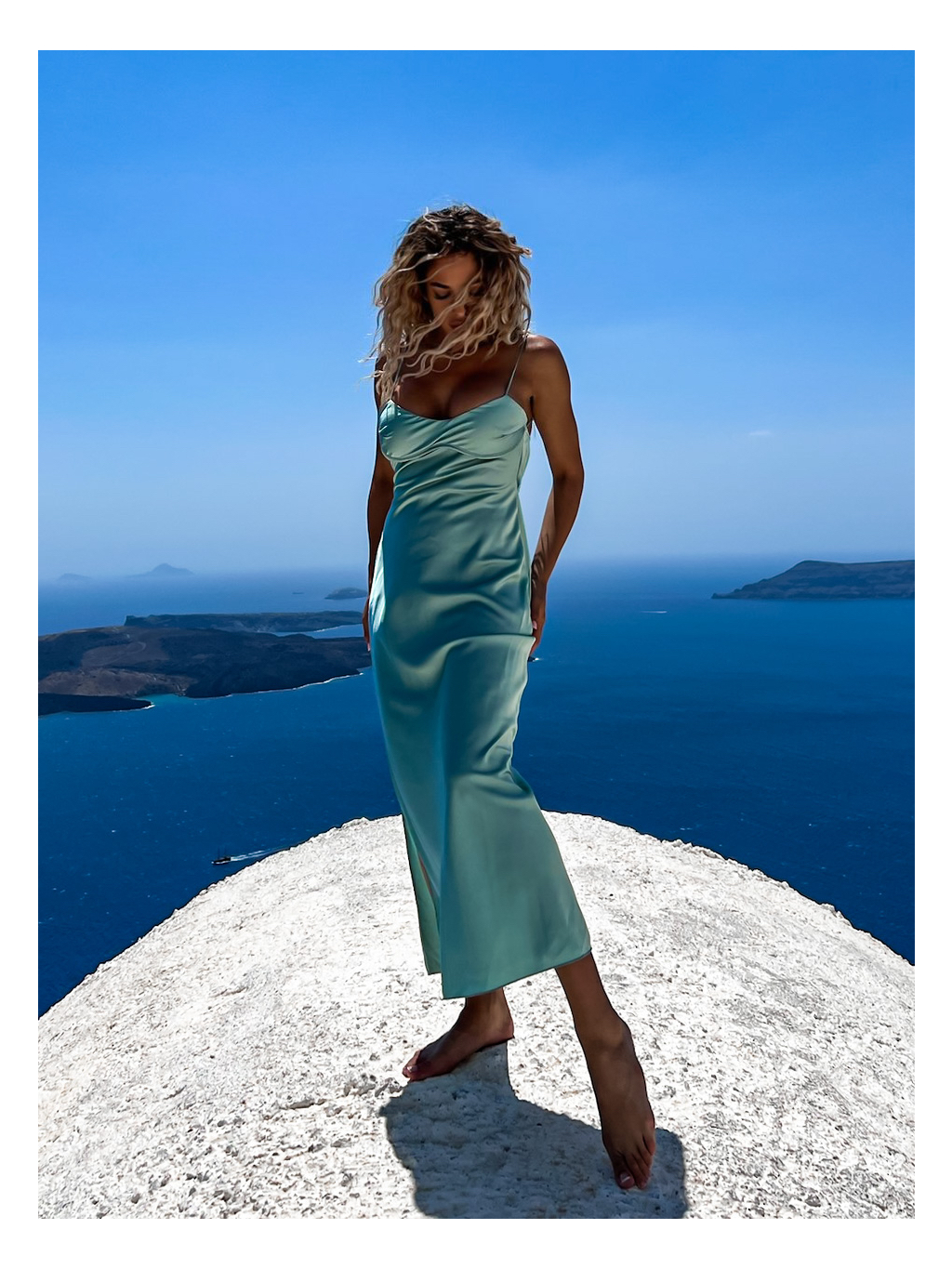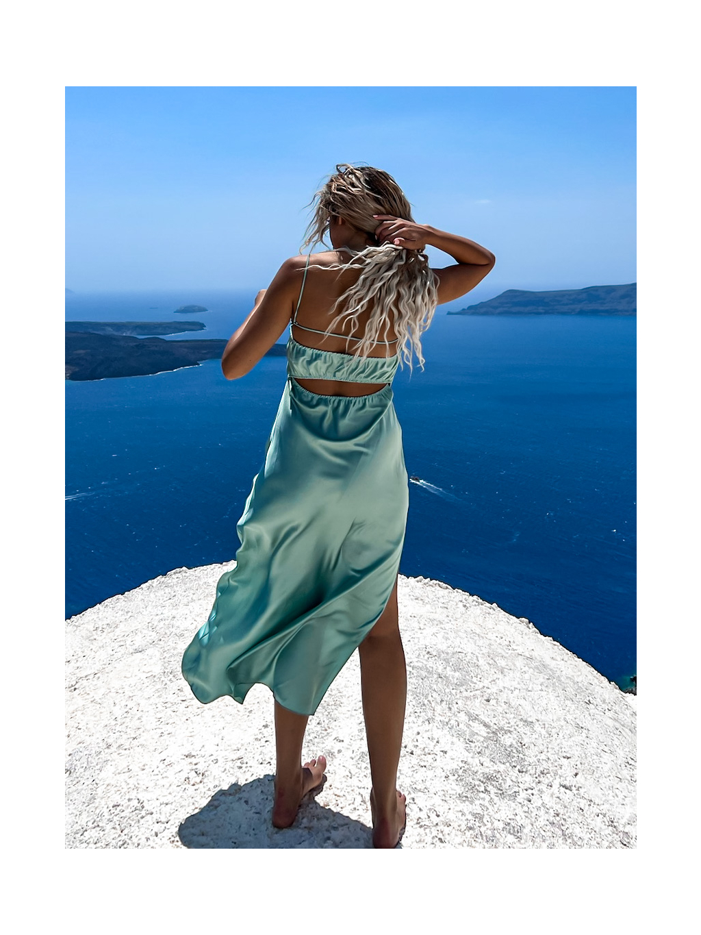 Mentolové lesklé šaty DOLOMIT s průstřihy