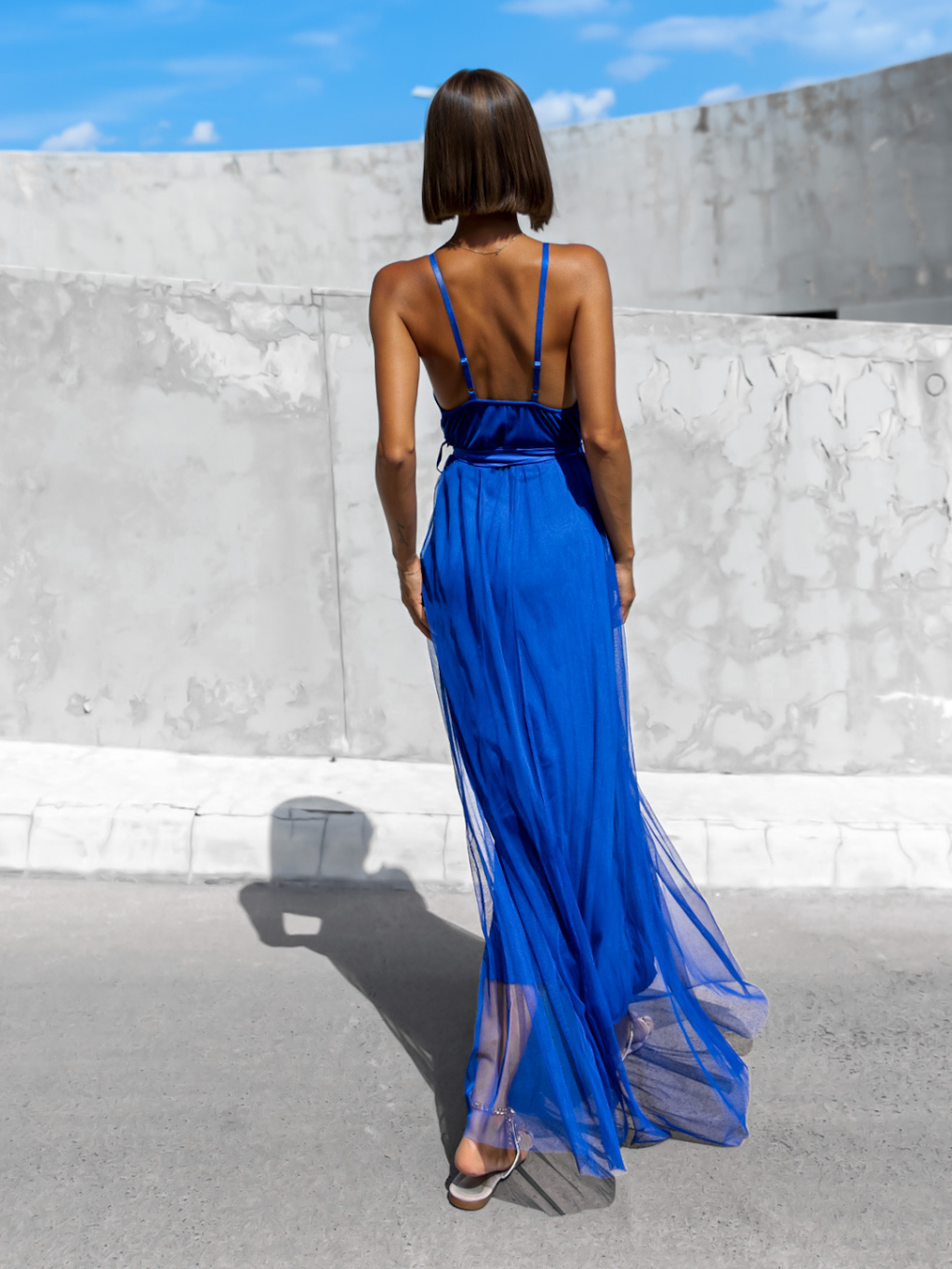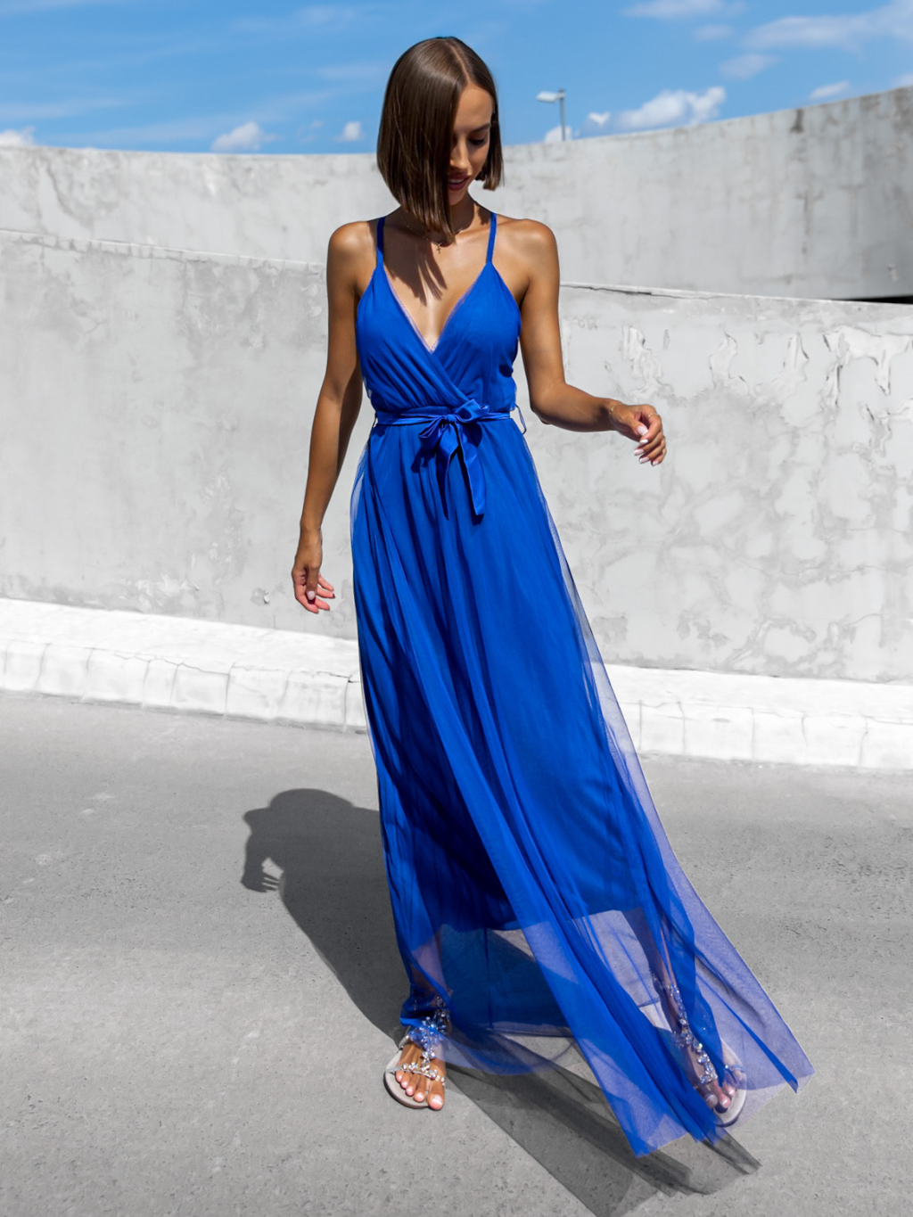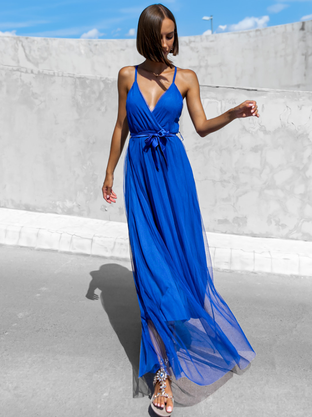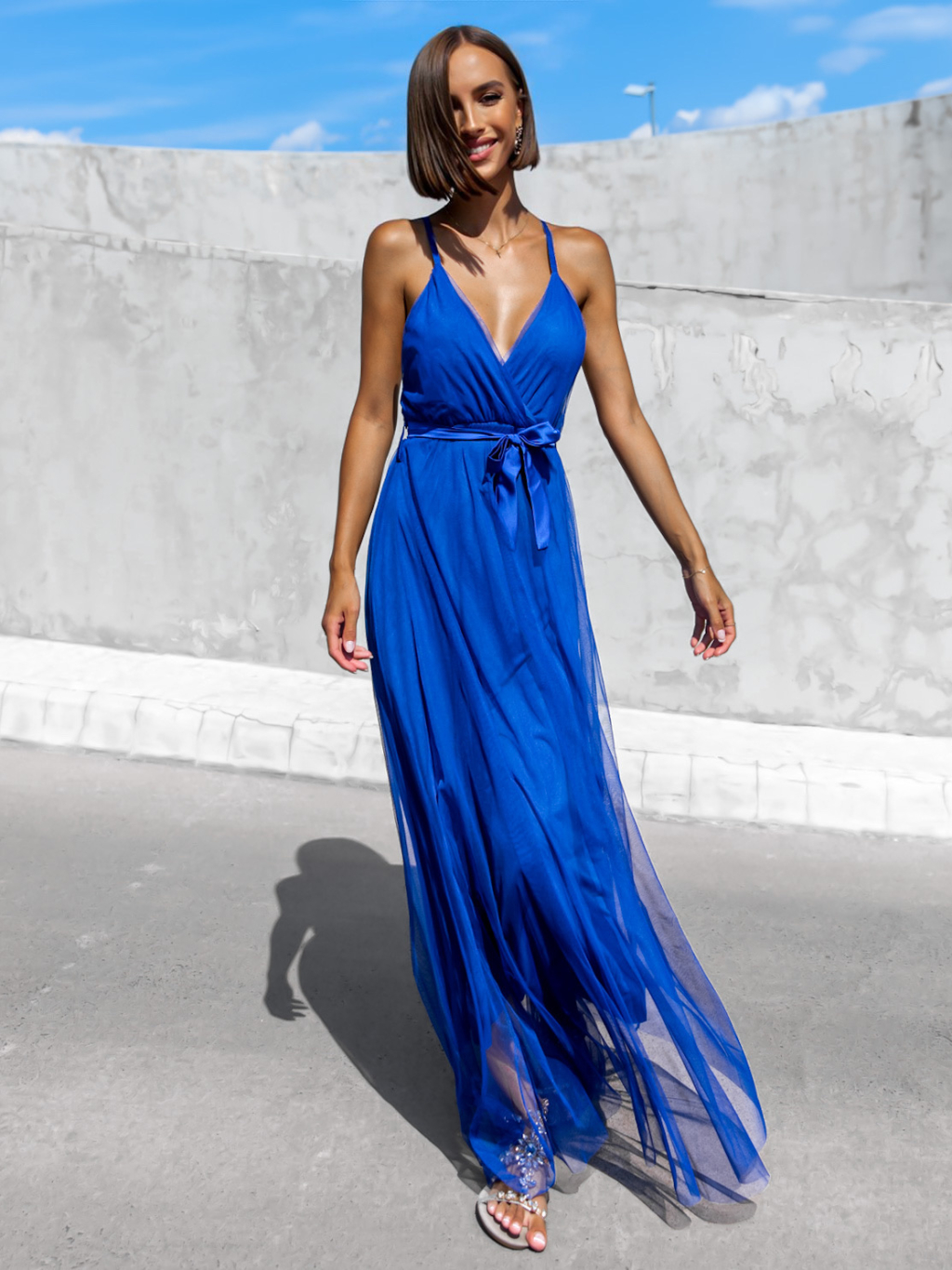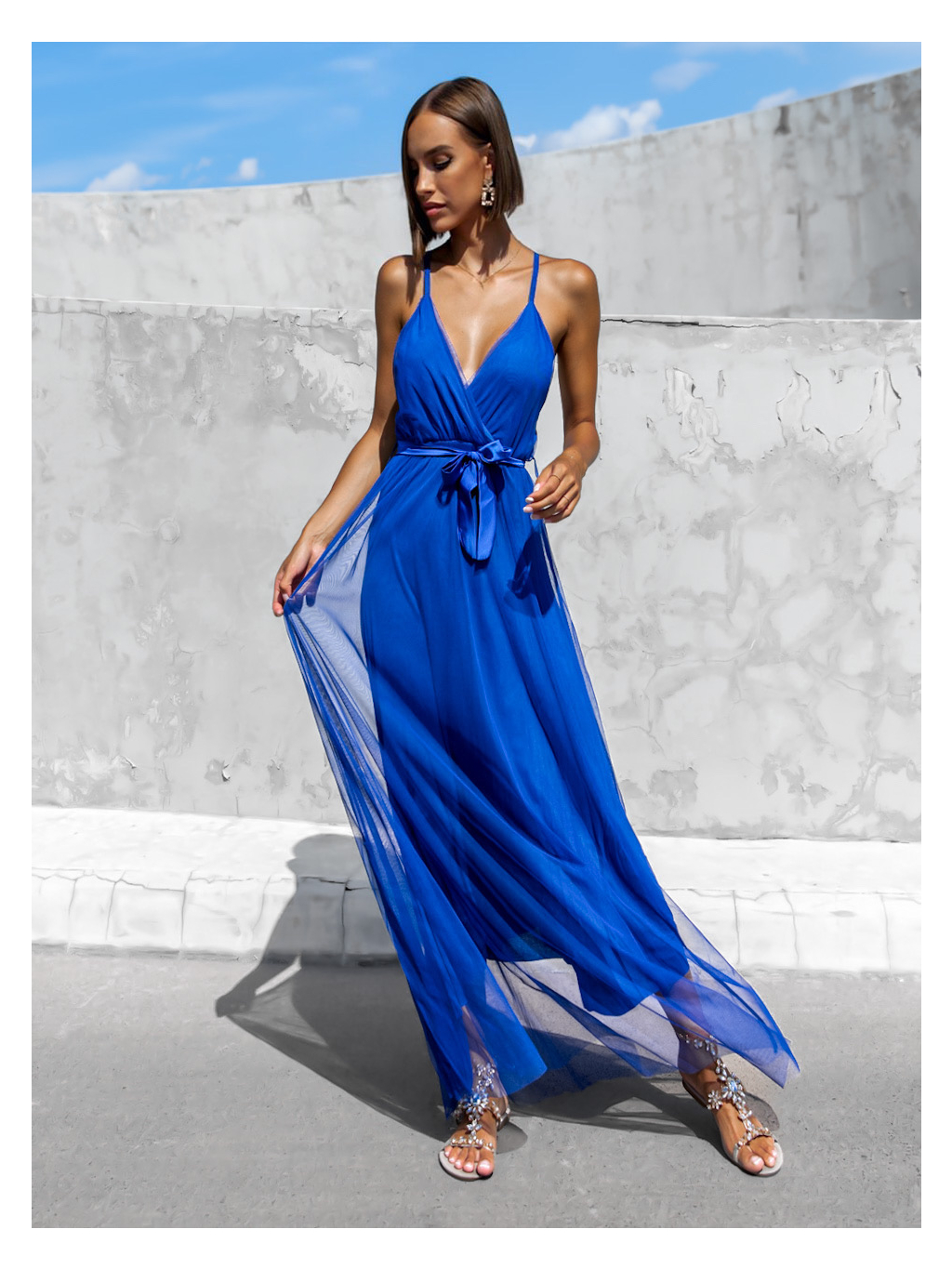 Modré dlouhé elegantní šaty MONARCH na zavazování
