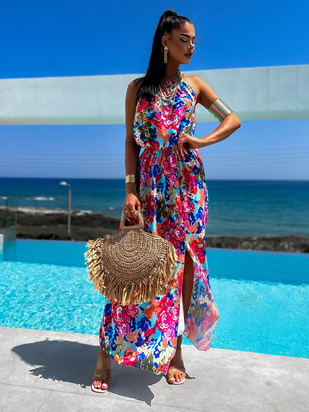 Modré dlouhé elegantní šaty PETYRE s květinovým vzorem