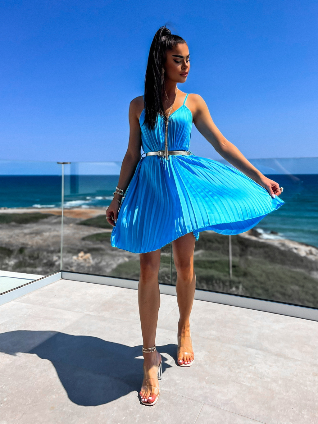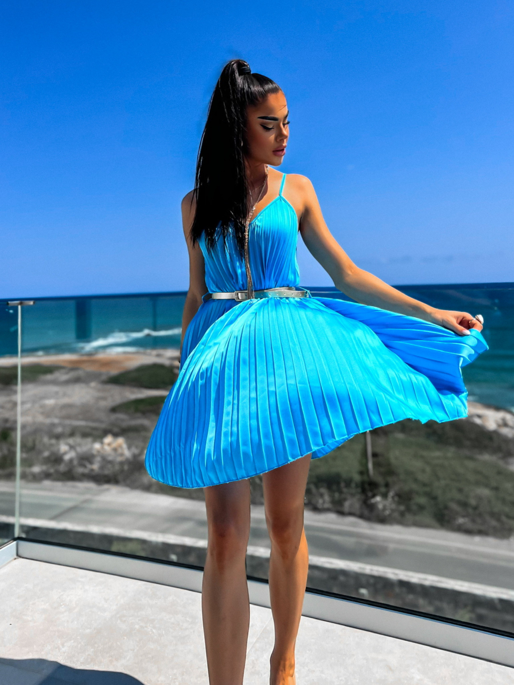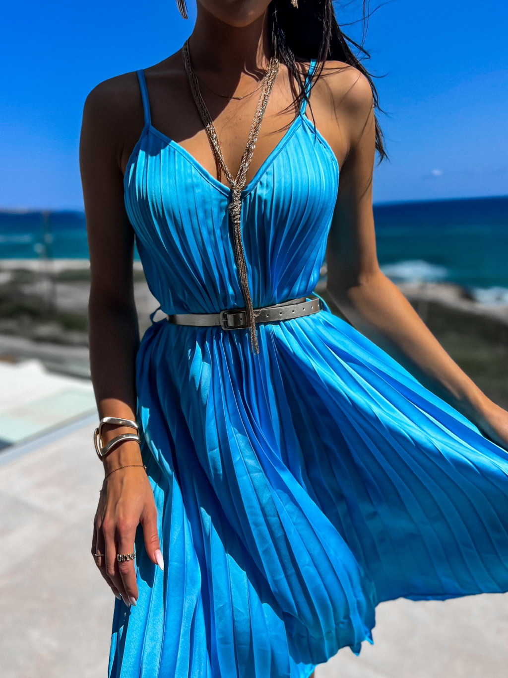 Modré lesklé plisované šaty CLAURA se zlatým páskem