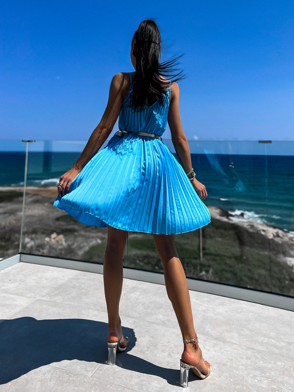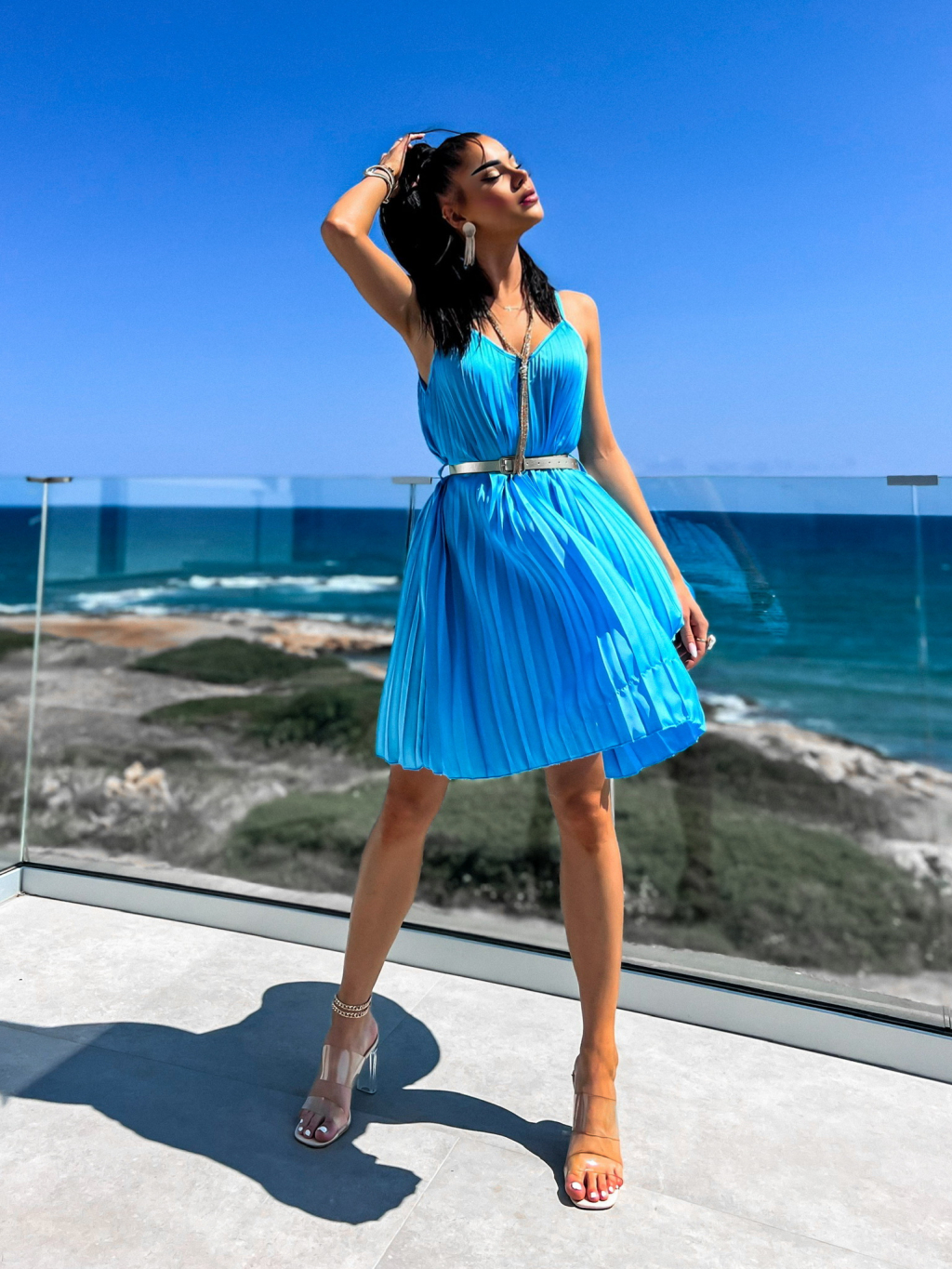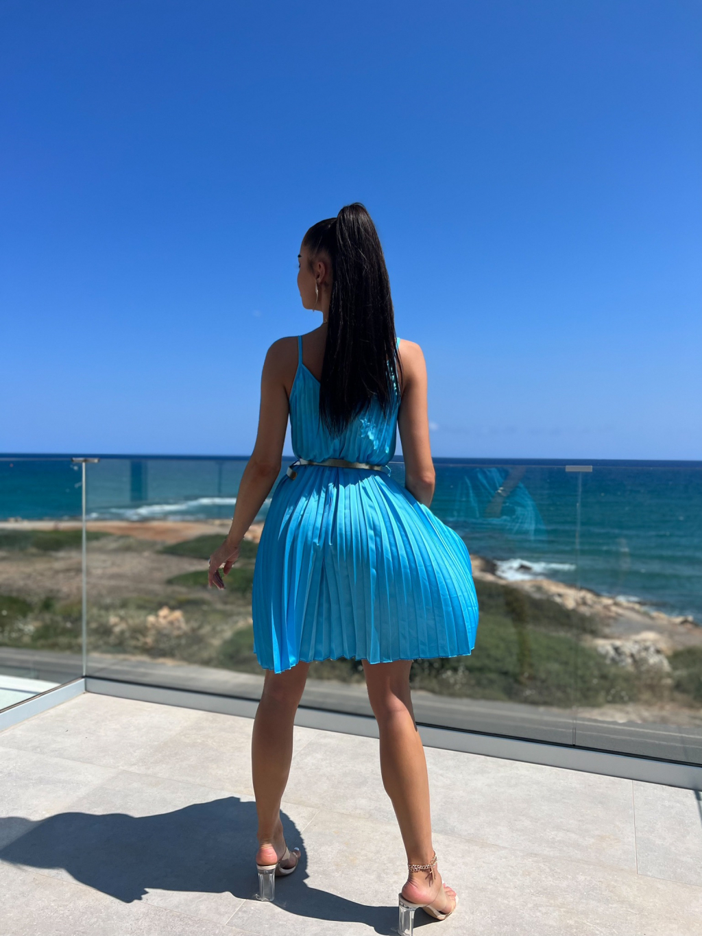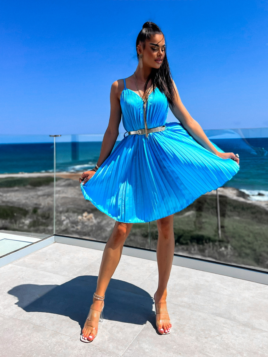 Modré lesklé plisované šaty CLAURA se zlatým páskem