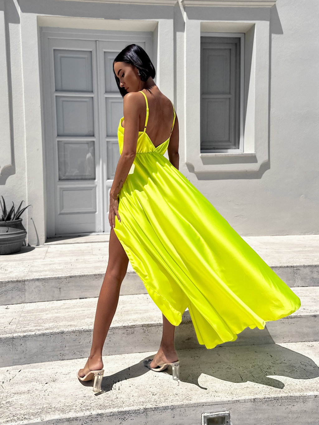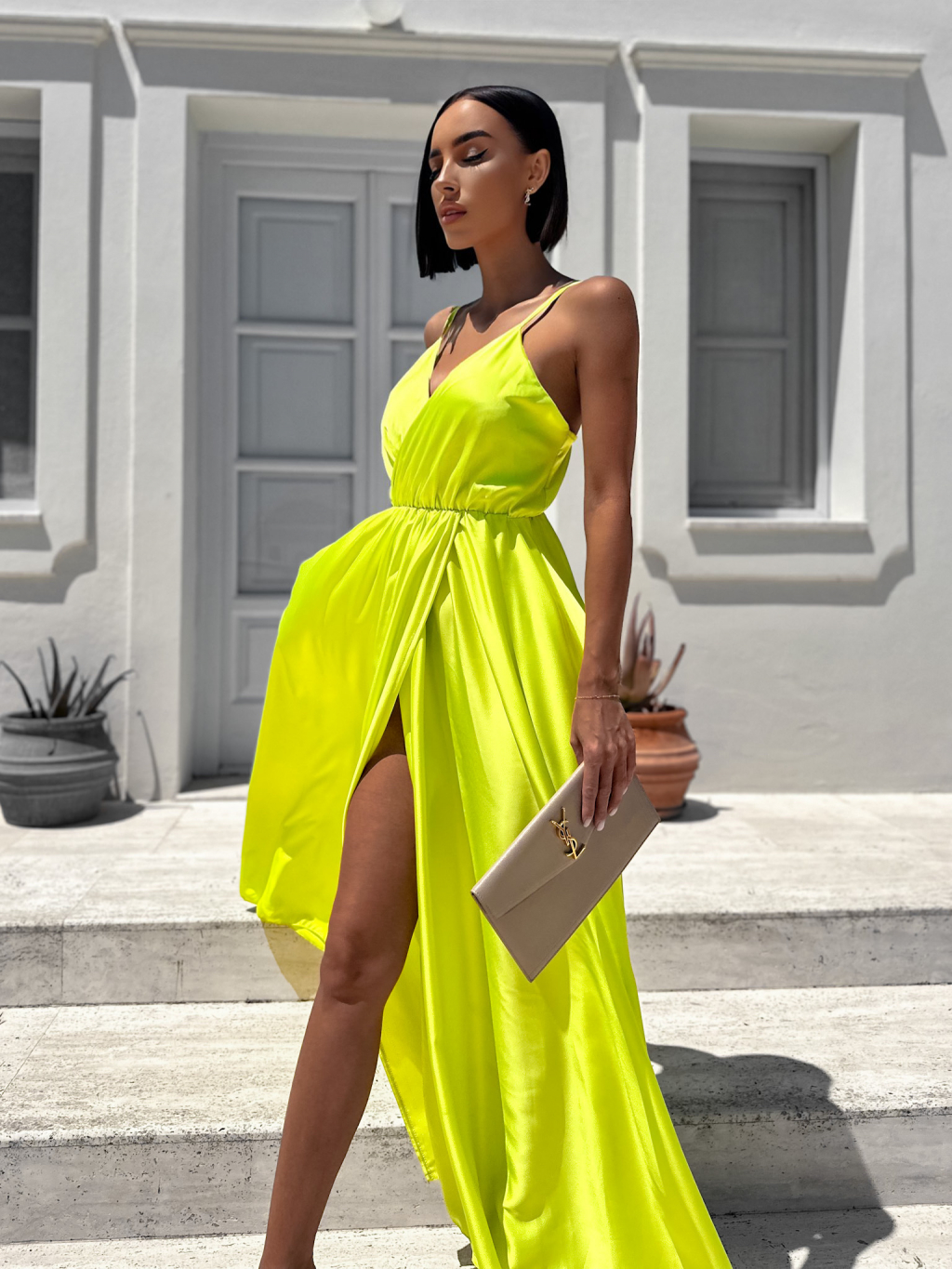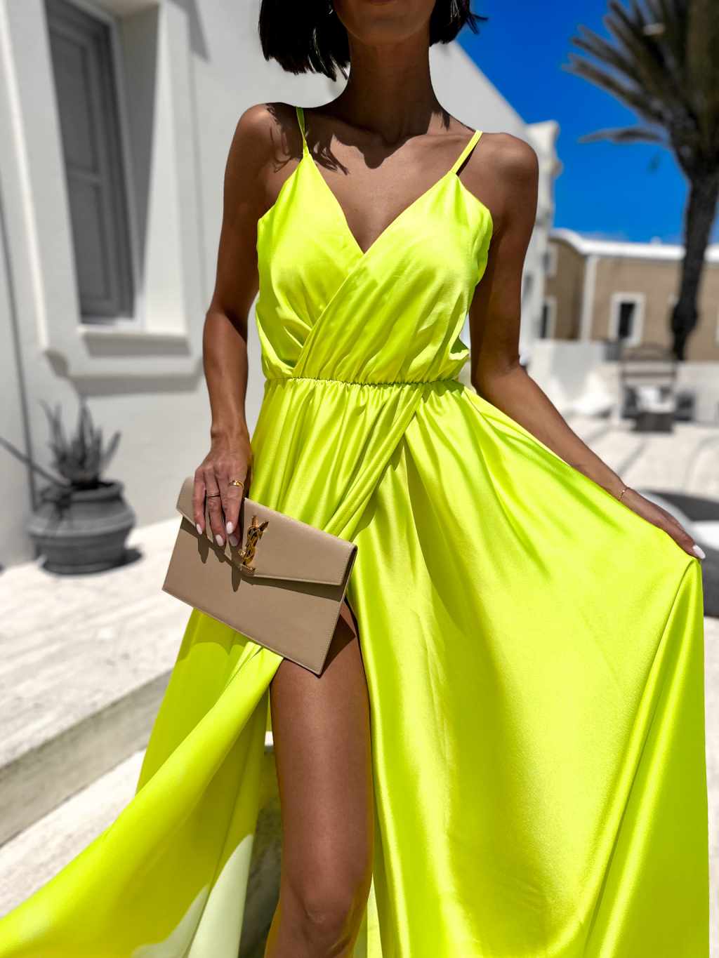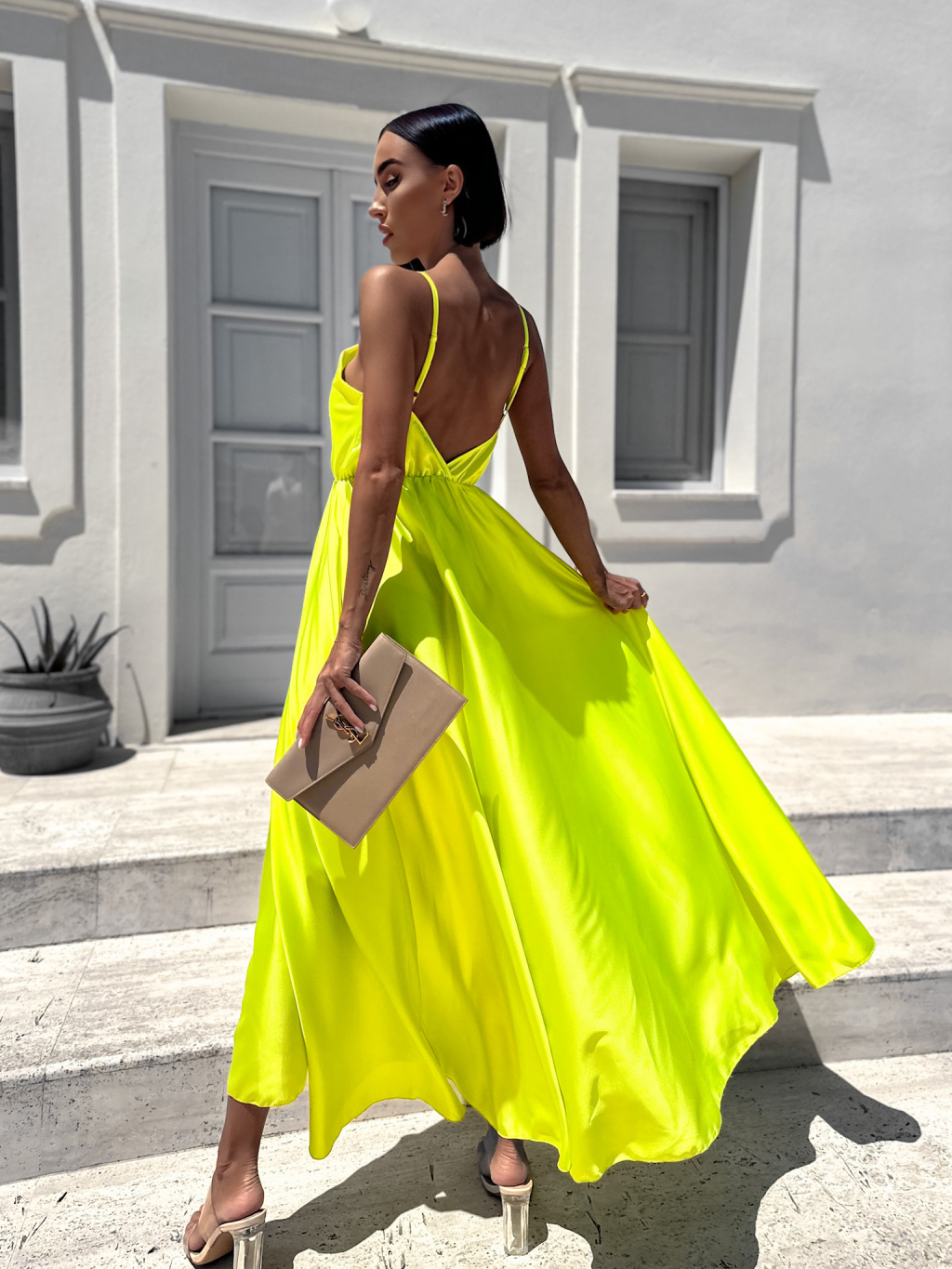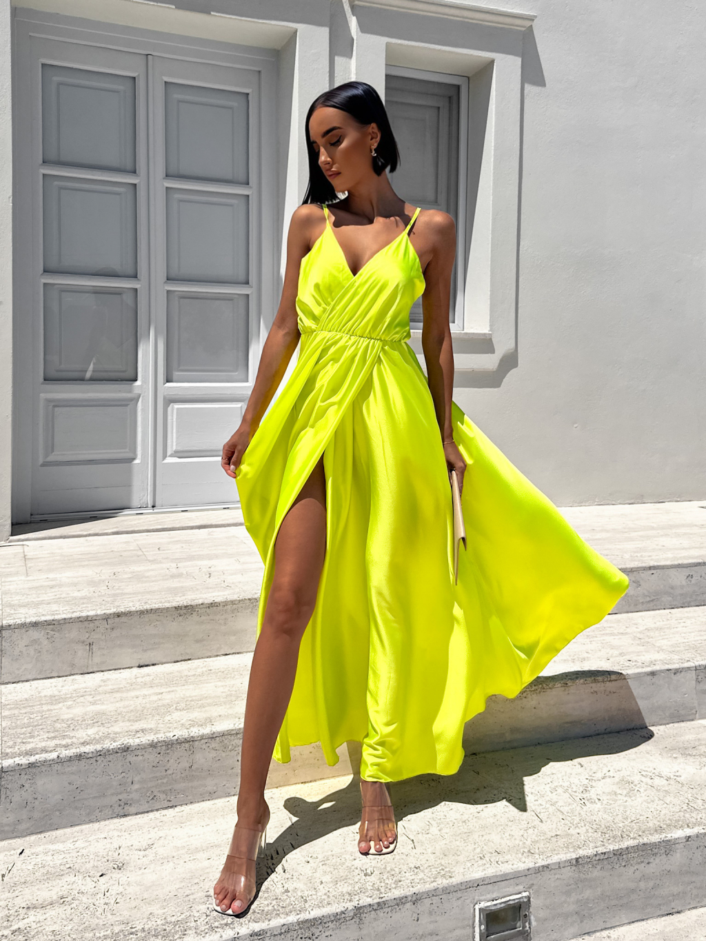Neon zelené lesklé dlouhé plesové šaty CHRYSANTHE