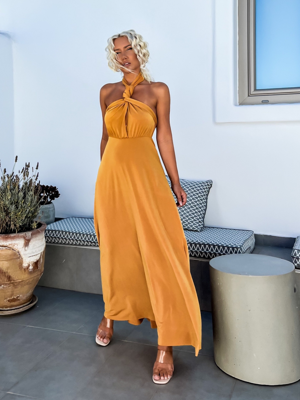 Okrové elegantní šaty BEATRICE s vázáním
