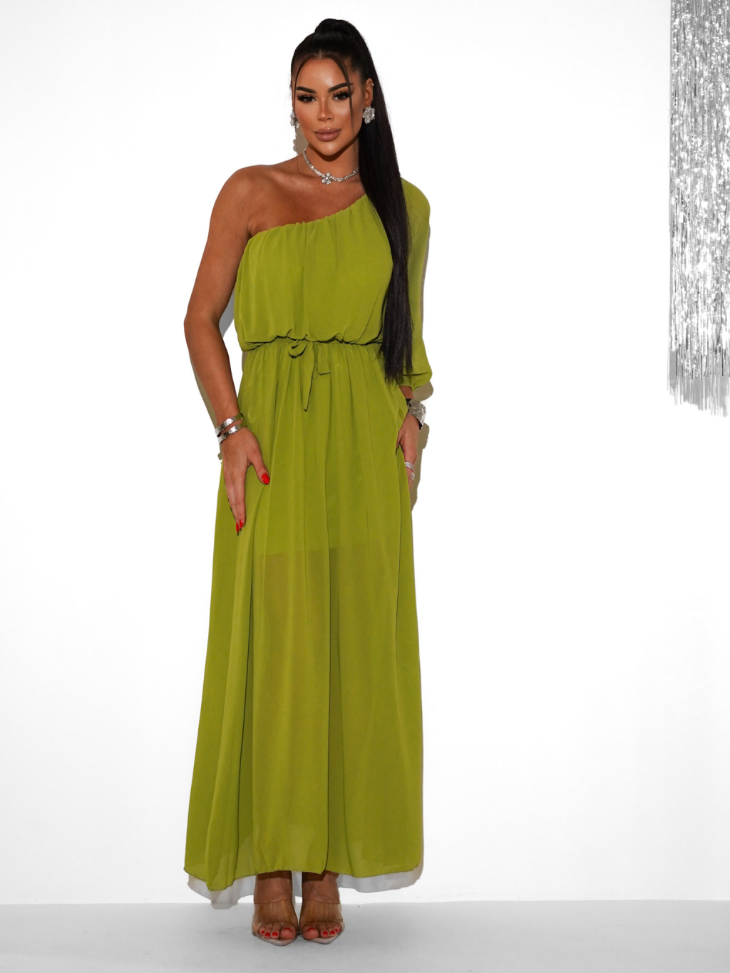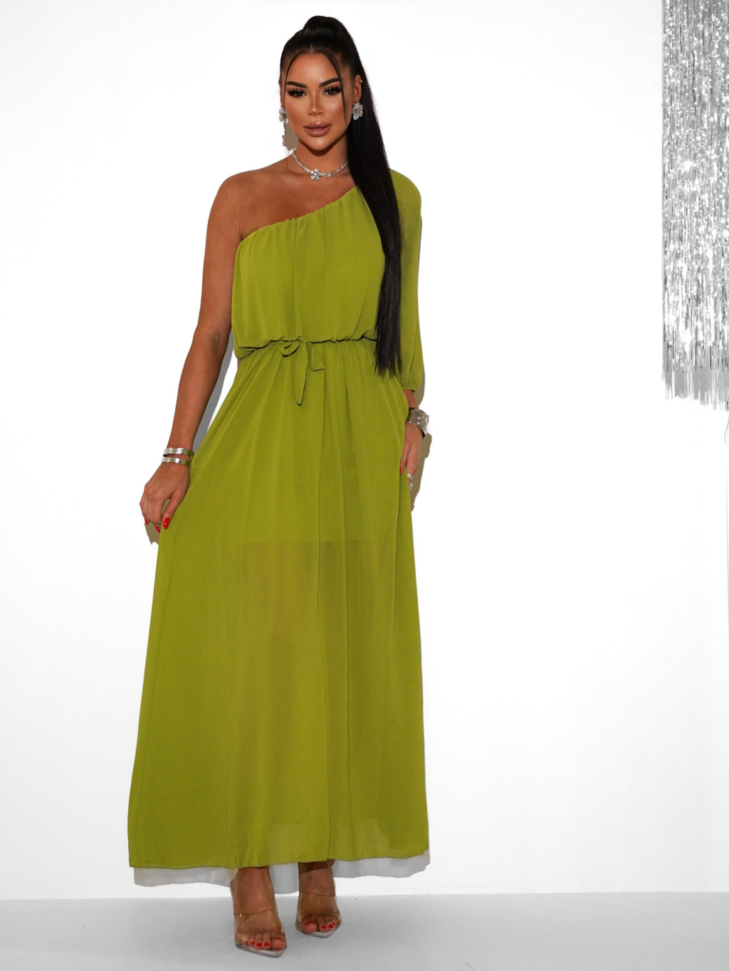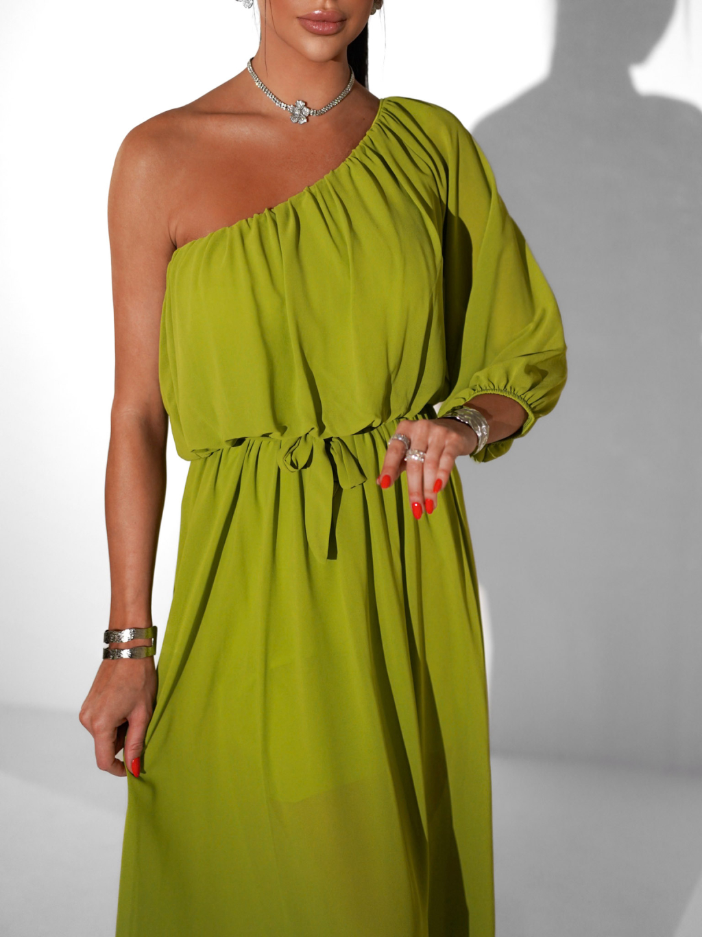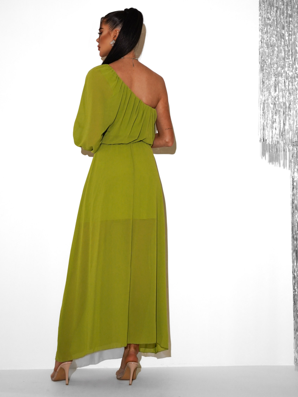 Olivové dlouhé asymetrické šaty NAVEL na jedno rameno