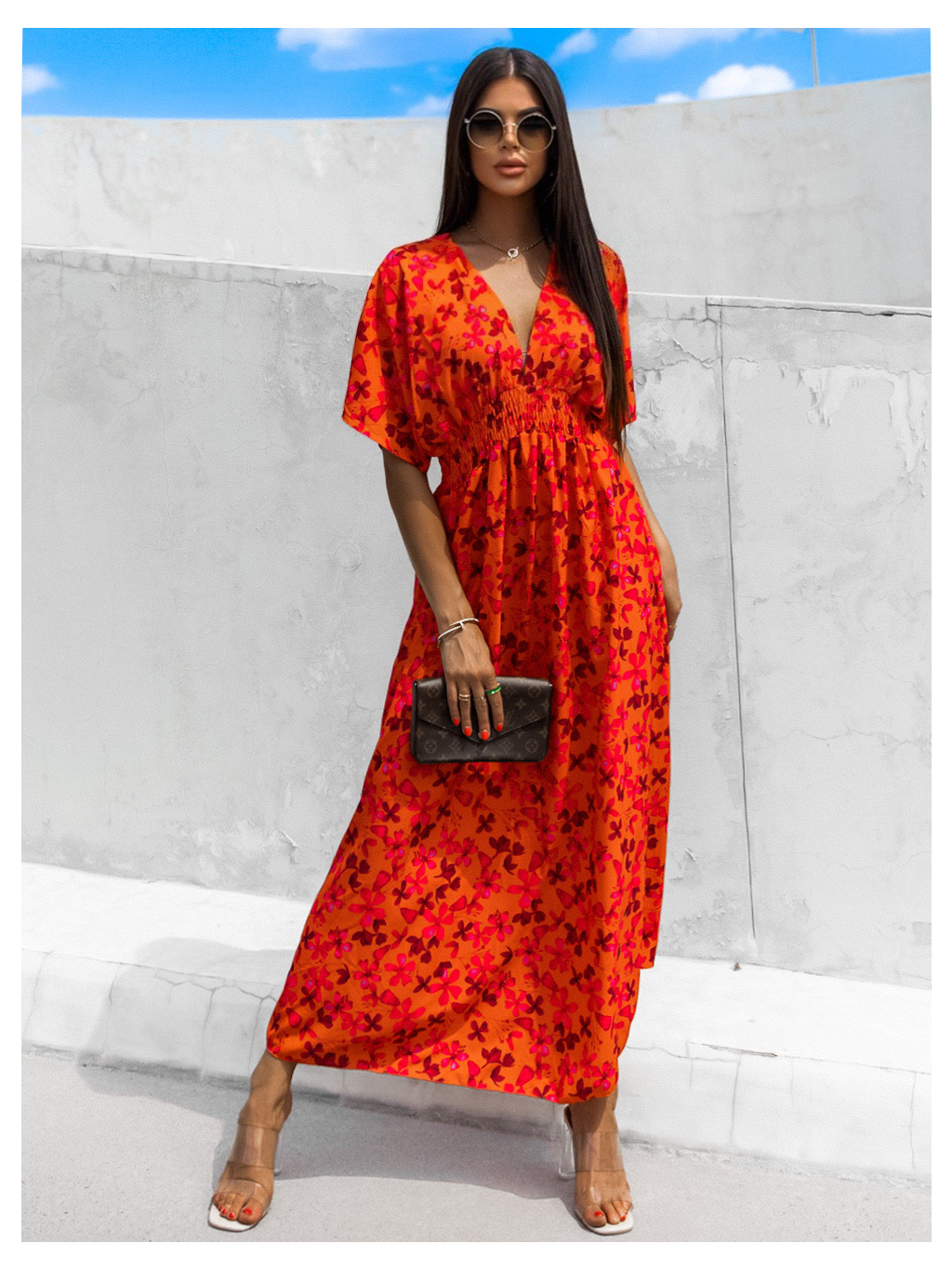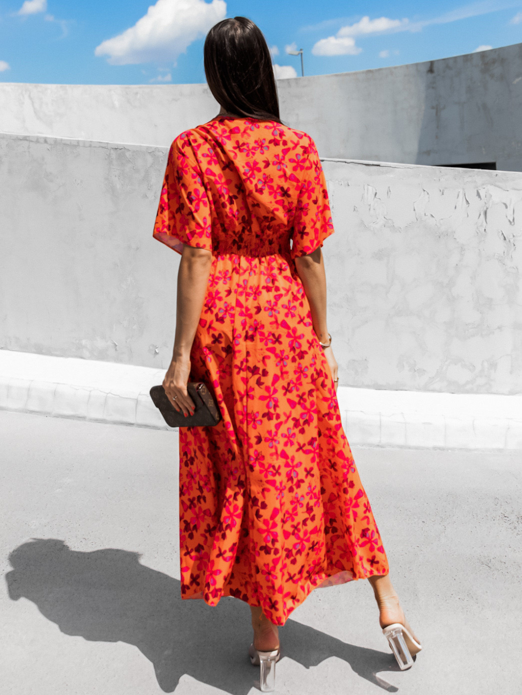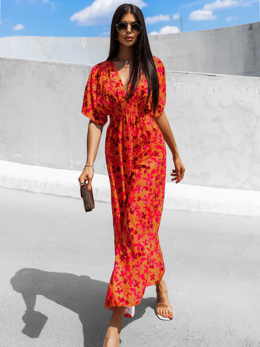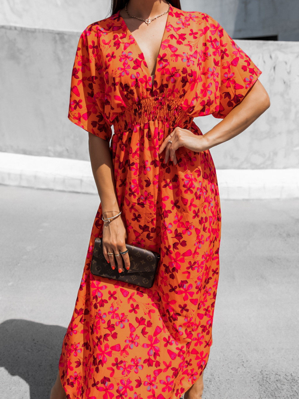 Oranžové květované šaty MILLEY s výstřihem do V