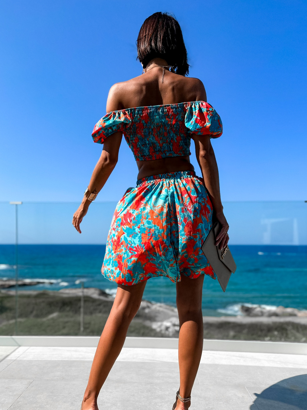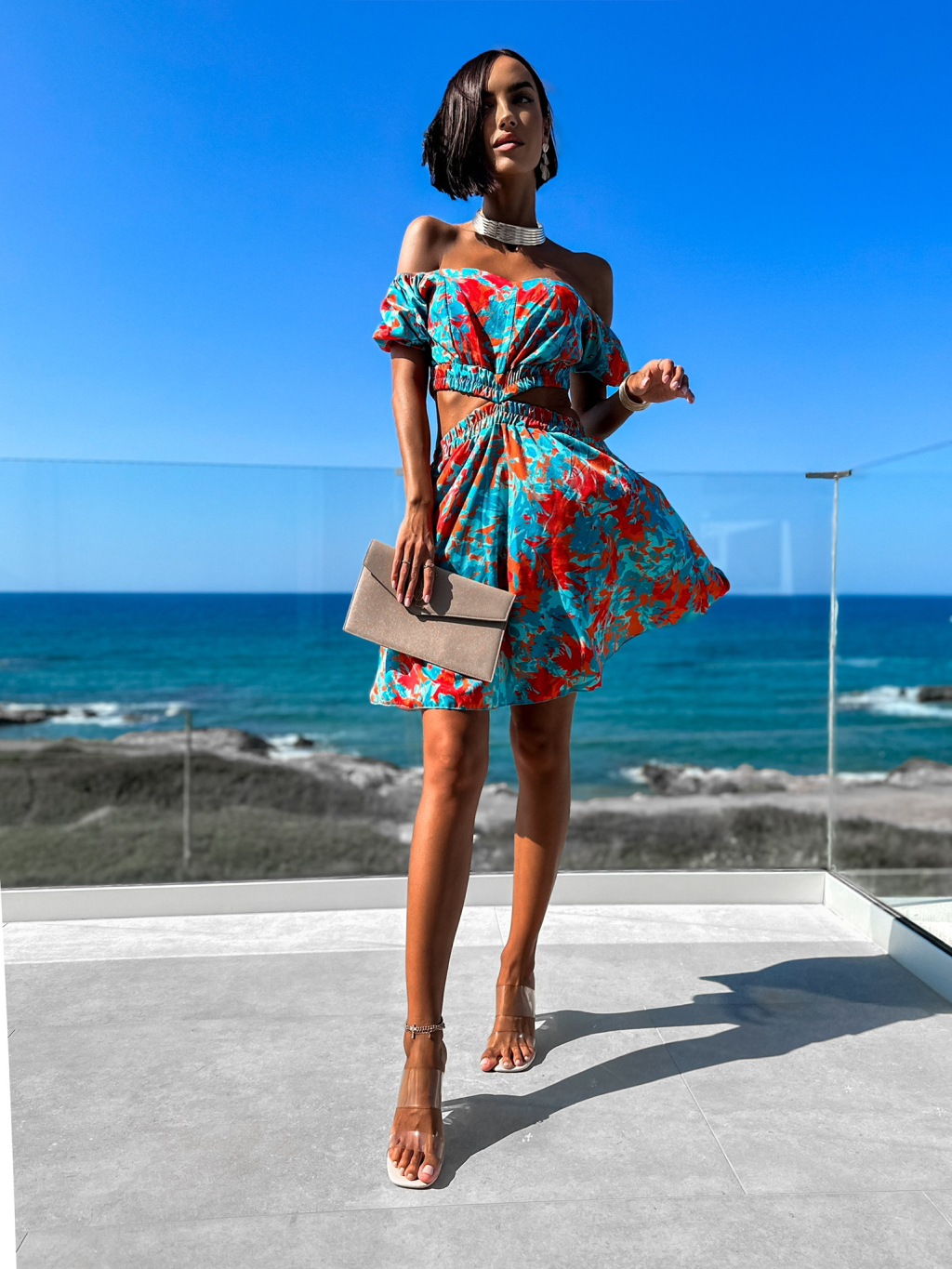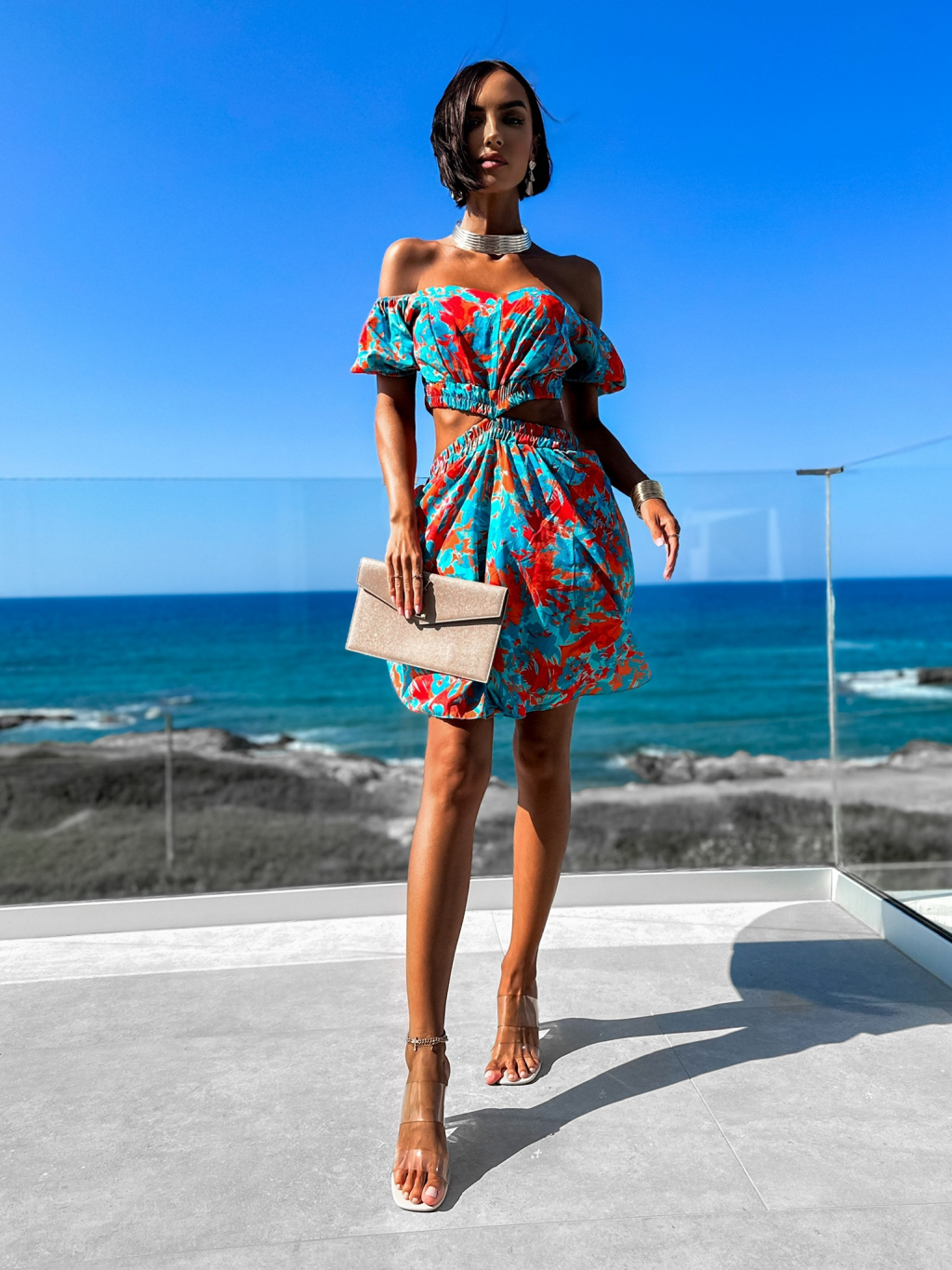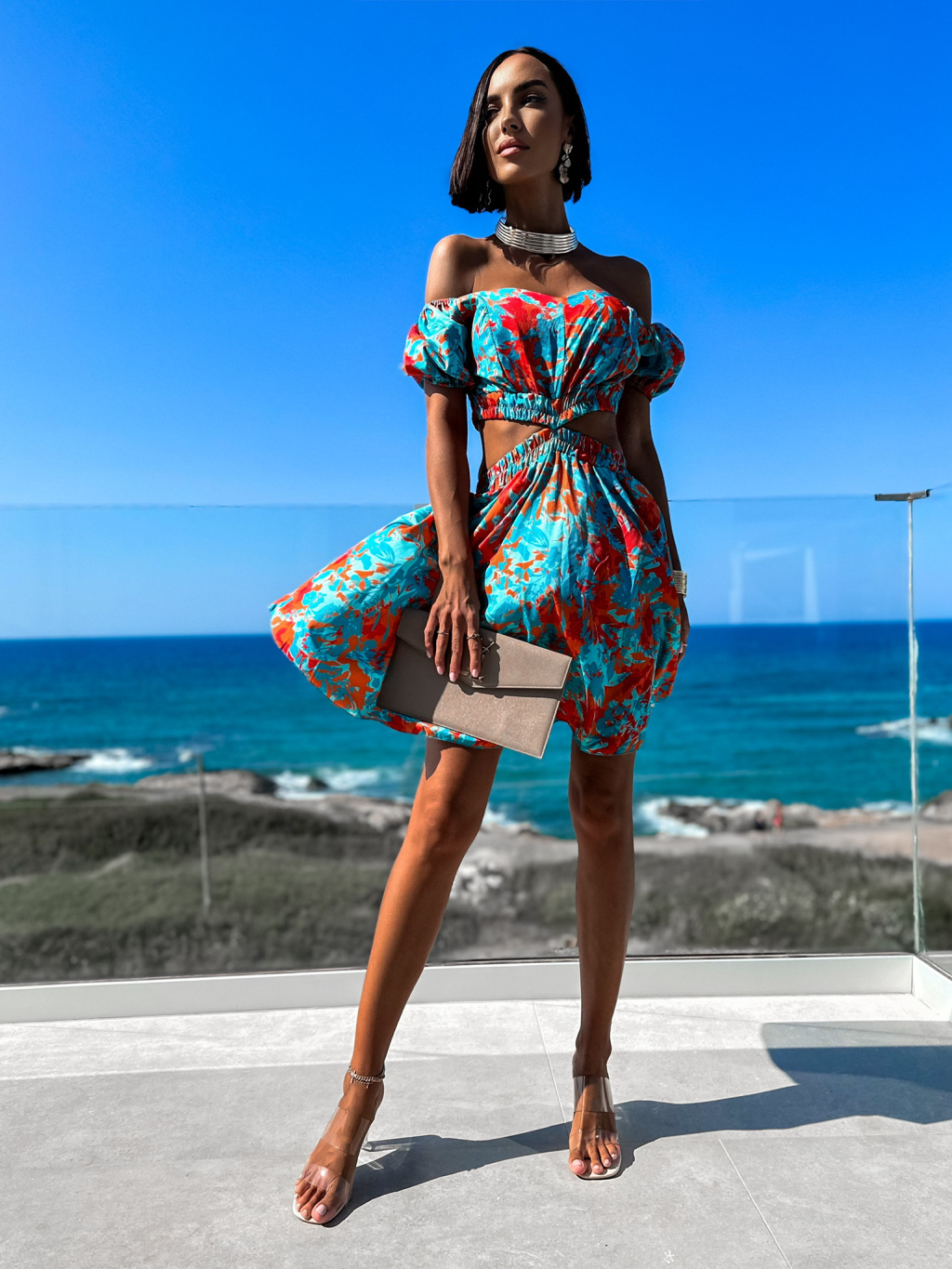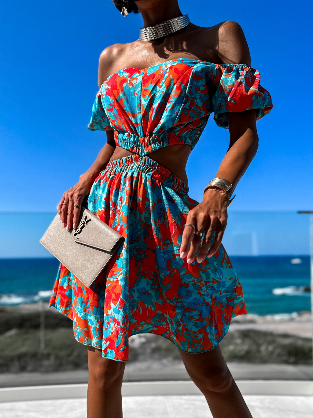 Oranžovo tyrkysové elegantní šaty FISTOL s průstřihy