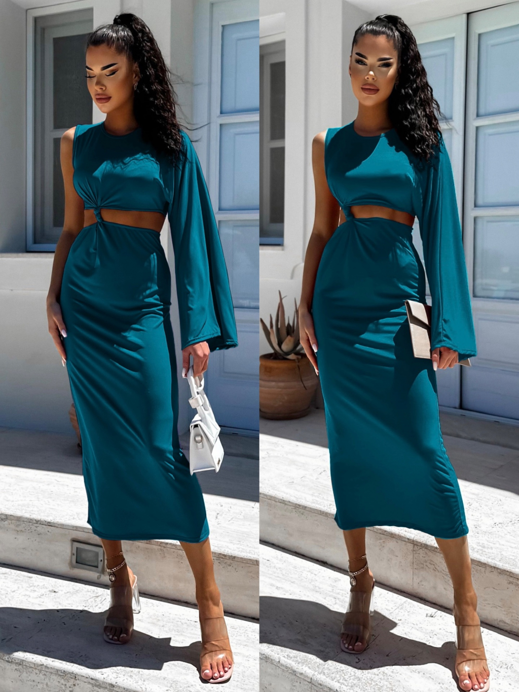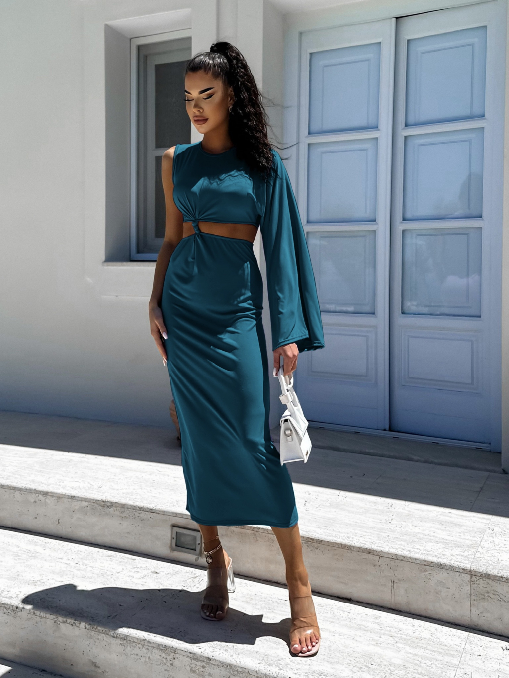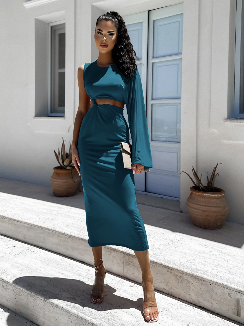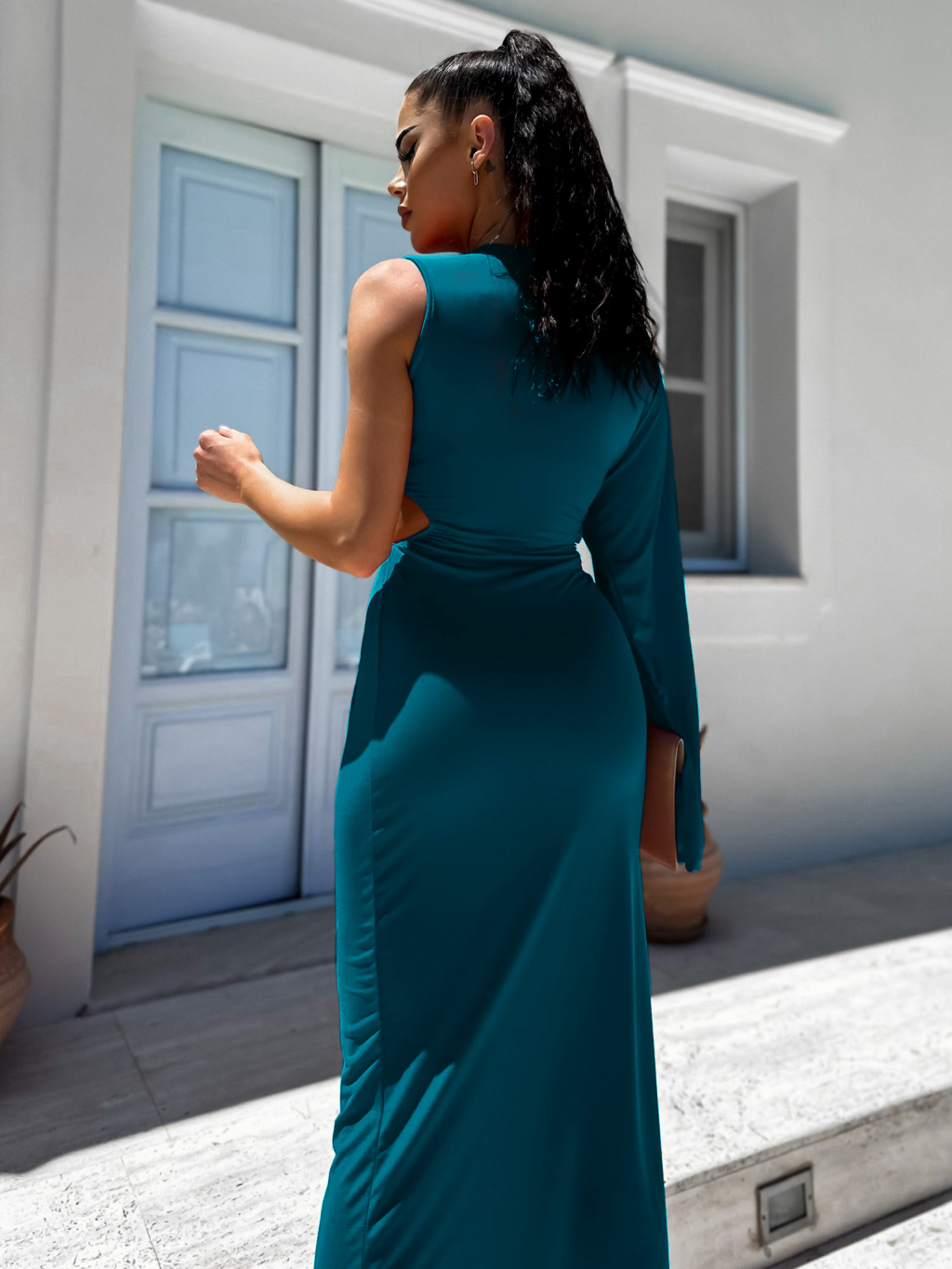 Petrolejové dlouhé elegantní šaty NONIENY s průstřihem