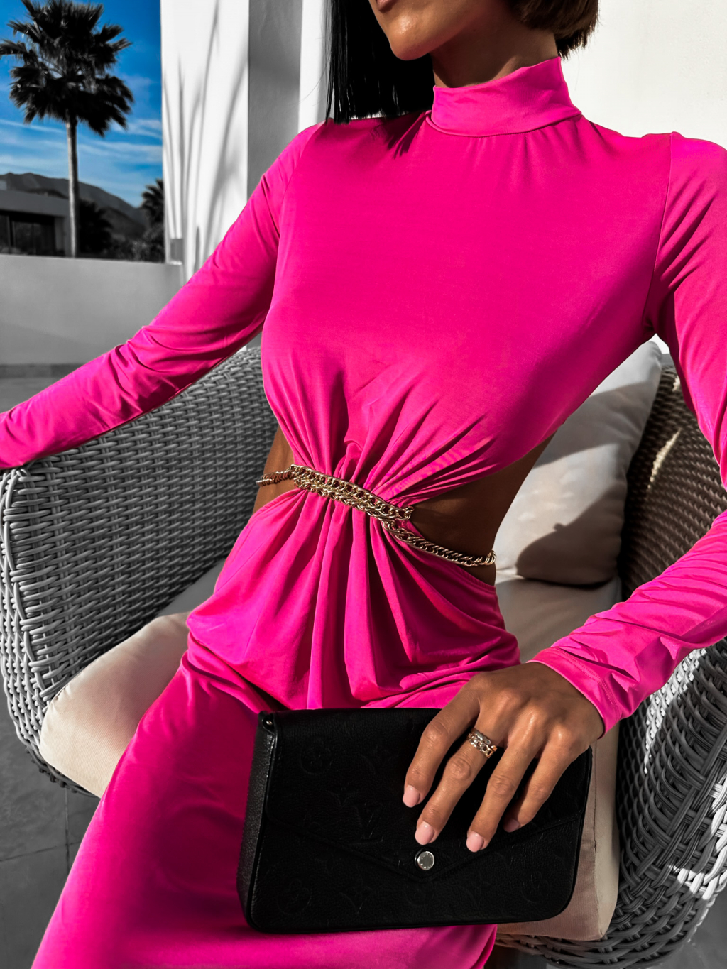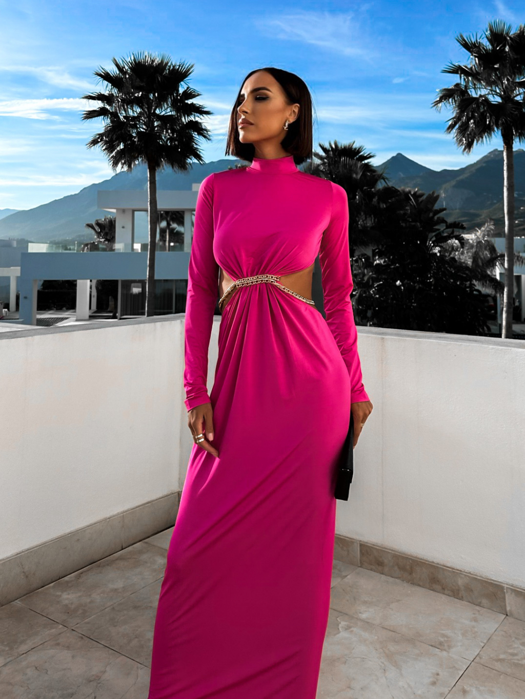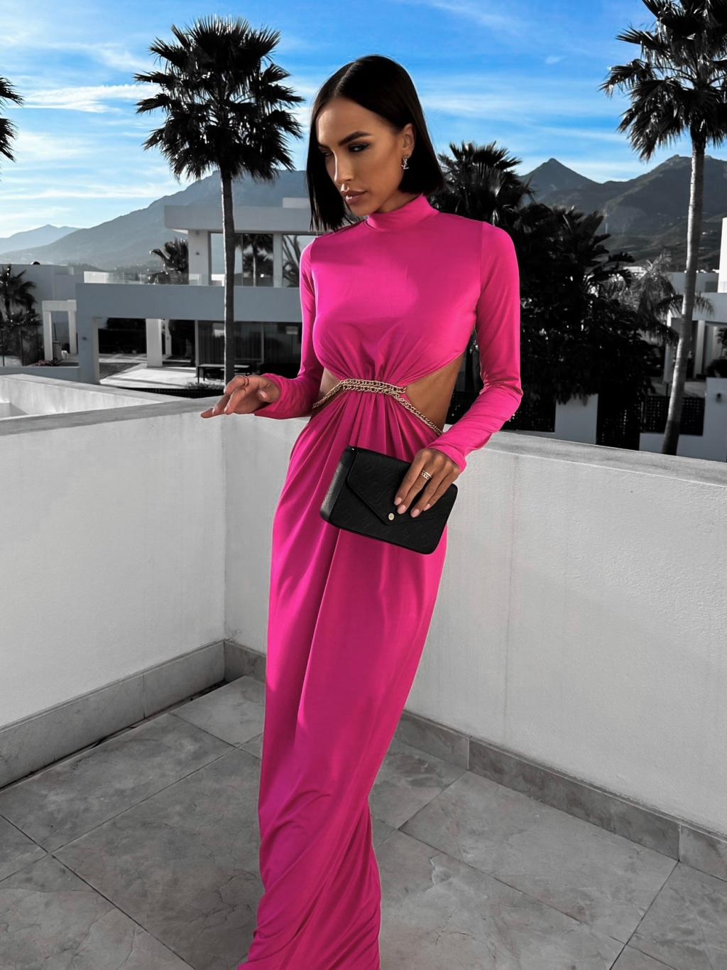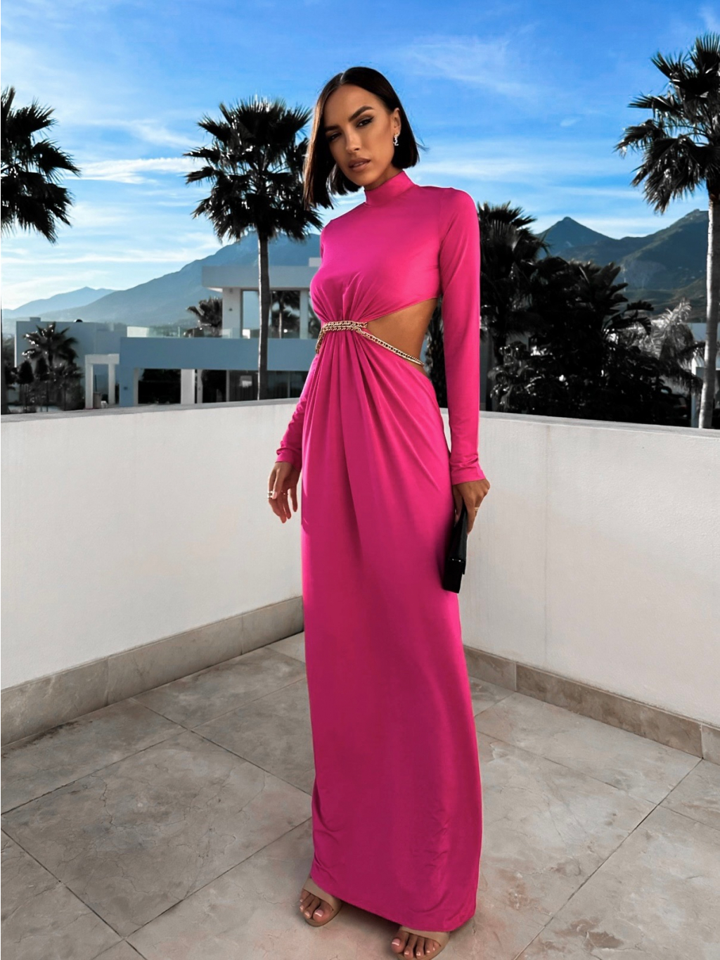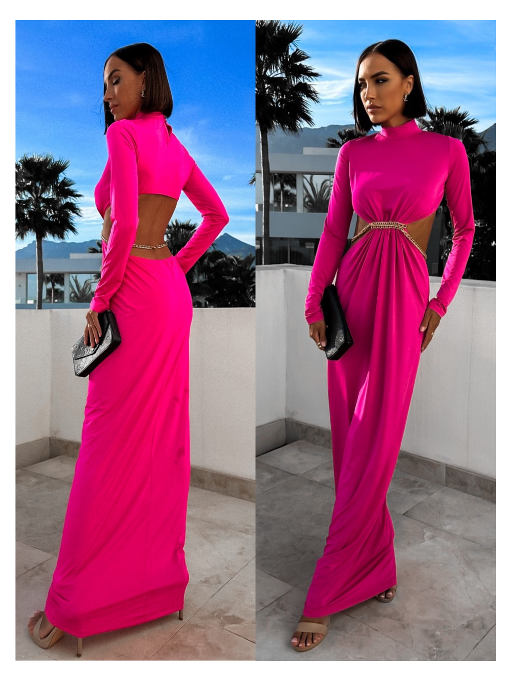 Růžové dlouhé elegantní šaty HEPHIO se zlatým detailem
