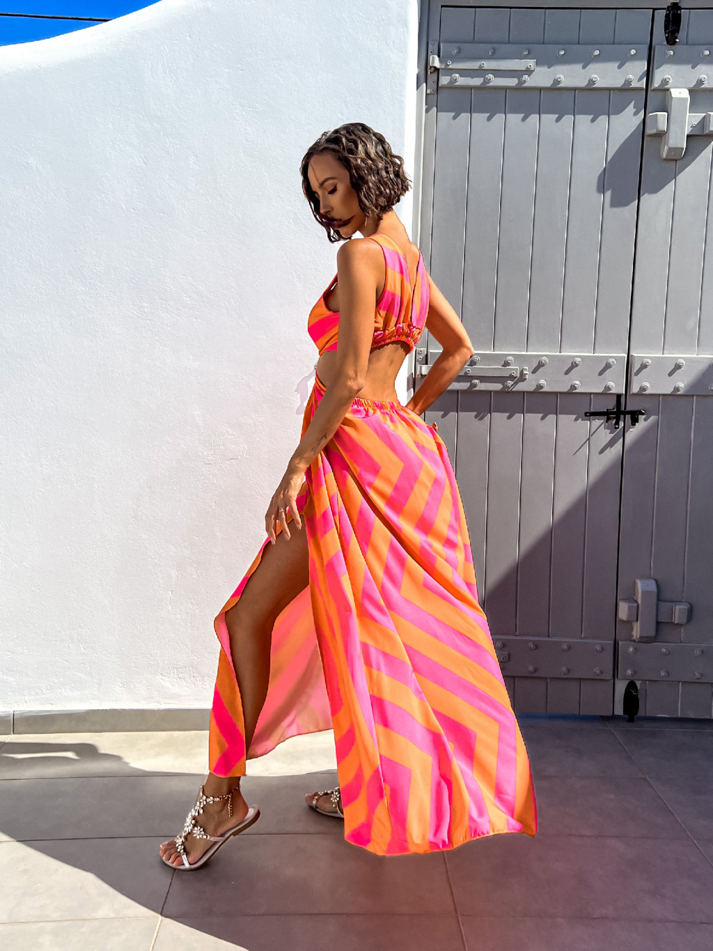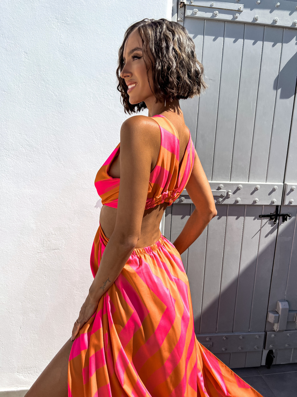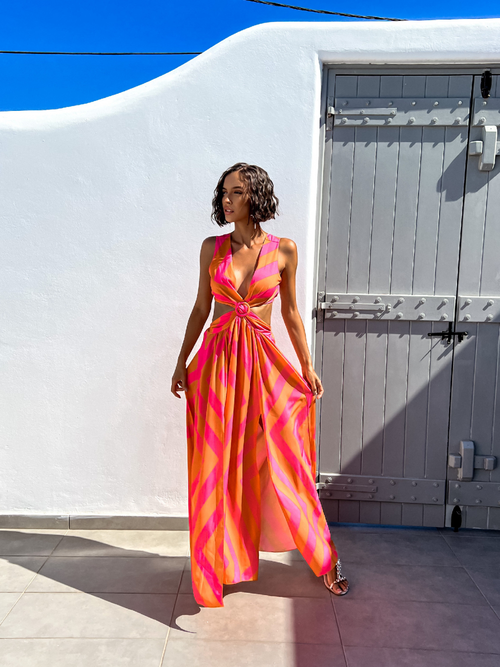 Růžovo oranžové elegantní šaty LOTUIS s rozparkem