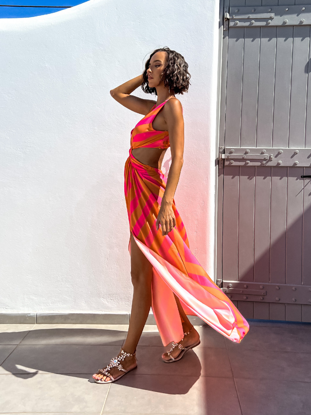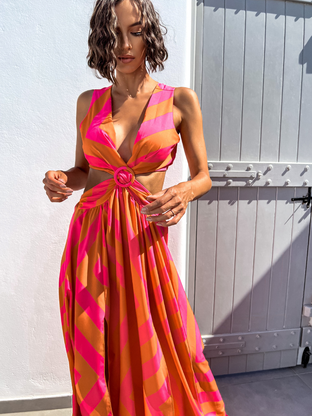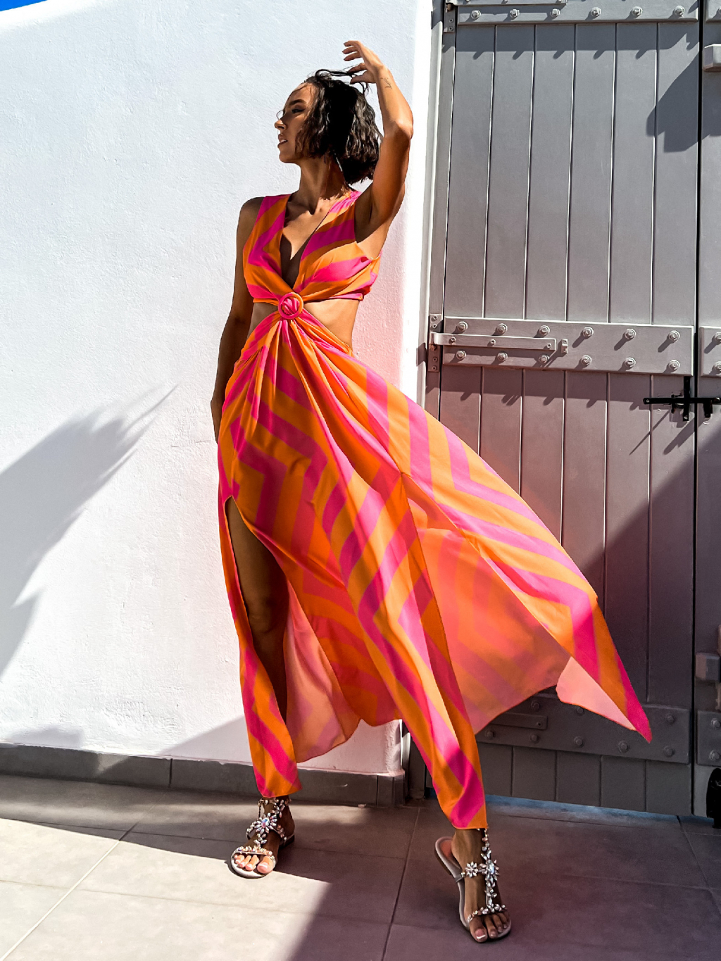 Růžovo oranžové elegantní šaty LOTUIS s rozparkem