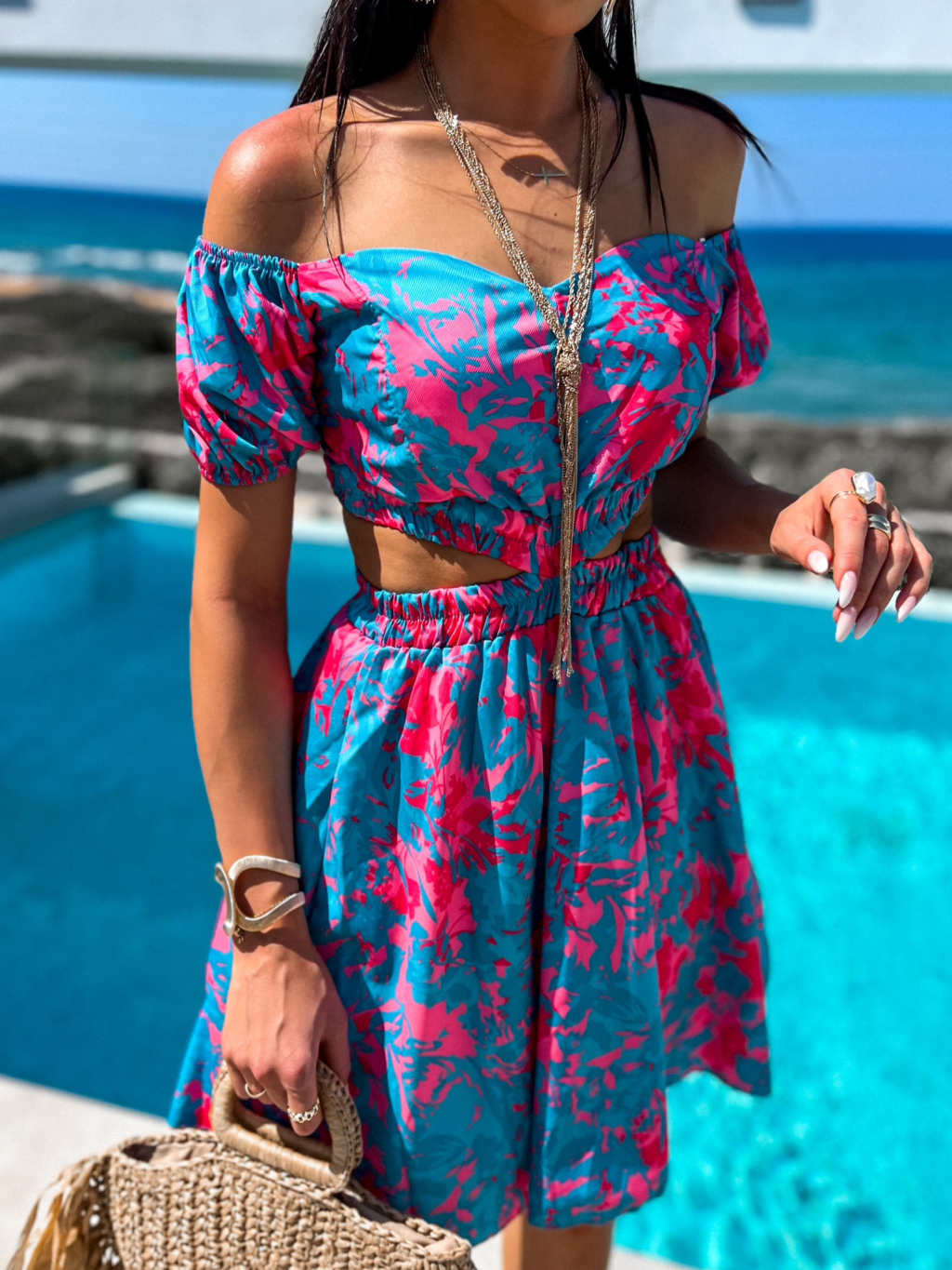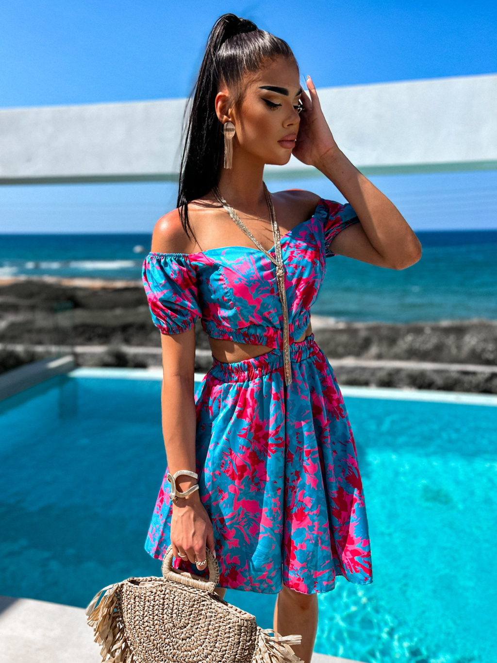 Růžovo tyrkysové elegantní šaty FISTOL s průstřihy