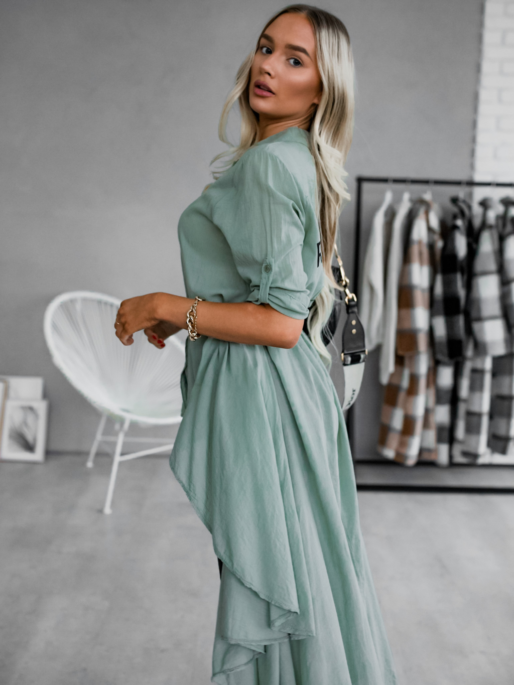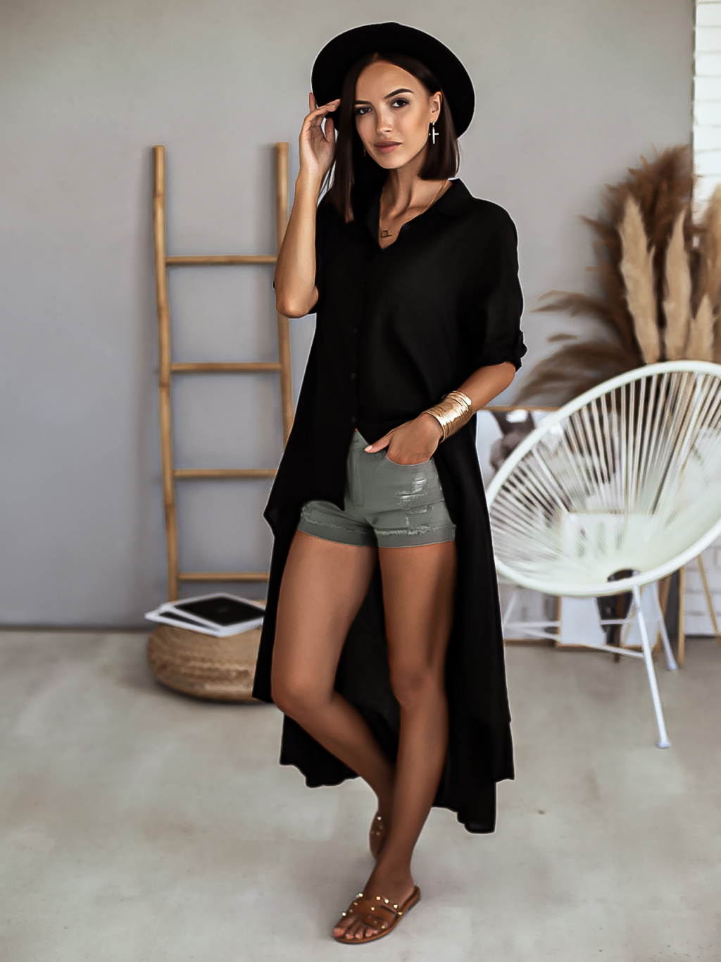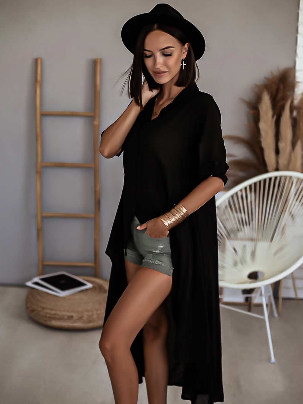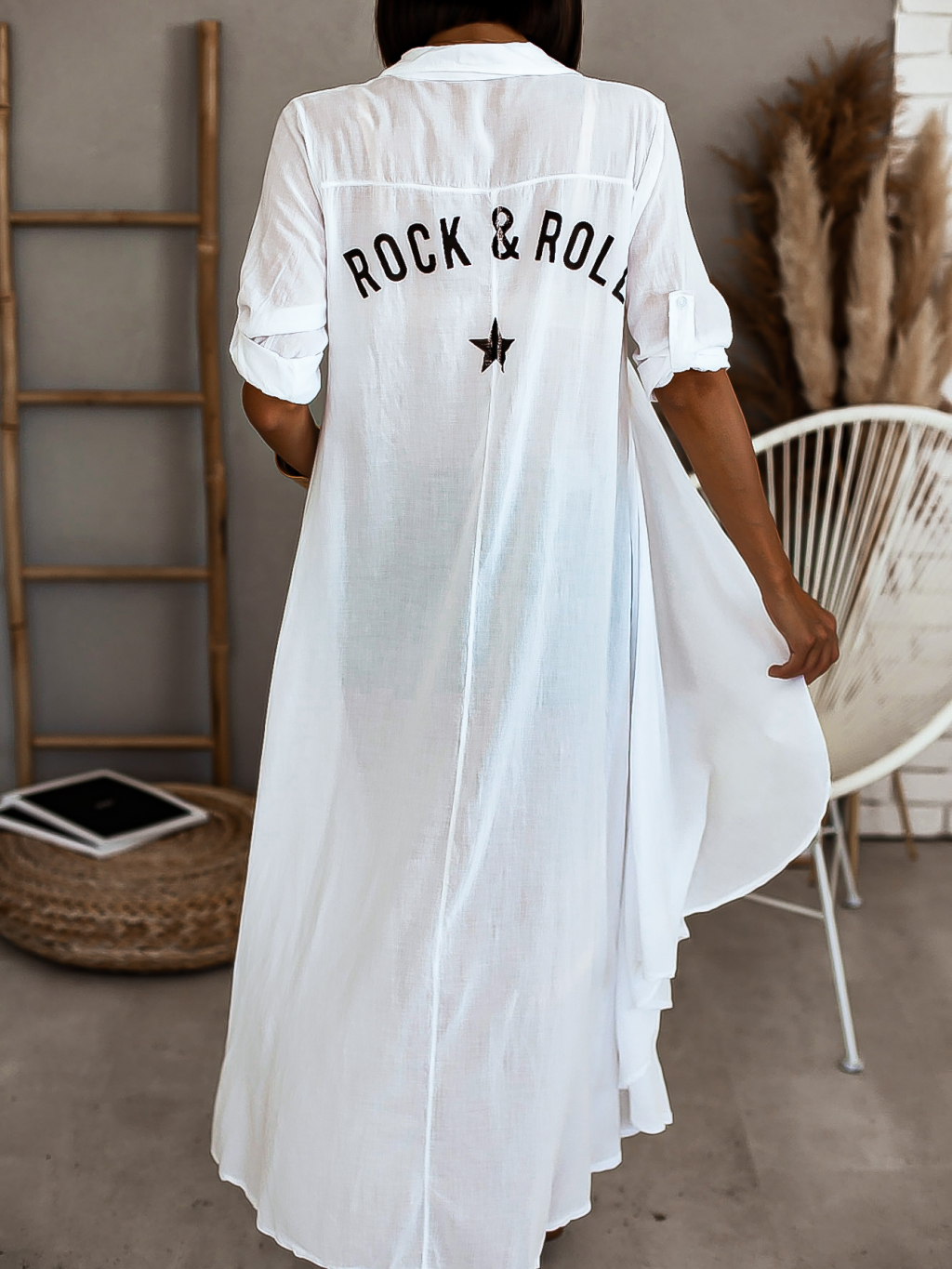 Šaty/košile Rock je vyrobena z příjemného materiálu. Šaty mají 3/4 rukáv a u krku jsou řešeny límečkem. Zadní část šatů sahá do půlky lýtek a přední část je do pasu. Na zádech mají šaty nápis. Jedná se lehce kombinovatelný kousek, který oživí Váš outfit. Díky strečovému materiálu se dokonale přizpůsobí Vaší postavě.