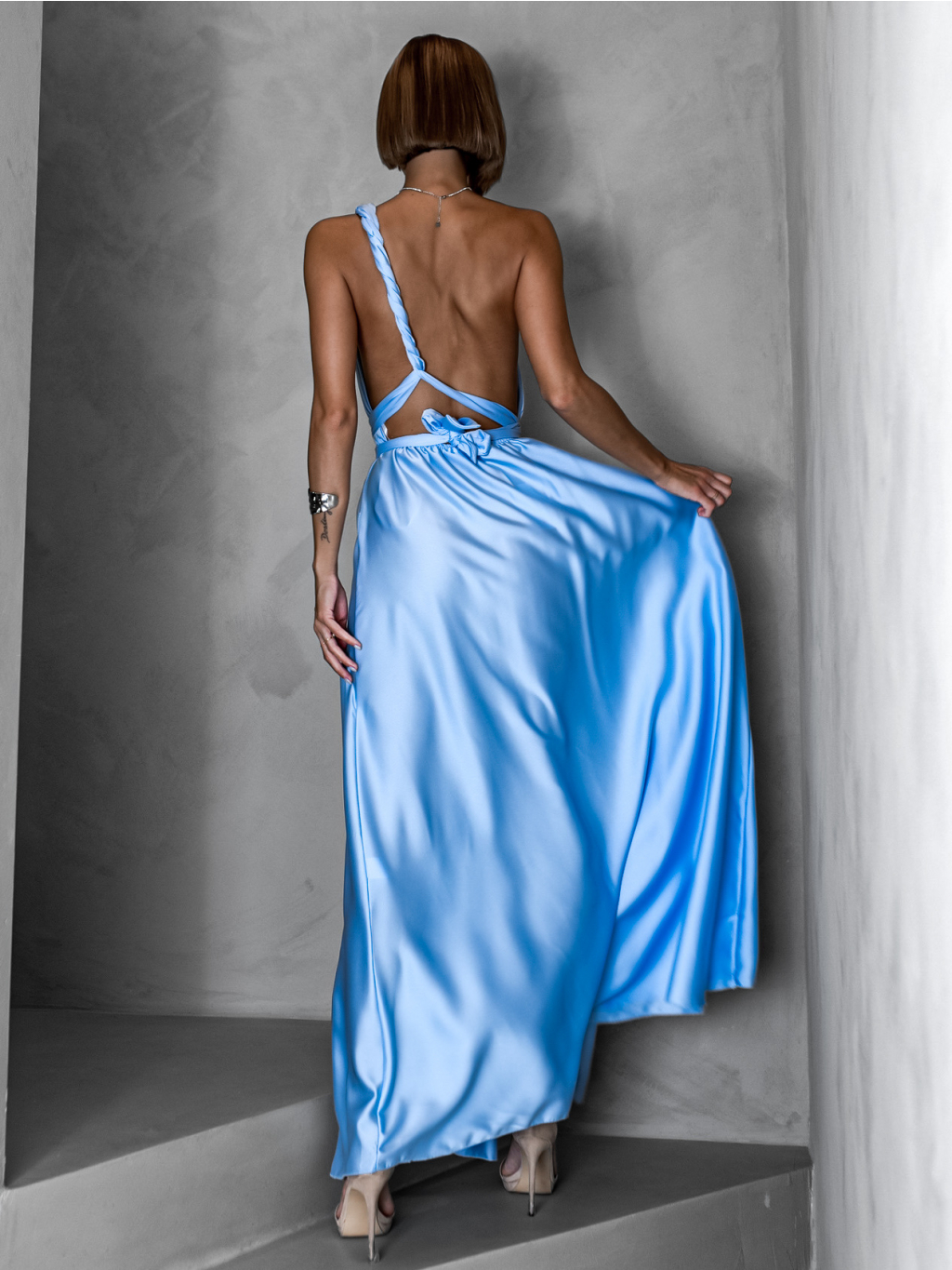 Světle modré saténové šaty VALERDI s variabilním vázáním a rozparkem