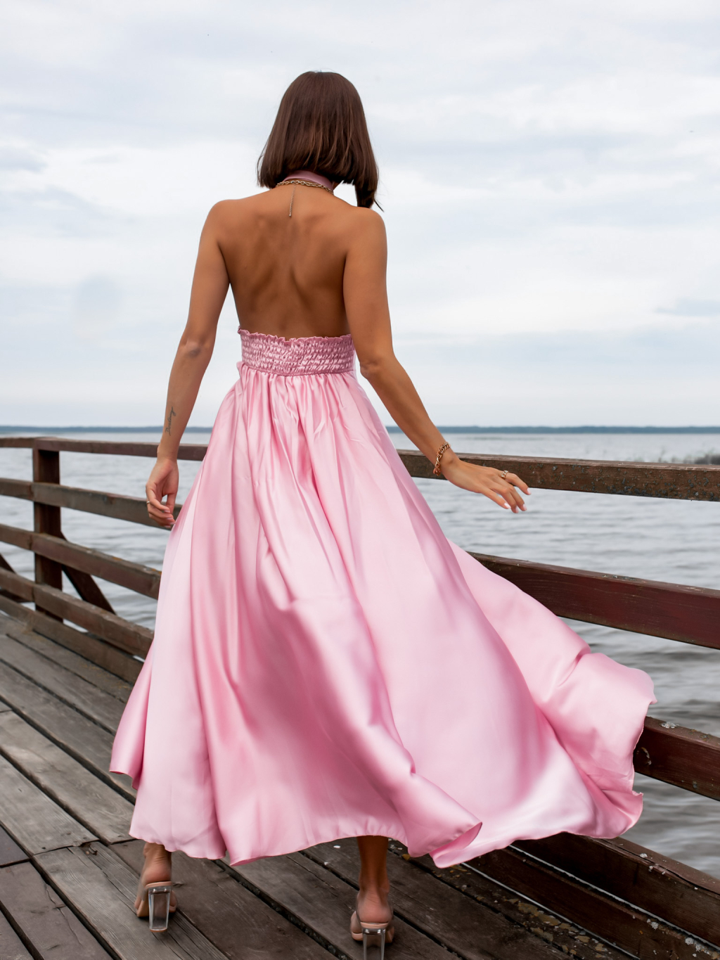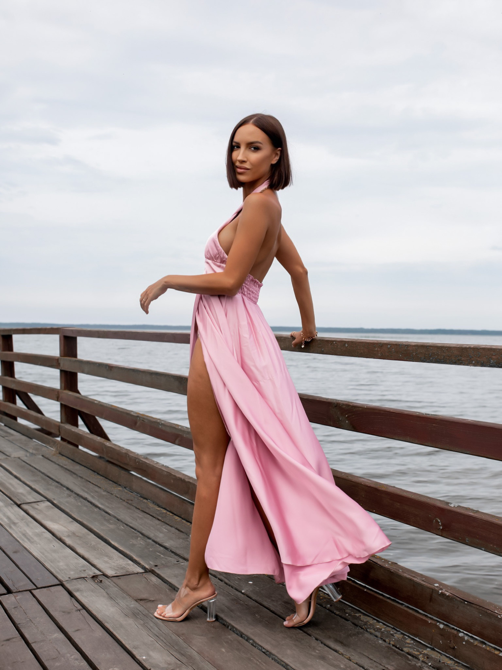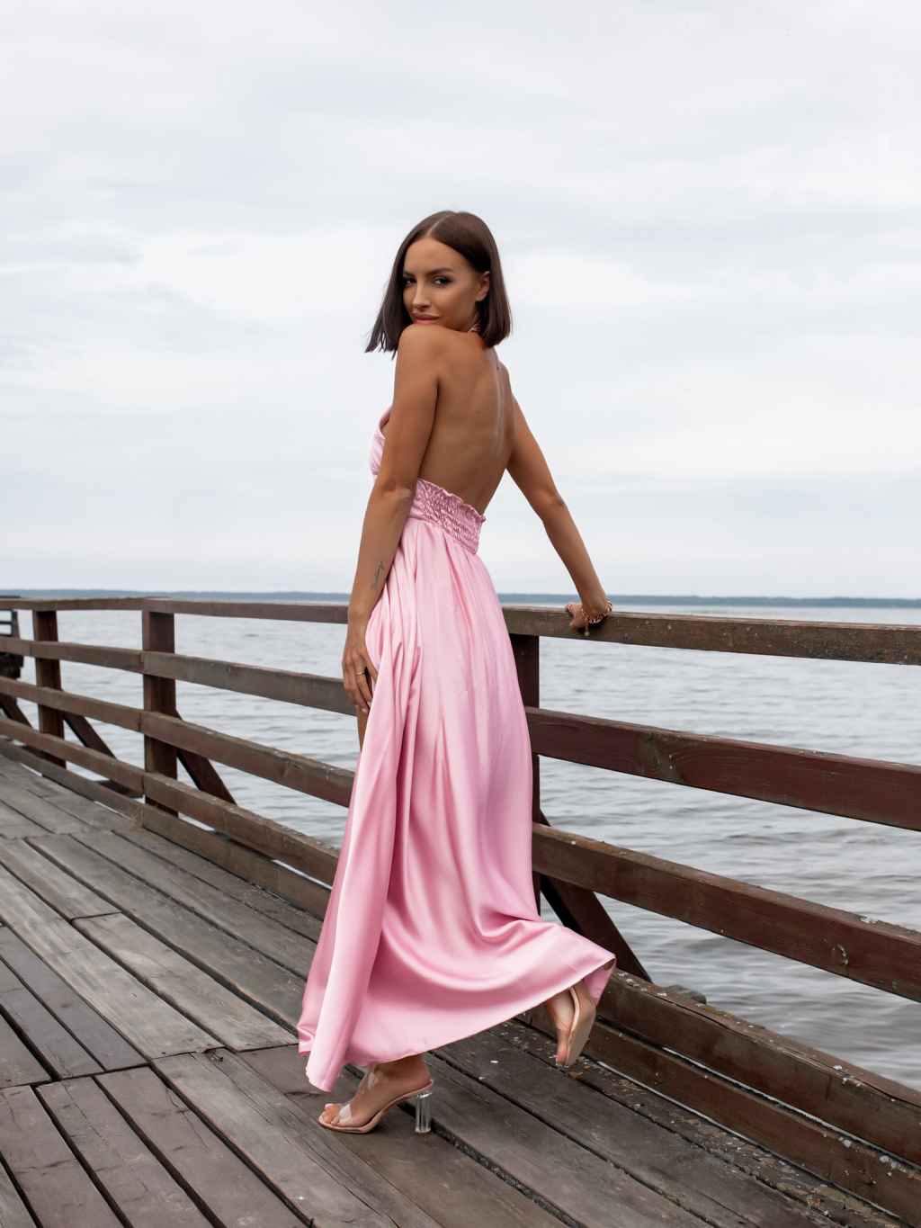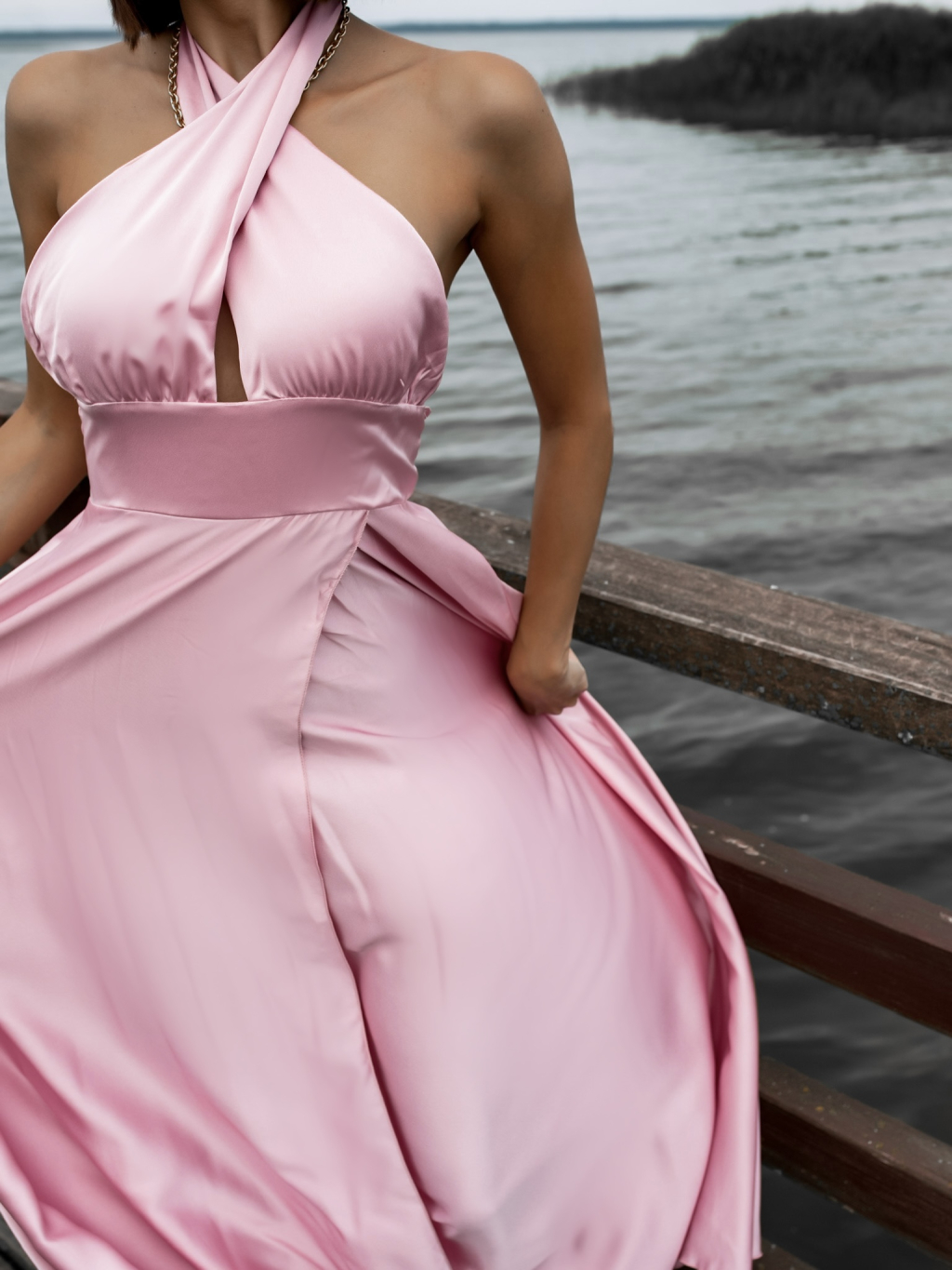 Starorůžové dlouhé lesklé šaty THERESA s rozparkem