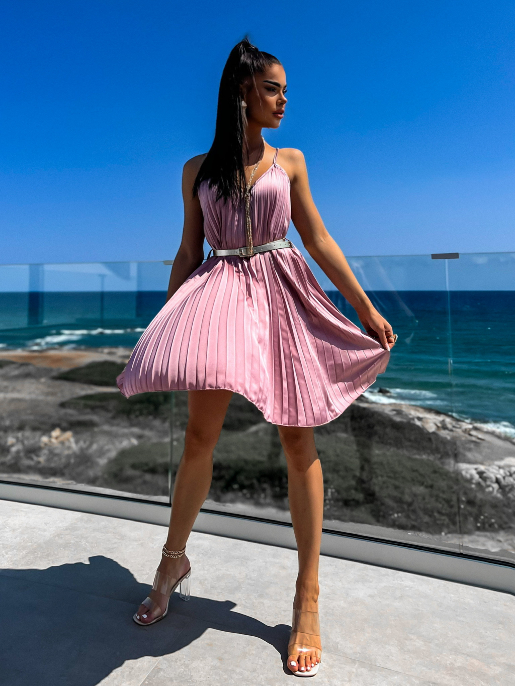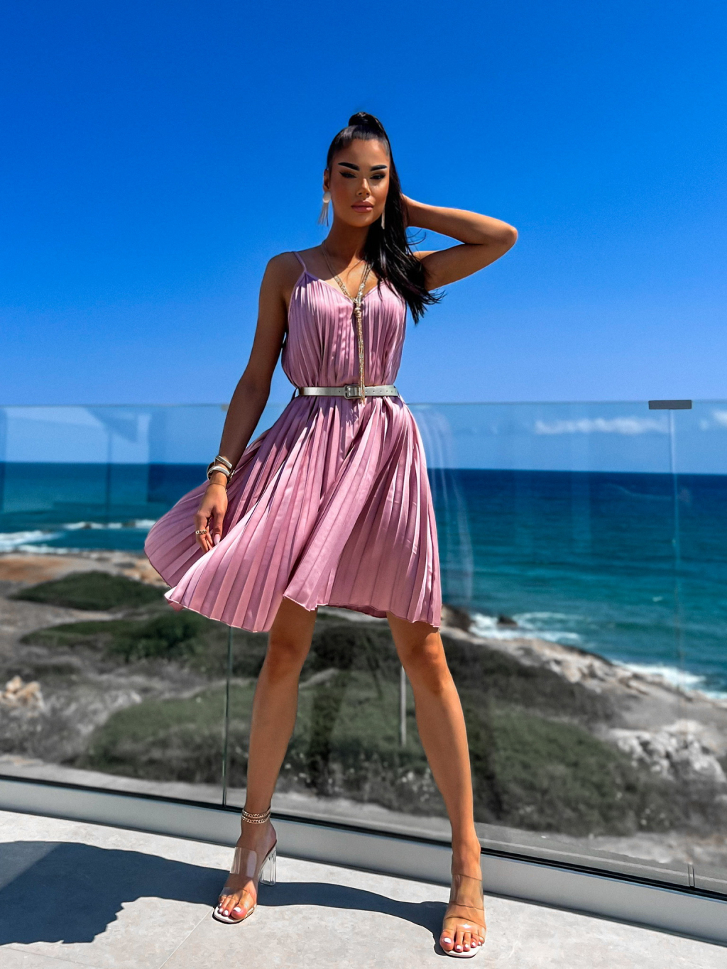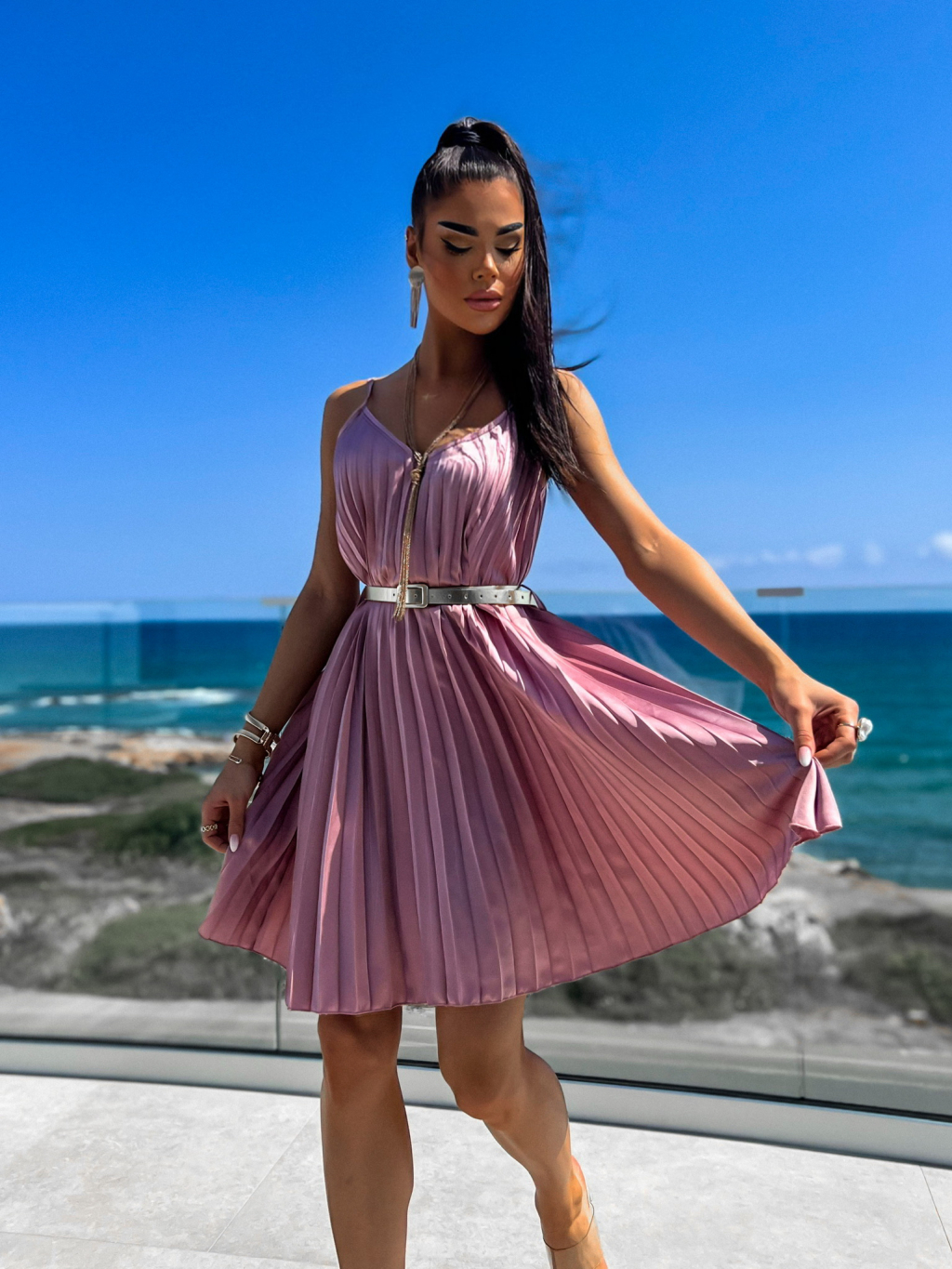 Starorůžové lesklé plisované šaty CLAURA se zlatým páskem