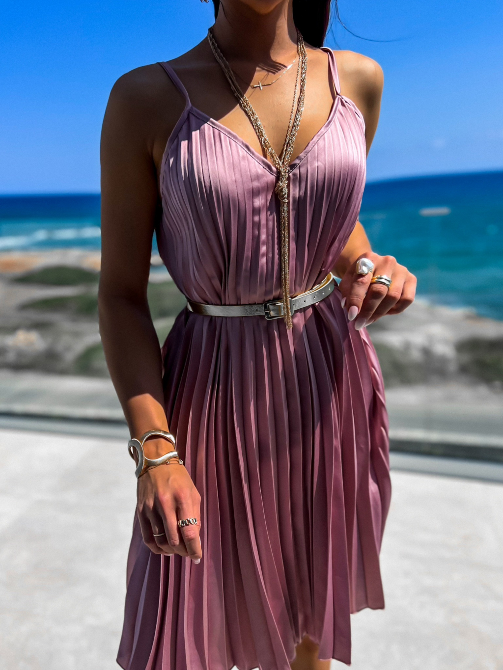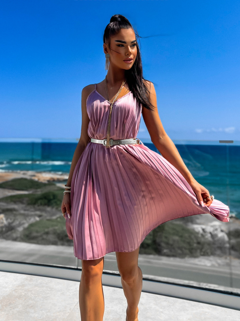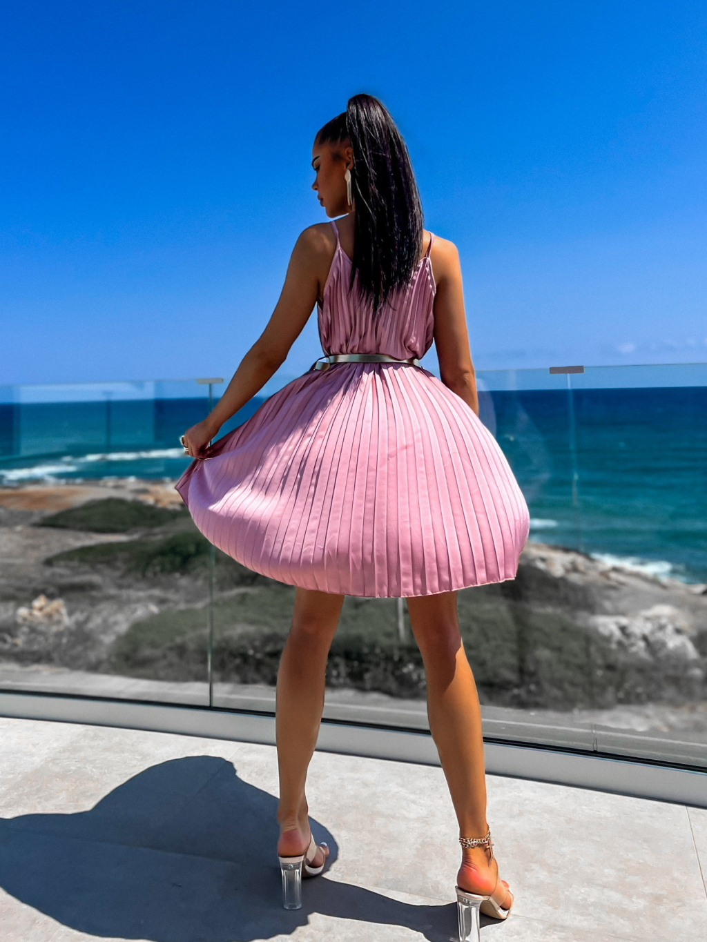 Starorůžové lesklé plisované šaty CLAURA se zlatým páskem